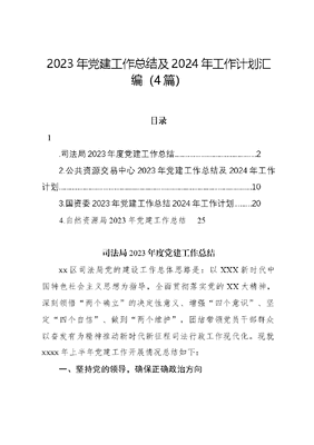 2023年党建工作总结及2024年工作计划汇编(4篇)目录1.司法局2023年度党建工作总结..22.公共资源交易中心2023年党建工作总结及2024年工作计划..103.国资委2023年党建工作总结2024年工作计划204.自然资源局2023年党建工作总结25司法局2023年度党建工作总结xx区司法局党的建设工作总体思路是:以XXX新时代中国特色社会主义思想为指导,全面贯彻落实党的XX大精神,深刻领悟两个确立的决定性意义、增强四个意识、坚定四个自信、做到两个维护,团结带领党员干部群众以奋发有为精神推动新时代新征程司法行政工作现代化。现就xxxx年上半年党建工作开展情况总结如下:一、坚持党的领导,确保正确政治方向(一)坚持用党的创新理论武装头脑、指导实践一是始终坚持以XXX新时代中国特色社会主义思想为指导,学习贯彻党的XX大精神,深入学习XXX法治思想,用理论武装头脑,推动党员干部深刻领悟两个确立的决定性意义,增强四个意识,坚定四个自信,做到两个维护。以中心组学习、支部集中学习、三会一课等多种学习形式开展政治理论学习xx次,开展政治轮训x次,专题党课x次,专题研讨x次,理论知识测试x次。二是党的XX大召开以来,采取多种形式全面系统的学习党的XX大报告中提出的新观点、新思想、新理念。一是提高站位自觉学,全体党员干部坚持学原文、悟原理,原原本本的学习党的XX大报告;二是领导带头专题学,开展学习贯彻XXX法治思想和党的XX大精神专题学习周,全体党员干部全面、深入、系统的学习党的XX大精神,切实把党的XX大精神转化为新时期司法行政工作高质量发展的生动实践;三是全体动员讨论学,以党小组为单位,边学习边讨论,交流学习感悟,促进将学习成果转化为工作实践;四是线上线下延伸学,线上开设五期《党的XX大知识测试》问卷考试,以巩固学习成果,确保将党的XX大精神做到学深学透、入脑入心。开展党的XX大精神专题学习xx次,专题党课x次,研讨交流x场次,理论测试x次,撰写学习心得xx篇。(二)统一思想意志,扎实开展主题教育按照区委部署要求,扎实开展学习贯彻XXX新时代中国特色社会主义思想主题教育,以XXX新时代中国特色社会主义思想为指导,深刻领悟两个确立的决定性意义、增强四个意识、坚定四个自信、做到两个维护,始终在思想上政治上行动上同以XXX同志为核心的党中央保持高度一致。一是通过中心组学习、党员学习、政治轮训、线上教育等多种方式学习《中国共产党章程》、《XXX新时代中国特色社会主义思想专题摘编》、《XXX著作选读》、《五大任务干部读本》以及XXXXXX对xx的重要指示批示精神,以加强党员干部思想意识上的统一;二是邀请党校老师讲授XXX新时代中国特色社会主义思想专题党课,确保党员干部领会精神实质、把握核心要义,更好地落实实践要求;三是以学思想、强党性、重实践、建新功为主题开展交流研讨,切实把XXX新时代中国特色社会主义思想转化为坚定理想、锤炼党性、指导实践、推动工作的强大动力;四是将检视整改贯穿始终,领导班子围绕执行上级组织决定、严格组织生活、加强党员教育管理监督、联系服务群众、抓好自身建设等方面进行检视分析,找准查实问题短板。党员对照XXX新时代中国特色社会主义思想,对照党章党规党纪,对照群众提出的意见建议,从政治觉悟、党员意识、为民服务、遵规守纪、道德操守、作用发挥等方面进行党性分析,深入查找自身存在的差距和不足。班子查摆问题xx个,征求意见x条,制定措施xx项,建章立制。二、提升政治责任感,落实全方位建设模范自治区的决定XXXXXX在xx考察时强调,铸牢中华民族共同体意识是新时代党的民族工作的主线,也是民族地区各项工作的主线。我们将发挥司法行政扎根基层、贴近群众的职能优势,与加强和改进民族工作深入融合。全方位建设模范自治区的决定下发以来,我局以理论学习中心组学习、党支部集中学习等形式组织全体党员干部学习《xx自治区党委关于全方位建设模范自治区的决定》,召开党组会议研究部署落实此项工作。形式多样开展加强民族团结理论学习。一是中心组深入学习XXXXXX关于加强和改进民族工作的重要思想,学习XXXXXX关于铸牢中华民族共同体意识的重要论述,专题学习XXX在考察xx巴彦淖尔市时讲话精神;二是组织全体党员干部学习《xx自治区促进民族团结进步条例》、《中国共产党统一战线工作条例》;三是开展