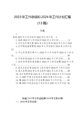 2023年工作总结和2024年工作计划汇编(13篇)目录1.街道2023年工作总结和2024年工作计划22.街道2023年工作总结和2024年工作计划93.区生态环境分局2023年工作总结和2024年工作计划194.区市场监督管理局2023年工作总结及2024年工作计划325.市公共资源交易中心2023年工作总结和2024年工作计划..366.市民政局2023年工作总结和2024年工作计划.497.县财政局国资委金融办2023年工作总结暨2024年工作计划568.县农业农村局2023年工作总结和2024年工作计划659.县水务局2023年工作总结和2024年工作计划.6910.县应急管理局2023年工作总结及2024年工作计划7611.乡2023年度工作总结和2024年度工作计划..8312.镇2023年水利工作总结暨2024年工作计划..8713.镇2023年依法治县工作总结及2024年工作计划.92街道2023年工作总结和2024年工作计划一、2023年工作总结今年以来,街道上下深入学习贯彻党的XX大精神,认真落实区委三比三拼三焕新行动要求,不折不扣整改巡视巡察反馈问题,严密组织开展护航亚运行动,经济运行总体企稳向好,社会大局总体平安稳定,党建引领基层治理和共同富裕取得较好成效。(一)抓经济强发展。主要经济指标企稳回升,1-9月,XX街道实现地区生产总值XX亿元,财政总收入X亿元,一般公共预算收入X亿元。一是抓好谋划。聚焦三个一号工程,谋划推动环XX产业经济带布局,优化产业结构。制定出台《XX街道优商招商专项行动实施方案》,利用商会、乡贤理事会等平台载体,拓展招商选资渠道。结合XX特色,除抓好传统商贸服务业外,布局小而美的文化、文旅、餐饮等中小企业,进一步做大底盘。至9月底累计引进企业265家,注册资金X亿元,大市外内资X亿元,浙商回归资金X亿元。二是抓好服务。完善班子成员联企制度、重点楼宇包联等,开展助企纾困、走访调研春风行动,帮助企业解决实际困难60余个,推动XX盛园等部分区域逐步实行外摆经营,联合区税务局打造全市首个枫桥式税务站点,优化营商环境。三是抓好数据。坚持谋划从早、推动从紧、落实从严原则推动五经普工作,组建由第三方专业队伍+社区网格员+街道精干力量为主的普查队伍,形成全街道共同参与的良好局面,相关工作获得市区两级统计部门认可。(二)抓项目促整治。一是服务保障市级重点区块建设。重点保障XX西区二期、天一阁南馆建设重点项目,如期完成房屋签约及后续的房屋拆迁、土地平整等。围绕罗城复兴、都市文博区建设等主动融入,谋划城市有机更新和未来社区建设项目。重点关注第一医院周边资源整合提升、升阳泰大楼外立面改造等项目,力争街区空间焕新、品质提升。二是开展环境治理行动。以文明城市创建为契机开展常态化整治,针对镇明菜场周边背街小巷,持续开展日扫夜洗清洁清爽行动。开展水域环境专项行动,以河长责任制为抓手,加强水体巡查、掌握水质变化、督促河道保洁、取缔沿河乱象。联动景区管委会等部门,对XX水则碑附近管网进行排查整治,目前已明显改善该区域水环境。三是优化人居环境。积极回应群众关切,通过微改造补足小区硬件设施短板,结合实际推动一批甜甜圈等创意点亮社区角落项目,重点完成XX菜场周边污水管道改造、车棚飞线整治、新一轮重点路段外立面治理等民生项目,全力创建全区唯一的城市精细化管理样板区。 (三)抓民生暖民心。一是擦亮基层治理品牌。勇当统分沉改革先行者,对标宁波市唯一全国先进基层群众性自治组织迎凤社区创建标准,打造社区自治新名片。依托梅园社区七亭六地硬件设施提档升级,着力打造梅园自治风景线走廊,目前硬件主体建设已基本完成。梅园社区阿娘工坊推出了非遗中药香囊设计、制作、销售一站式服务,成立XX阳光助困共富基金,获评市级巾帼共富工坊。二是完善康养为老服务。做优阳光里康养服务综合体,推出服务跟着老人走以及周边、床边、身边触手可及的养老服务模式,打造宁波市首个5G智慧养老院样板房项目。依托广安养怡院、红烛爱心大队等志愿服务团队,定期开展丰富的文化康养活动,接待全国政协副主席、省督察组、市人大、市政协等中央、省市级领导考察和厦门、安徽、台州等地同行交流学习。三是优化试点无物业小区管理。探索优化零星房屋物业管理机制,加强党建引领,落实组织保障,优化居民自治组织架构,健全居民自治体系,强化居民自治功能,探索小区管理新路子,游河小区试点红色管家+信托基金做