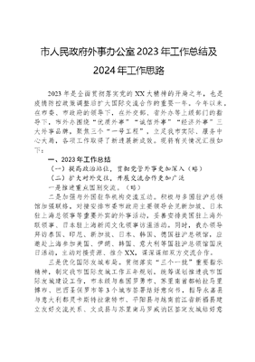 市人民政府外事办公室2023年工作总结及2024年工作思路2023年是全面贯彻落实党的XX大精神的开局之年,也是疫情防控政策调整后扩大国际交流合作的重要一年。今年以来,在市委、市政府的领导下,在外交部、省外办等上级部门的指导下,市外办围绕优质外事诚信外事经济外事三大外事品牌,聚焦三个一号工程,立足我市实际、服务中心大局,各项工作取得了新进展新成效。现将有关情况汇报如下:一、2023年工作总结(一)提高政治站位,贯彻党管外事更加深入(略)(二)扩大对外交往,开展交流合作更加广泛一是推进重点国别交流。(略)二是加强与外国驻华机构交流互动。积极与多国驻沪总领馆加强联络,对接安排市委市政府主要领导会见新加坡、日本驻上海总领事等重要外宾的外事活动,妥善安排美国驻上海外联领事、日本驻上海新闻文化领事访温活动。同时,我办领导拜访泰国、印尼、新加坡、日本、韩国、德国驻沪总领馆,应邀赴上海参加美国、伊朗、韩国、意大利等国驻沪总领馆国庆日活动,主动对接资源、推介XX,谋深谋细双方交流合作。三是优化国际友城布局。贯彻落实三个一批重要指示精神,制定我市国际友城工作五年规划,统筹谋划推进我市国际友城建设工作,市本级与泰国罗勇市、苏里南首都帕拉马里博市、巴西圣保罗市等3个城市签署结好意向书,指导永嘉县与意大利都灵卡斯特拉蒙特市、平阳县与越南前江省新福县建立友好交流关系、文成县与苏里南马罗威讷区签定友城结好意向书。四是深化温港澳工作交流。科学谋划、全力做好双方高层互访、交流互动及在温港澳人士服务工作。服务安排XX市党政代表团赴香港开展经贸考察交流活动,期间代表团参访香港理工大学并出席了第八届粤港澳XX人大会暨粤港澳·XX合作发展论坛,先后拜访香港贸易发展局、中央人民政府驻香港特别行政区联络办公室,参访香港铁路有限公司、香港太古集团、李锦记集团,行程安排密集、活动内容丰富、交流成效显著。妥善安排香港特别行政区政府驻上海经济贸易办事处(香港驻沪办)主任蔡亮访温活动,市主要领导会见并与之在共谋深化温港经贸、文化、科研、人才等多领域交流合作方面开展深入交流。在温期间,蔡亮一行还参加了市直有关部门座谈会并考察了XX市公安局出入境管理局、XX出入境边防检查站,参访了中国眼谷、XX肯恩大学、青山控股集团有限公司、XX家宝鞋业有限公司、星际控股集团有限公司、世界XX人家园等,对我市经济社会发展给予高度评价。牵线搭桥温港高能级合作,助推香港理工大学XX技术创新研究院签约揭牌,组织温企赴港参加第八届一带一路高峰论坛。精准服务温籍涉澳人员,圆满完成2023年政协《关于深化XX与澳门的全面合作,建立澳门-XX合作专班的提案》相关工作。关心关爱在温港澳人员,定期对在温港澳企业如星际控股公司开展走访座谈,配合市教育局做好2023年度XX市(区)范围在温港澳永久居民子女中考优待加分资格审核工作。(三)服务中心工作,推进对外开放更加有力一是搭建经贸交流平台。精心做好高层交流和重大涉外活动的翻译保障、外事礼宾和审查审核等工作。为2023青科会、世温会等重大外事活动做好外宾邀请、涉外管理、活动翻译、礼宾礼仪等保障工作。精心谋划因公出访活动。服务我市党政代表团赴一带一路沿线国家、RCEP重点区域开展经贸活动,推动举办投资推介和经贸对接活动50余场,签订协议超过110个,帮助企业获得国际产业链合作订单超11.4亿美元。市主要领导出访印尼、越南、新加坡期间,开展了高层拜访、城市推介、项目签约、企业走访、高校访问、展会考察等18场公务活动,与当地政府官员、企业、专业机构、高等院校和海外温商进行广泛深入洽谈交流,成功促成17个重大产业科创项目和战略合作协议签约,助推中印尼(XX)产业合作园等加速发展。精心服务企业走出去引进来。为正泰集团董事长南存辉一行赴西班牙、法国提供照会支持,促成德国隐形冠军之父西蒙教授及德国企业家代表团访问XX并进行企业路演和签约活动,利用外事资源协助邀请一汽大众、上汽大众、奥迪和宝马等德国主机厂采购和政府关系部门负责人专程来温出席2023第三届中国(XX)国际汽摩配博览会和中德汽车产业XX专场对接会活动,助力高质量推进地瓜经济提能升级一号开放工程。二是圆满完成杭州亚运会XX赛事分指挥部外事礼宾工作组和抵离工作组相关工作。专业做好外事礼宾工作。组建语言服务百人团和多语种翻译服务团队,优中选优确定30余名英语志愿者、储备9个语种30名多语种志愿者为团队成员,编制XX赛区语言服务工作指南和外事纪律小手册,为亚运分村、赛事场馆、训练场馆、注册中心等重点场所配备翻译设备、安排翻译力量,满足抵离、赛时、城市参访、突发应急等环节语言服务需求,累计提供服务510人次;热情规范接待15批38人次来温观赛的亚运高级别外宾,充分展示了XX良好的国际形象。精细