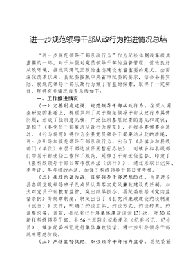 进一步规范领导干部从政行为推进情况总结进一步规范领导干部从政行为作为纪检体制改革极其重要的一环,对于加强对党员领导干部的监督管理,营造良好从政环境,推进风清气正政治生态建设有着重要的意义。全面深化改革以来,县纪委按照中央省市纪委的要求,结合全县实际,就规范领导干部从政行为做了有益的探索,取得了一定实效,现将有关情况自查总结如下:一、工作推进情况(一)完善制度建设,规范领导干部从政行为。在深入调查研究的基础上,梳理罗列了关于规范领导干部从政行为具体问题,形成了征求意见稿,广泛征求基层纪委的意见和建议,草拟了《县党员干部廉洁从政行为规范》,并报县委常委会通过,《行为规范》将作为全县党员领导干部廉洁从政的准绳,进一步引导和规范领导干部从政行为。出台了《县镇乡和县级部门(单位)中层干部选拔任用暂行办法》,对镇乡和县级部门中层干部选任工作作了规范,延伸了干部选任监督。印发了《县科级领导干部日常考核办法(试行)》,通过采取日记实、季考评、年考核的办法,加强了科级领导干部日常考核。(二)廉政约谈为诫,筑牢领导干部思想防线。为促进全县各级党政领导班子及成员认真落实党风廉政建设责任制,加大对党员干部教育监管,突出抓早抓小,县纪委根据《党内监督条例》等规章制度,制定出台了《县党风廉政建设约谈制度(试行)》文件,明确了约谈主体、约谈方式、约谈种类、约谈要求等。目前,县纪委已开展集体廉政谈话131次,对30名新任科级领导干部、县56个派驻出纪检组长(纪委书记、纪检员)、镇乡纪委书记进行集体廉政谈话,进一步引导领导干部筑牢思想防线。(三)严格监督执纪,加强领导干部行为监管。县纪委紧盯土地出让、工程项目招投标等行政权力容易失控、容易发生腐败、社会关注度高的重点领域,出台了《县奖励署实名信访举报有功人员暂行办法》,进一步畅通领导干部信访举报渠道,加强违纪违规线索收集管理,严防领导干部腐败行为滋生。今年以来,县纪委共收集到反映各级领导干部违纪违规线索120余条,其中立案调查18条。扎实开展查处发生在群众身边的四风和腐败问题专项行动,坚持小案早查、要案重查,以严格执纪倒逼行为规范,切实给权力戴上紧箍咒。结合纪检监察干部监督工作,实施廉政风险防控,对领导干部岗位风险进行排查评估,重点排查风险点,找准监督点,实施准点监督,强化了正面管理监督。(四)突出廉政教育,增强领导干部抵抗力。县纪委坚持把廉政教育教摆在突出地位,采取多种途径和方式创新领导干部廉政教育。通过严格落实廉政党课制度,结合X州大讲堂、廉政文化进机关等活动,邀请中央、省市专家领导就党风廉政建设、领导干部廉洁自律、新《准则》、《条例》等进行专题辅导,帮助领导干部补精神之钙,明底线、知红线,增强面对腐败诱惑的抵抗力和免疫能力,今年以来,共组织举办各类廉政党课3次,受教人员达500余人。二、存在的问题县纪委在推进纪检体制改革,落实进一步规范领导干部从政行为方面做了大量工作和初探,工作推进中同时也存在诸多问题。一是制度执行还不到位,制度实效还未完全体现。个别单位对于制度执行重视程度不够,县纪委对制度执行的监督检查常态化还存在疏漏,用制度管人、束人效果不强,四风和腐败行为变异滋生。二是廉政约谈尚有缺陷,抓早抓小需进一步加强。个别单位对实行廉政约谈制度的积极作用和重要意义认识不深,满足于应付一般性工作,交差应付,廉政约谈变聊家常,警醒教育意义不强,事前约谈少,事后约谈多,约谈效果打折扣。三是权力监察仍有纰漏,执纪监督需进一步文可居文库——海量学习资料,手机电脑均可下载www.wenkeju.com加强。个别单位贯彻落实查处腐败案件以上级纪委为主不到位,案件线索移交处置、重大案件移办等不及时,还存在压案、拖案、办人情案等问题,案件查办的震慑作用不够。三、下一步推进思路一是进一步健全完善规范领导干部从政行为相关制度。尽快印发《县党员干部廉洁从政行为规范》,对领导干部廉洁从政行为进行刚性规定,制定《行为规范》释义读本等延伸材料,切实发挥其监督约束作用。要进一步探索建立领导干部有关事项公开制,建立健全纪检监察机关和财政、审计等部门联动督查机制,加强对制度执行的监督检查力度,确保制度执行落到实处。二是进一步增强廉政约谈制实效性。健全完善新提任领导干部任前考廉、任前廉政谈话等制度,采取以案学法、以案说纪等形式,增强干部对廉洁自律党纪条规的认识,提高廉洁自律的意识。坚持对症下药的原则,约谈工作要采取因人、因事而异的方式进行,一针见血地指出苗头性倾向性问题,并及时纠正。做好约谈相关档案资料的记录、整理,存档备查,防止约谈工作不到位。注重约谈后对被约谈人的现实表现进行跟踪问效,并根据问效情况进一步做出处理,进而真正最终才能达到治病救人的目的。三是进一