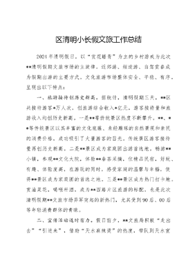 区清明小长假文旅工作总结2024年清明假日,以赏花踏青为主的乡村游成为此次**清明假期文旅市场的主旋律。近郊游、短途游、自驾赏春成为假期出游的主要方式。文化旅游市场整体安全、平稳、有序,呈现出以下特点:一、旅游接待创历史新高。据统计,清明假期三天,**区共接待游客*万人次,创旅游综合收入*亿元,游客接待量和旅游收入均创历史新高。一是**等传统景区热度不断攀升。**、**等传统景区以其丰富的文化底蕴、未经雕琢的自然景观和亲民的消费价格,成功吸引了大量游客的目光。传统景区游客接待量再创历史新高。二是**景区成为家庭团出游首选地。畅游**小镇,参观**文化大院,体验**春茶采摘,住精品民宿,好玩、有趣、体验度高,在游玩的同时,感受家庭的温馨与幸福,使得**景区成为家庭团的首选之地。三是**景区成为热门打卡地。赏油菜花,喝咂杆酒,成为**西路片区旅游的标配,也是此次清明假期**文旅市场异军突起的新热门,尤其受到90后、00后等年轻消费群体的青睐。二、宣传活动适时有力。假日前夕,**文旅局积极走出去引进来,借助天水麻辣烫的热度,带队到天水宣传,在赋能天水文旅的同时,也为**文旅市场引流导流,带火本地文旅市场。与此同时,**各大景区积极响应,纷纷推出文旅惠民等优惠措施,并利用抖音、快手、视频号等新媒体为假日市场宣传促销。假日前夕,**区成功举办了春漫大美**.花醉康养胜地**市**区西路片全域旅游首届油菜花文旅康养艺术活动,为清明假期预热。宣传活动适时有力,为今年清明文旅市场的火热奠定了基础。 三、文旅消费市场规范有序。为营造安全有序的文旅市场环境,节前,区文旅局召开了全区文旅行业安全生产专题会议,统筹抓好文旅行业安全生产工作。并联合其他部门开展执法检查,对全区A级景区、星级饭店、娱乐场所、旅行社等持续开展安全生产大检查,尤其对服务质量提升、依法规范经营、消防设施设备、安全警示标识标牌、森林防火、管理人员巡逻巡查等方面进行了检查督查。同时,要求经营单位进一步强化主体责任,牢固树立安全第一的生产理念,完善应急预案,落实落细各项防范措施,进一步提升旅游服务质量,共同营造扩消费、稳增长的文旅消费环境。假日期间,文旅系统执法人员不断加强市场执法检查力度,坚持24小时在岗值班,全力做好各项服务保障工作,未发生较大舆情和旅游安全生产事故。文可居文库——海量学习资料,手机电脑均可下载www.wenkeju.com