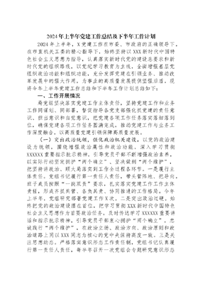 2024年上半年党建工作总结及下半年工作计划2024年上半年,X党建工作在市委、市政府的正确领导下,在市直机关工委的精心指导下,始终坚持以XXX新时代中国特色社会主义思想为指导,认真落实新时代党的建设总要求和新时代党的组织路线,以党纪学习教育为主线,全面增强基层党组织政治功能和组织功能,充分发挥党建在引领业务、推动改革发展中的强大作用,为事业的高质量发展提供坚强后盾。现将今年上半年党建工作总结和下半年工作计划总结如下:一、工作开展情况局党组坚决落实党建工作主体责任,坚持党建工作和业务工作同谋划、同部署,督促指导各党支部强化抓党建的责任意识、担当意识和自觉意识,把党建各项工作任务落实落细落到位,确保党建各项工作任务圆满完成,推动党建工作与业务工作深度融合,以高质量党建引领保障高质量发展。(一)突出政治统领,强化政治机关建设。以党的政治建设为统领,围绕增强政治属性和政治功能,深入学习贯彻XXXXXX重要指示批示精神,引导党员干部不断增强政治素养,以实际行动坚定拥护两个确立、坚决做到两个维护,把坚持讲政治、顾大局落实到工作全过程各环节。一是履行主体责任。党组书记履行第一责任人责任,带头管阵地、把导向,班子成员按照一岗双责要求,扎实落实党建工作工作主体责任,形成齐抓共管、各负其责、协同推进的工作格局。今年上半年,党组研究部署党建工作X次。二是突出政治过硬。始终把党的政治建设摆在首位,把学习贯彻XXX新时代中国特色社会主义思想作为首要政治任务,及时传达学习XXXXXX重要讲话和指示批示精神,引导党员干部衷心拥护两个确立,忠诚践行两个维护,在政治立场、政治方向、政治原则和政治道路上同以XXX同志为核心的党中央保持高度一致。三是关注思想动态。严格落实意识形态工作责任制,党组书记认真履行第一责任人责任,每半年召开一次党组会专题研究意识形态工作,定期听取各班子成员落实意识形态工作情况的汇报,对本单位意识形态领域的风险隐患和倾向性苗头性问题进行分析研判,总结经验、查找不足、提出对策。今年上半年,研究意识形态工作X次,开展谈心谈话X次。(二)坚持凝心铸魂,持续加强理论武装。坚持和加强党的全面领导,不断巩固拓展主题教育成果,迅速掀起学纪、知纪、明纪、守纪热潮,以严实作风高效履职尽责,切实将学习成效转化为推动工作高质量发展的强大动力。一是坚持系统规划学。坚持把开展党纪学习教育作为当前一项重要政治任务来抓,第一时间召开会议认真学习上级党纪学习教育部署会精神,研究学习方案,制定任务清单,坚持问题导向,细化具体任务,明确责任分工和完成时限,组建工作专班,协同推进整体工作,迅速形成党纪学习教育施工表路线图,确保上下联动、同频共振、一体推进。同时,将党纪学习教育融入日常工作、党员生活,引导党员干部学纪、知纪、明纪、守纪,把纪律要求内化为自觉行动。二是坚持多维触角学。大力发扬深学精神,按照党组领学、支部研学、党员自学模式,举办集中读书班,采取领学领读、原文阐释、案例教学等方式原原本本、逐章逐条学习《条例》,并开展交流研讨;组织观看警示教育片、前往警示教育基地参观、讲授六大纪律微党课、举办青年干部说清廉演讲、开展条例知识知识问答等活动,真正让党员干部受警醒、明底线、知敬畏,让学习更加贴近实际、贴近党员,增强学习的吸引力和实效性,确保学习教育跟踪问效、落实走深。三是坚持融入实践学。持续转化学习成果,组织开展以案促改和自检自查,党员干部带头反躬自省,围绕办好民生实事、攻坚重点项目、化解群众矛盾等多个方面认真检视剖析自身存在的隐患,切实在自我检验中促进成果转化。同时,坚持两手抓两促进,将开展党纪学习教育与各项重点工作任务深度融合,引导广大党员干部围绕大局攻坚克难,立足本职创先争优,在推进县城建设和城市管理等工作中发挥示范引领作用,切实将学习党纪的过程转化为强化担当、提升本领的过程,让党的纪律真正在党员干部心中扎根。(三)注重强基固本,夯实基层基础工作。着力建强基层党组织,持续加强党支部标准化规范化建设,积极推动模范机关建设,打造四强党支部,着力在创新形式、丰富内涵、确保实效上下功夫,不断增强党内政治生活的政治性、时代性、原则性、战斗性。一是强化组织建设,夯实战斗堡垒基础。根据党员人数和分布情况,及时调整各党支部的党员分布,确保党的组织和工作全覆盖。建立健全党员信息库,完善党员管理制度,加强党员教育培训,提高党员素质。严格执行三会一课制度,定期召开党支部支委会和党员大会,加强党员思想政治教育。二是强化队伍建设,提升战斗堡垒战斗力。通过定期组织学习、开展主题党日活动等方式,提高党员的政治觉悟和组织纪律性。同时,加强对流动党员的管理和服务,确保他们能够正常参加组织生活。鼓励党员发挥先锋模范作用,通过设立党员先锋岗的方式,引