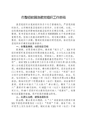 市整顿软弱涣散党组织工作总结基层党组织在党的组织体系中处于基础地位,严密党的组织体系,必须确保基层党组织全面进步、全面过硬。当前,一些软弱涣散党组织影响党的基层组织体系建设质量,必须予以整顿。X市委组织部深入贯彻落实XXXXXX关于党的建设的重要思想,坚持大抓基层的鲜明导向,通过做实摸排、治理、整改、验收四个步骤,整顿软弱涣散村级党组织,推动党的基层组织体系建设效能整体提升。一、全覆盖摸排,动态锁定目标抓摸排,首要是确定目标,搞清楚抓什么。XX市委组织部紧盯基层党组织软弱涣散突出表现,全方位关注基层党组织运行情况,做到及时发现、即时纳入。聚焦中心定类型,围绕各阶段中心任务,及时排查整改基层党组织在百千万工程、绿美XX生态建设等工作任务中落实不到位等13类问题,深入分析基层党组织软弱涣散的根本原因,摸清病灶、定准类型,确保整改措施有力有效。横向联动强研判,压实各级各部门工作责任,结合换届回头看、村(社区)两委班子分析和日常调研督导等工作,联动纪委监委和统战、政法、民政、信访等部门,对1022个村(社区)党组织开展4轮全覆盖排查,精准识别27个软弱涣散村(社区)党组织。纵向督导评星级,统筹乡村振兴五大振兴牵头部门,制定五大振兴星级评定48项指标,对1022个村(社区)党组织进行评定打分,将60个星级评定分数较低的村纳入观察村,统筹制定前置整改措施,筑牢软弱涣散整治防线。二、从源头治理,建强基层队伍抓治理,重点是追本溯源,从人的因素找问题谋对策XX市委组织部聚焦村(社区)两委干部、储备干部、农村党员三支队伍进行治理,制定实施《XX市村(社区)干部队伍建设质量提升三年行动计划(2023—2025年)》《XX市加强村(社区)干部队伍建设的实施意见》,明确55条工作措施,建立健全储选育用管激汰村(社区)干部队伍建设工作体系。抓结构素质提升,重点调整充实35周岁以下和大专以上学历干部13人,结合抓党建促乡村振兴年度主题轮训制度,加强村(社区)两委干部学历教育和能力培训,组织村(社区)干部参与各类专题学习、外出观摩活动共259场次,推动村(社区)两委干部年龄学历结构明显优化、履职能力显著提升。抓干部储备扩充,发挥驻村第一书记作用,抓住乡村产业振兴发展重点,建立乡村振兴人才台账,探索土专家田秀才乡创客发现培养机制,强化软弱涣散基层党组织人才培养,从返乡青年、乡贤能人、带富能手、退伍军人等群体中选育储备干部62人。通过党员群众推荐、党组织推优等方式,从青年、高知识群体中发展党员和入党积极分子114人。抓党员作用发挥,结合开展村民小组建设分析,大力推动两个覆盖向村民小组等组织延伸,充分推动党员在乡村振兴中发挥先锋模范作用,组织1322名党员带头开展246场党群志愿服务活动,清理垃圾废物5342吨,拆除违建668间,协调解决民生实事191件,不断提高群众幸福感。三、强针对整改,分类破解难题抓整改,关键是瞄准问题,精准施策补齐短板。XX市委组织部深度梳理软弱涣散党组织24条具体问题,一村一策制定27套整顿方案共156项措施,定期跟踪整改情况。聚焦提升班子合力,结合届中分析、专题研究等多轮全覆盖调研,列出152条正负面履职规则清单,对软弱涣散基层党组织进行整体评价,对村(社区)两委干部逐个评定,动态调整履职不到位不合格干部31人,有效提升班子凝聚力和战斗力。聚焦提升服务实效,大力推行我为群众办实事和书记工程民生项目,指导相关村两委干部走村入户访民情、察民意,切实解决群众急难愁盼问题。如沙溪镇上西林村党支部文可居文库——海量学习资料,手机电脑均可下载www.wenkeju.com发动乡贤集资约9000万元推动西林公园、综合市场等项目建设着力打造先行示范项目。龙湖镇下阁洲村党支部2023年流转土地约133亩,清理追回合同欠资30万元,顺利解决了多年土地撂荒、欠款遗留问题。聚焦提升带动发展能力,对乡村振兴推进乏力、工作打不开局面的,强化村级党组织的领导核心地位,结合集体经济消薄攻坚行动,学习借鉴特色村发展模式,累计推动各村集中清理不规范合同153宗,谋划集体经济项目25项,结合特色优势投入资金3800多万元,带动集体经济稳步增收。如江东镇谢渡村党支部通过土地流转和鱼池垦复,实现集体经济每年增收约40万元,发展造血功能明显增强。四、严标准验收,建立长效机制抓验收,最终要明确出列标准,巩固成果成效。XX市委组织部以抓实验收把关倒逼工作长效落实。立标准划出底线,建立123456考核标准,即党组织是否在基层组织和一切工作中拥有领导核心地位;整顿工作是否通过党员、群众的满意度测评;导致党组织软弱涣散的最突出问题是否根本解决、面上问题是否有效解决、预后问题是否妥善防