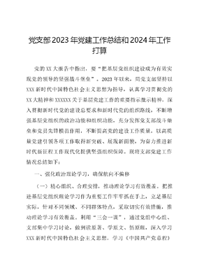 党支部2023年党建工作总结和2024年工作打算党的XX大报告中指出,要把基层党组织建设成为有效实现党的领导的坚强战斗堡垒。2023年以来,局党支部坚持以XXX新时代中国特色社会主义思想为指导,认真学习贯彻党的XX大精神和XXXXXX关于基层党建工作的重要指示批示精神,深入贯彻新时代党的建设总要求和新时代党的组织路线,不断增强基层党组织的政治功能和组织功能,充分发挥党支部战斗堡垒和党员先锋模范作用,不断提高党的建设工作质量,以高质量党建引领各项工作取得新突破、展现新面貌,为奋力推进新时代新征程工作现代化提供坚强组织保障。现将支部党建工作情况总结如下:一、强化政治理论学习,确保航向不偏移(一)精心组织、合理安排,推动理论学习有效覆盖。把推进基层党组织理论学习作为重要工作牢牢抓在手上,立足基层实际,针对不同领域、不同群体特点,采取切实有效措施,推动理论学习有效覆盖。利用三会一课,通过党组中心组、支部集中学习讨论,做到读原著、学原文、悟原理,深入学习XXX新时代中国特色社会主义思想,学习《中国共产党章程》等内容,做到在学深悟透、融会贯通、知行合一、学以致用上下功夫。针对退休党员高龄党员多、行动不便的情况,组织具有一定理论功底的在职党员与他们建立结对关系,定期上门送学。(二)深学细悟、入心见行,以理论学习促本领提升。坚持不懈用XXX新时代中国特色社会主义思想凝心铸魂,深刻把握这一重要思想的核心要义、科学内涵、理论体系和实践要求,学出政治忠诚、学出使命担当、学出实干精神、学出深厚情怀、学出斗争本领、学出清醒坚定,在深学细照笃行中提高理论素养、升华思想境界、增强能力本领,真正把学习成效转化为改造主客观世界的内在主动,转化为履职尽责、服务大局的实际行动。从提升理论学习质量和实效入手,不断丰富理论学习方式,切实提高学习效果。以科室为单位,采取集中学习、集体研讨、个人自学等学习模式及讲授式、拓展式、讨论式等授课方式,专题学习XXXXXX的最新指示批示精神、权威评论文章或外地先进经验,同时依托岗位实际自主拟定其他学习内容,最大限度地把理论学习和实际业务工作结合起来,坚持学以致用、以用促学,推动学、思、研相结合。党员干部进一步明确了理论武装、滋养初心、引领使命的目标任务,激发了提升能力、干事创业的工作热情。(三)学以致用、知行合一,让群众感受到主题教育实效。在抓实理论学习的同时,坚持学以致用、知行合一,通过服务群众的生动实践,不断增强群众的获得感、幸福感、安全感。把办实事、解民忧作为开展主题教育的重要任务,针对群众中心领导班子反映问题,多次研究、多方协调解决。利用各类平台广泛收集群众意见建议,并将搜集梳理的问题转派给相关单位督促办理。二、强化组织功能,建设坚强战斗堡垒(一)加强支委班子建设。坚持把制度建设作为强化班子堡垒作用的基石,积极修订和完善支委议事、学习制度,强化制度落实,不断提高班子科学决策能力。针对支委班子结构不合理、人员变动等问题,及时理顺党组织关系,配齐支部班子,把政治强、业务硬,有担当、善做事的同志选配到支部班子中。严格落实党的民主集中制原则,增强民主氛围,对重大决策,严格按照集体领导、民主集中、个别酝酿、会议决定的原则,规范建立健全议事规则和决策程序,增强工作透明度,提高办事效率。落实三会一课制度,每月一次支委会,每个季度一次党员大会和一次党课。(三)严格组织生活制度。严肃党内政治生活,全面落实三会一课、组织生活会和民主评议党员等制度,加强党员教育培训,组织开展政治理论、光荣传统、党风党纪教育等培训,增强党性党风党纪观念,使广大党员立足岗位服务群众、创先争优。采用民主商议、民主表决的方式量身定制出台党员奖惩制度,将党员积分制落到实处,对党员规范有序管理,明确做到奖惩分明、能上能下,打开党员干部多做多错、不如不做的心结,用不断健全完善的制度激励约束管理党员,在基层党组织内部掀起以多干敢闯能创为荣、以少干懒干不干为耻之风。(三)健全党内工作机制。建立交心谈心制度,定期为党员疏通思想、沟通感情、疏解困惑、纠正偏差。开展优秀党员、优秀党务干部评比表彰活动,用身边人身边事教育激励人。加强人文关怀,法定节假日组织开展送温暖活动,党员患病住院、家庭发生意外、生活遇到特殊困难时,党支部负责人都及时进行走访慰问,积极创造条件解决党员在工作和生活中的实际困难,使党员时刻感受到组织的关怀。建立党务公开和党员积分制管理制度,进行季度和年度晒一晒、比一比、评一评,及时发现问题、找到差距,使党组织切实成为教育党员的学校。三、发挥党建引领作用,推动业务深度融合(一)聚焦政治功能强,增强政治引领力。深刻认识工作的政治属性,扎实开展学习贯彻XXX新时代中国特色社会主义思想主题教育,增强推进党建、业务融合的自觉性。将党建与