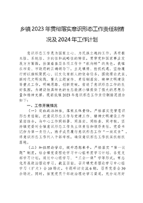 乡镇2023年贯彻落实意识形态工作责任制情况及2024年工作计划意识形态工作是为国家立心、为民族立魂的工作,具有根本性、系统性、方向性和战略性的特征,贯穿党和国家事业发展方方面面,扮演着基层各项工作中航向标的角色。我镇在市委、市政府的正确领导下,立足镇情、抢抓机遇,坚持履行好以旗帜聚民心、以文化育新人的使命任务,围绕理论武装、新时代文明实践、重大主题宣传、责任制落实、精神文明建设等重点工作,明确思路、创新突破,营造了意识形态工作的良好氛围,为建设独具特色的生态能源小镇提供了强大的思想力量和精神支撑。现将我镇2023年意识形态工作责任制情况报告如下:一、工作开展情况(一)突出政治担当,落实主体责任。严格落实党管意识形态责任制,把意识形态工作与党建工作、精神文明建设工作紧密结合,与中心工作同部署、同落实、同检查、同考核。坚持镇党委对全镇意识形态工作负主体责任和领导责任,党委书记作为第一责任人,班子成员履行意识形态工作一岗双责,将意识形态工作列入干部考核,确保意识形态工作抓实抓细抓落地。(二)加强理论学习,提升思想水平。严格落实第一议题制度,结合镇党委理论学习中心组年度学习计划、各党支部学习计划,通过中心组学习、三会一课学等形式,常态化开展政治理论学习。截至目前,召开镇党委理论学习中心组学习(扩大)会10场次,专题研讨交流6期,召开党委会30余场次。同时,拓宽党员干部政治理论学习渠道,充分运用好学习强国、新时代文明实践所(站)等平台,组织开展网络自学、线下宣讲学,长期以来,全镇党员日人均分均超过40分,切实引导党员干部自觉增强四个意识,坚定四个自信,做到两个维护。(三)抓好典型宣传,引导正向舆论。充分利用微信公众号、微信群等媒介,统筹理论学习、宣传工作,全方位、多角度开展意识形态工作。始终把培育和践行社会主义核心价值观作为精神文明创建的重要内容,以为新时代文明实践站(所)为主阵地,不断充实志愿服务队,围绕人居环境、牧区政策宣传等内容,开展多种形式多样,内容丰富的志愿服务。不断巩固历史文化名镇荣誉称号,积极开展移风易俗活动。充分利用文艺汇演、宣传栏等载体,传递社会主义核心价值观,强化典型示范,扎实开展最美家庭等评选活动,培育良好家风、淳朴家风。发挥呼和镇红色优势,不断书写好呼和镇红色故事,赓续红色血脉。(四)盯紧阵地建设,守住舆论防线。始终坚持党管意识形态的总原则,聚焦增强政治自觉、筑牢政治忠诚,综合运用一把手讲党课、专题讲座等方式,坚持线上线下相结合、领学与自学相结合,不断提高政治教育的实效。进一步修订完善了党委理论中心组学习制度,制定学习计划,开展领导带头讲党课等活动。借助学习强国等平台,使党员学习教育灵活化、常态化,积极引导干部职工理解掌握XXXXXX谈治国理政的新理念、新思想、新战略,不断强化干部职工意识形态工作事关党的前途命运、事关国家长治久安、事关民族凝聚力和向心力的观念。及时关注舆情,按照舆情处置处早、处小、处快的原则,细化工作措施,明确工作任务,加强对微博、微信、QQ等使用的监管与把控,同时建强微信公众号和微博等网络发声阵地。(五)增强工作意识,及时整理资料。牢牢掌握网络意识形态主导权,认真落实意识形态工作责任制,不断维护呼和诺尔镇网络新媒体运行,明确专人负责、专人管理,严格执行新闻信息宣传三审三校制度流程。高度关注舆情动态特别是网络舆情动态,建立完善网络舆情处置预案。做好全镇政策宣传、社情民意收集等相关工作,同时鼓励广大群众积极对互联网违法和不良信息的举报,常态化开展网络安全宣传教育,不断提升网上舆论引导能力共同营造风清气正的网络空间。二、存在的问题(一)意识形态学习主动性不强。部分干部职工随着工作时间的延长,工作的热情有所下降,导致一些工作处于应付状态,逐渐地转变为主动性变差,自主学习新的知识理论意识不强,尤其在意识形态学习中针对性不够,缺乏自己的思考,与工作联系不强。(二)意识形态工作宣传不到位。因对该项工作的宣传不到位,导致部分群众大局意识和集体观念较为淡薄,接受新事物积极性不高,还存在故意损坏公共场合财产等一些不讲公德的现象。(三)意识形态领域队伍建设不够。基层干部队伍人员工作量大,高素质专业人才较为缺乏,干部培训不能经常化、制度化。部分干部对意识形态工作认识模糊,以为意识形态工作是党委的事而非己任,从而忽略了意识形态工作,投入的时间和精力较少,不善于研究解决意识形态领域出现的新问题和新现象。(四)意识形态阵地设施不足。由于我镇突发事件相对较多,财政支出方面较大,导致在意识形态工作上面投入经费较少,导致意识形态阵地设施标准不高,现有的广播电视、宣传文化等方面的设施落后,无法很好地发挥宣传教育引导的作用。(五)内容形式相对单一。在意识形态工作方面,工作的方式方法创