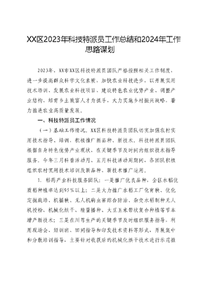 XX区2023年科技特派员工作总结和2024年工作思路谋划2023年,XX市XX区科技特派员团队严格按照相关工作制度,进一步提高群众科学文化素质,加快农业科技进步,以开展实用技术培训、发展农业科技项目、建设特色农业优势产业、调整产业结构、培育乡土致富人才为抓手,大力实施乡村振兴战略,着力推进农业高质量发展。一、科技特派员工作情况(一)基础工作情况。XX区科技特派员团队切实加强农村实用技术指导、培训,积极推广新品种、新技术。科技特派员团队根据自身特色优势产业现状,在关键季节及时间内组织技术指导服务。今年三月科普活动月、五月科技活动周期间,各团队积极组织农村实用技术培训及新品种、新技术推广运用。1.稻药产业科技服务团队:一是推广优良品种,全区水稻优质稻种植率达到95%以上;二是大力推广水稻工厂化育秧、优化定抛栽培、机插秧、无人机病虫害综合防治、杂交水稻制种无人机授粉、机械化烘干、精量播种、大豆玉米带状复合种植等节本增产新技术;三是在川芎生产的关键季节及时组织服务指导,利用现场会、短训班、田间指导和印发技术资料等形式,开展集中和分散培训指导,主要针对收获后的机械化烘干技术进行示范推广,解决环保污染问题。2.柑橘产业科技服务团队:一是组织技术人员分镇(街道)开展桔桔生产技术培训,特别是对贫困村进行了重点培训,并对标准化生产、科学用药、合理施肥、病虫防绿色防控进行了入户指导;二是加大柑橘新品种、新技术推广力度。3.葡萄产业科技服务团队:一是利用XX省葡萄协同技术推广新型职业农业培训等项目,采用课堂教学、现场培训、网络培训等方式,邀请XX省农科院园艺所研究员、国家葡萄产业技术体系XX综合试验站站长XX、XX区葡萄产业带头人、土专家XXX等集中开展实用技术培训;二是持续不断地为种植户提供田间技术指导,只要有种植户反映遇到问题,都会到田间查看原因,找到并解决问题。4.猕猴桃产业团队:一是邀请省上专家到园区、田间开展技术指导;二是组织区域内专家开展技术指导及实用技术培训。5.标准化养殖科技服务团队:一是加强水产标准化、健康养殖宣传,建立水产健康养殖示范点,加强渔业尾水治理的监督、宣传、检查和指导,大力推广池塘浮床水稻种植、微生物制剂和生石灰调水改底、严格落实养殖尾水排放申报许可制度;二是推广水产健康养殖,推广浮床水稻种植,微生物制剂和生石灰调水改底。(二)整合资源,提升产业竞争力。科技特派员团队结合各自优势,整合资源,扩大、规范产业规模、提升品质,增强产业竞争力。一是落实强农惠农政策,利用一切可以利用的条件与资源,广辟资金来源,积极筹措,整合家庭农场、科技入户等项目资金,支持本地专合社扩大经营、服务范围,提升技术水平,推动专业化服务和规模化经营;二是支持大户进行土地的流转,开展规模化、标准化生产。(三)加大品牌培育,规范产业园区、基地建设。各产业科技特派员分团队进一步加强产业品牌培育,加大产业园区、基地建设,规范产业园区、基地标准化。1.稻药产业科技服务团队:一是培育稻药种植大户和专业服务组织:二是进一步推进产业规模化、标准化经营及安全生产。2.柑桔产业科技服务团队:一是协助组团打造柑桔品牌,现有柑桔无公害农产品8个,绿色食品证3个,XXXX已作为XXXX柑桔的区域公共品牌。结合XX区本土特色商标彭祖,增报了彭祖寿柑、彭祖寿橘、彭祖三月山三个彭祖系列商标;二是规范柑橘现代产业园区3个,(XX镇柑橘产业园区,以晚熟柑桔生产为主,柑桔初加工及乡村旅游融合发展;XX街道柑橘产业园区,以晚熟柑桔生产为主,乡村休闲旅游为辅;XX柑橘产业园区,以晚熟柑桔生产为主,生产性服务、批发零售仓储服务、电商服务配套发展);三是通过高接换种、种养循环、有机肥替代化肥、水肥一体化、绿色防控,完成改造老果园5000亩3.葡萄产业科技服务团队:一是大力推进葡萄现代产业化建设;二是做好品牌培育及品质提升;三是做好产业园区、基地、示范及农产品安全等。截止目前,全区已建成特色葡萄产业基地2.3万余亩,控产后平均亩产1250—1500公斤。4.猕猴桃产业科技服务团队:一是加大猕猴桃产业园区建设二是做好做好产业园区示范及食品安全等。5.标准化养殖科技服务团队:一是加强养殖安全;二是加大标准化养殖基地建设力度。(四)加大科技宣传力度,做大做强特色优势产业,营造良好的科技下乡、科学种养殖氛围。科技特派员团队结合XX区特色优势产业特性,主要在今年三月的科普活动月、五月的科技活动周期间及在平时下乡、村开展技术指导、培训期间积极宣传:一是宣传三农政策;二是宣传做好种、养殖标准化、规模化、生态化,;三是宣传特色优势产业新品种、新技术运用、推广。二、取得成效(一)2023年,科技特派员服务团队开展相关技术培训50余期,3000多人次,培训乡、村技术干部800余人;技术指