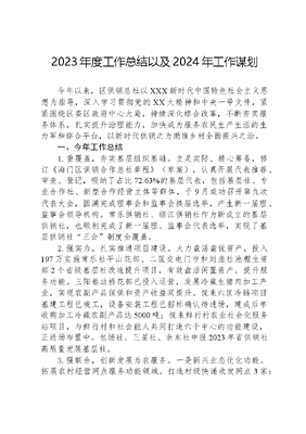 2023年度工作总结以及2024年工作谋划今年以来,区供销总社以XXX新时代中国特色社会主义思想为指导,深入学习贯彻党的XX大精神和中央一号文件,紧紧围绕区委区政府中心大局,持续深化综合改革,不断夯实服务体系,扎实提升治理能力,加快成为服务农民生产生活的生力军和综合平台,以新时代供销之为助推乡村全面振兴之治。一、今年工作总结1.重覆盖,夯实基层组织基础。立足实际、精心筹备,修订《海门区供销合作总社章程》(草案),认真开展代表推荐、审查、登记,吸纳了占比72.63%的基层代表,包括基层社、专业合作社、新型合作经营主体等群体,于9月成功召开第九次代表大会,圆满完成理事会和监事会换届选举,产生新一届理、监事会领导机构。常乐供销社、临江供销社作为新成立的基层供销社,也顺利完成了新一届理、监事会代表选举,实现了基层供销社三会制度全覆盖。2.强实力,扎实推进项目建设。大力盘活盘优资产,投入197万实施常乐社平山花部、二匡交电门市和刘浩社池棚生资部2个省级基层社改造提升项目,有效盘活闲置资产,提升服务功能。三阳卷边桥花部已投入运营,发展冷藏生猪肉加工产业,实现农副产品保供和资产收益双提升。悦来六匡冷链项目基建工程已竣工,设备安装工程已招标确认待进场,建成后年收购加工冷藏农副产品达5000吨;悦来鲜行村农业社会化服务站项目,与鲜行村和社会能人共同打造六个中心的功能建设,正进场布置中。包场社、三星社、余东社申报2023年省供销社高质量发展基层社。3.强联合,创新发展为农服务。一是新兴业态优化功能。拓展农村经营网点服务功能领域,打造村级快递收发网点3家;与海门农商行签订框架协议,打造普惠金融服务网点9家;联合主办南通市叠石桥杯首届网络直播大赛,参与助农直播带货。创办专业合作社3家、提档升级农村综合服务社8家。二是展示展销示范引领。组织海门优特农产品,参加率鲜进沪2023南通名优农产品上海展示展销活动,实现现场销售与订单签约双丰收,签约额近亿元;11月中旬组织特色农产品参与省供销社组织的长三角供销社展销会,进一步扩大海门特色品牌地区影响力,拓宽农产品销售渠道。三是绿色助农持续升级。优化调整农药包装废弃物(农膜)回收站点,共设置农药包装废弃物(农膜)区级运营中心1个,区镇回收站24个,村级回收点231个,农药零差率配供点49个,4个区镇申报示范点创建。做好农药零差率配供、农药包装废弃物回收工作,截止目前,共回收处置农药包装废弃物513万件,回收废旧地膜1067吨(毛重)、完成农药销售XX万元,已经完成全年目标任务。4.全方位,时刻抓牢风险防范。将风险防范摆在突出位置,围绕老旧房屋整治、城镇燃气使用、消防安全等重点领域,持续开展安全生产风险专项整治、重大事故隐患专项排查等,。应对恶劣极端天气,多次实地排查社有资产,及时确定维修方案,确保资产安全。今年以来,共计投入近XX万元,对33处资产进行维修改造,提升资产安全系数。5.全过程,注重党建融合渗透。将供销系统基层单位划分为5个片区,并以片区为单位,开设金扁担学习社分社4家,打造基层前沿讲堂。结合学习贯彻XXX新时代中国特色社会主义思想主题教育、持续推进能力作风建设提升年、五比一争主题实践等活动,先后开展多次集中理论学习,观看红色电影,组织演讲比赛、荣退仪式,开展联盟共建,青蓝结对,志愿服务,拍摄视频《点农成金当燃供销》,通过树品牌,强队伍,促融合,不断激发供销党建新活力,释放发展源动能。二、存在问题一是为农服务契合点还不够多,助力乡村振兴、助农增收的社会效益还没有充分发挥。二是社有资产利用率还不够高,资产的发展潜力还没有充分挖掘。三是系统内适应高质量发展的人才较为缺乏,干部队伍断层现象比较严重。三、明年工作打算1.锚定一个目标,把握高质量发展重大机遇,凝聚供销新力量。围绕农业强国建设,立足三农工作大局,贯彻落实区委十五届六次全会精神,持续推进综合改革,锚定基础坚实、功能完备、服务优质、作风充分目标,聚力两项服务,突出三大重点,做实四篇文章,全力以赴创先争优,为全面推进乡村振兴、中国式现代化海门新实践贡献供销力量。2.聚力两项服务,推动为农体系落地开花,跑出供销加速度。一是激活农业社会化服务。聚焦农民关切,坚持需求导向加强与农村集体经济组织、各类新型农业经营主体的合作,培育一批实力强、水平高的社会化服务主体,打响农业社会化服务的供销合作社品牌。重点推进悦来鲜行农业社会化服务中心运行,突出六中心服务功能,强化联动叠加效应,真正为农惠农。放大悦来六匡冷链项目辐射效应,为周边农户提供全过程、全要素、全产业链服务,促进农民增收增效。加强智能化设备推广运用,嫁接电子商务、物流快递、便民服务等更多服务资源和要素,提高科技服务含量,推进智慧农业服务