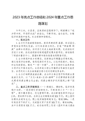 2023年亮点工作总结和2024年重点工作思路谋划今年以来,在县委、县政府的坚强领导下,顺溪镇以起步即冲刺、开局即决战的姿态,不断开拓,奋力前行,全镇经济发展稳中有进,社会保持和谐稳定。一、亮点工作1.全力补齐旅游接待短板。高品质建成顺·溪里、岭后星空、梦里知音等网红民宿。以竹林石滩为特色,打造顾南篱·顺溪品牌乡村酒店,该项目已完成土地政策处理,完成初拟项目设计方案。依托省级四村联建抱团发展共富项目,谋划推进下顺溪村餐饮中心、望眉村黄年糕体验基地等配套项目。2.全力推进和美乡村建设。创新推出环境整治奖惩机制,通过每周评比晾晒,每月现场互学互比,以比学促提升。强化村庄风貌管控,制定一村一方案,多个行政村在各类和美乡村评比中排名前列,全县和美乡村工作推进会作典型交流发言,余思坑村入选全省美丽宜居示范村创建优秀名单。3.全力打响顺溪旅游品牌。成功举办第五届平阳顺溪古屋旅游文化节,以文化+美食+互动+演绎方式带领游客沉浸式感受顺溪古镇古风古韵;顺溪古镇保护利用案例上榜国优。二、重点工作开展情况(一)稳增长、调结构,经济发展稳中向好。一是招商引资持续发力。不断推进三个一号工程,提升服务理念、优化营商环境。成功新增总部回归企业2家,意向回归3家,总部企业实缴税收超XX万元,规上盈利性服务业超X亿元,限上批发销售额超X亿,增速28%。二是有效投资不断扩大。完成固定资产投资XX万元,增速8.3%,其中交通投资XX万元。成功培育限上住宿(温州市海川酒店管理有心公司)、餐饮(平阳县顺眉餐饮有限公司)、零售(温州维天科技有限公司)等限上主体。三是要素保障全面抓牢。深耕全域土地综合整治,旱改水项目已立项108亩,完成验收23亩。实施建设用地复垦项目13亩,清理批而未供土地1亩;春耕备耕工作59亩、耕地垦后管护种植492亩已全部完成种植;增减挂项目可实施约113亩均已进场施工。(二)抓项目、促发展,旅游开发不断提速。一是全面推进景区建设。顺溪全域亮化工程全面建成,知音涧景区改造提升、顺溪古建筑群整体提升、棋盘山高山旅游、山中看海游乐园等文旅项目加快推进,高质量建设14个微改造·精提升项目。二是全面完善旅游体验。积极谋划特色采摘、归林野宿等精品农旅项目,白云村生态茶园配套基础设施、岭后山油茶基地、榨油厂体验工坊均已完工。三是全面强化品牌打造。与许一顶影视文化工作室签署战略合作协议,对标大唐不夜城以影视+为主题打造古风影摄基地;拍摄发布《文以礼顺,明似清溪》《顺心顺意,在顺溪》《青山绿水美如画,古屋古韵在顺溪》等宣传视频,顺溪旅游发展活力进一步迸发。(三)重统筹、治环境,城乡建设步伐加快。一是优化基础设施建设。稳步推进四好农村路建设,1.85公里低等级道路提升工程进度已达90%,4条2.92公里通自然村道路、1.428公里大中修提升改造工程均进场施工。完成顺溪车站公交化改造及村级客货邮物流服务点试点建设。新增停车位100个,有效改善群众停车难问题;二是攻坚环境整治提升。紧跟和美乡村示范引领、全域整洁行动热潮,今年来,顺溪镇共发动5000余人次,清理垃圾1800余吨,整治乱堆乱放处1578个,整治乱搭建2000余处,完成多个村庄赤膊房整治提升,余思坑村入选全省美丽宜居示范村创建优秀名单。三是强化生态环境保护。统筹推进美丽河湖建设,投资XX万元打造鳌江干流(顺溪段)和只音溪美丽河湖项目。扎实推进农村污水终端建设,13个农村生活污水治理改造提升工程项目均已进场施工。严格落实镇村两级河长制,开展找寻查挖专项行动,完成河道垃圾清理、瓜棚拆除100余处。(四)惠民生、促和谐,民生福祉不断改善。一是加强民生福祉保障。深化扩中提低促进计划,全力打造低收入家庭综合帮扶示范点,完成575户低收入家庭排摸。发放慈善、重残补助、优抚、救助救灾、奖教奖学等各类资金44万余元。高水平打造6座共富工坊,全力做好镇村助联体规范化建设,完成低保户善居工程15人,困难群众危旧房改造5户,新增持证养老护理员13人。二是加强公共服务供给。全高品质建成余思坑村、南田村、进士村老年食堂,余思坑村居家养老服务照料中心完成改造提升。高标准创建富溪村、溪北村、岭后村等3处共享社·幸福里,望眉村共享社·幸福里获评五星。开展文化走亲、非遗六进、文化赋美等各类演出活动100余场,建成3个十五分钟品质生活文化圈,顺溪镇文体中心、顺溪城市书房等项目加速建设。三是加强平安顺溪建设。进一步深化四个平台建设和大综合一体化行政执法改革,健全社会矛盾纠纷调处化解机制。深入开展大起底大整治大提升行动,完成170户老旧房消防改造提升,投资500万元全力打造古建筑群中央消防工程。强化应急救援管理体系建设,顺溪镇应急救援一体化仓库市级