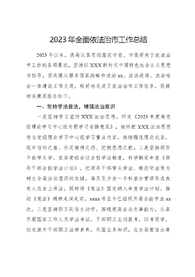2023年全面依法治市工作总结2023年以来,我局认真贯彻落实市委、市政府关于依法治市工作的各项要求,坚持以XXX新时代中国特色社会主义思想为指导,坚决服从服务国家战略和法治xx、法治政府、法治社会一体建设工作大局,较好地完成了依法治市工作任务,现将相关情况报告如下。一、坚持学法普法,增强法治意识一是坚持学习宣传XXX法治思想。印发《2023年度局党组理论学习中心组专题学习安排意见》,始终把XXX法治思想作为党组理论学习中心组学习重点内容,持续强化理论武装,筑牢信仰之基、补足精神之钙、把稳思想之舵。二是坚持领导干部带头学。抓实党组会议会前学法制度,科学制定年度《领导干部会前学法计划》,把领导干部带头学法、模范守法作为树立全局法治意识的关键,每月至少由一个科室分管领导或负责人在会上讲法,同时将《宪法》固定纳入年度学法计划,推动《宪法》精神走深走实。xxxx年至今已组织开展会前学法xx次。三是坚持职工队伍主动学。围绕提高依法办事能力,认真开展国家工作人员学法考试,干部职工主动报考,以考促学,切实提升干部职工法律素养,巩固业务知识,在全局营造出尊法学法守法用法的浓厚氛围。xxxx年我局共计xx名干部职工参加国家工作人员年度学法。四是坚持全面普法深入学。及时制定《xx市xx系统法治宣传教育第八个五年计划(xxxx—xxxx年)》,提高普法工作针对性、实效性;开设法治讲堂,每年邀请资深律师就《民法典》《政府信息公开条例》等法律法规作专题培训,进一步促进干部职工规范履职;贯彻落实谁执法谁普法普法责任制,到建筑工地、居民小区、房地产企业等开展普法活动,现场提供法律咨询服务,赠送普法读本,有效提高群众法律意识。二、健全体制机制,做好法治工作一是抓好决策制度建设。严格执行《重大行政决策程序暂行条例》《xx市市级重大行政决策程序暂行规定》,印发我局《局党组会议事决策规则》和《市xx局行政办公会议议事规则》,将合法性审查作为作出重大行政决策的必经程序,同时深化贯彻落实《xx市法律顾问团管理办法》,积极引导法律顾问参与重大行政决策论证、提供法律意见,确保科学、民主、依法决策。二是抓好重点领域立法。切实执行《立法法》《地方组织法》等法律规定,开展重点领域立法,于xxxx年出台《xx古城保护办法》,以良法促进古城保护利用协调发展,xxxx年启动海绵城市立法调研工作,目前已前往xx开展立法调研。三是抓好文件审查管理。严格执行《xx省行政规范性文件管理办法》,建立健全文件清理长效机制,制发《xx市xx局行政规范性文件管理流程图》,切实做好了行政规范性文件管理工作。今年以来,共计审查行政规范性文件xx件,清理xxxx年至xxxx年底以市政府或市政府办公室名义印发文件xx件。四是抓好矛盾纠纷化解。xxxx年,我局在全省率先成立了建筑行业纠纷人民调解委员会,聚焦矛盾纠纷易发多发领域,围绕xx领域房建、市政项目在施工过程中出现的纠纷,通过协调疏导,促使争议当事人平等协商、互谅互让达成调解协议,从而减轻当事人诉累,达到快速解决争议纠纷的效果。xxxx年x月至今,调委会共调解各类纠纷xxx件,涉及人数xxxx余人,涉及金额xxxx余万元。xxxx年x月,市委全面依法治市委员会办公室将调委会相关工作作为今年xx市法治政府建设特色亮点工作之一报省委依法治省委员会。三、严格规范执法,深化法治建设一是全面落实执法三项制度。制发局《行政执法公示办法》《重大行政执法决定法制审核办法》《行政执法全过程记录办法》三项办法,建立健全长效管理机制,层层压实责任,切实维护公民、法人和其他组织的合法权益。二是严把执法人员入口关。坚决落实未经执法资格考试合格,不得授予执法资格,不得从事执法活动要求,及时组织拟从事行政执法工作的符合条件人员参加年度行政执法通用法律知识考试,严禁无证上岗执法。四、存在的问题及下一步工作打算虽然我们的工作取得了一定的成绩,但按照法治政府建设工作要求,仍然存在以下问题:一是全系统干部职工学法用法意识还需进一步加强;二是法治宣传教育形式较单一,实效性还需进一步加强。(一)进一步树牢法治理念。一是严格落实党政主要负责人履行推进法治建设第一责任人制度,摒弃会上重要、会下次要、工作中不要的做法,坚持以身作则,以上率下,带头学法尊法守法用法,切实做到法定职责必须为、法无授权不可为。二是建立xx领域线上线下法治宣传教育体系,定期聘请专家教授、专职律师以及实践经验丰富的工作人员分门别类地开展讲座、培训,从工作实践入手,突出针对性与实用性,努力提升全系统干部职工的学法用法意识,进一步提高干部职工依法行政的能力。(二)进一步提高普法实效。一是以法治教育为重点,采用上门送法、社区座谈、以案释法等方式,加大普法力度。二是以群众需求为导向,根据群体的差异性,重点加强