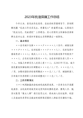 2023年兜底保障工作总结今年以来,县民政局在县委、县政府的坚强领导下,深刻理解把握民政工作关系民生、连着民心的重要内涵,认真践行民政为民、民政爱民工作理念,用心用情有力保障各类困难群众基本生活,织密织牢最低生活保障最后一道防线。一、基本情况××县有城乡低保××××户××××人(其中:城镇低保×××户×××人,农村低保×××户×××人),农村低保中重病患者×××人;残疾人×××人。农村低保对象中有脱贫户×××人,占农村低保对象的××%;全县有特困供养人员×××人,有孤儿和事实无人抚养儿童××人;从2023年7月起,城乡居民最低保障标准分别调整到×××元/人/月、×××元/人/月,分散特困供养标准调整到×××元/人/月,城镇特困人员和集中供养特困人员标准调整到×××元/人/月。二、工作开展情况(一)巩固拓展社会救助兜底脱贫成果。一是常态化开展摸底排查。县民政局将致贫或返贫风险的重病患者、重残人员、脱贫对象等重点人群进行信息比对,将未纳入农村低保、特困人员救助供养等社会救助兜底保障范围的人群信息反馈给乡镇,乡镇根据反馈信息逐人逐户开展排查,筛查出返贫风险较高的脱贫不稳定人口、边缘易致贫人口、因病因灾因疫情因意外事故等刚性支出较大或收入大幅缩减导致基本生活出现困难的人口,根据困难状况建立预警监测台账,实施动态管理。二是进一步落实兜底保障政策。对摸排发现符合社会救助政策的对象及时纳入保障范围,对已纳入低保,但返贫风险较高的,根据家庭情况适度提高保障标准;对重点人群扣减必要的就业产业成本后,家庭人均收入超过当地低保标准的,给予6个月渐退期;对因遭遇突发事件、重大自然灾害、重大家庭变故等原因导致基本生活出现困难、其他救助政策不能解决的家庭及时给予临时救助。三是建立低收入人口动态监测机制。建立县乡村三级低收入人口动态监测机制,县民政局定期开展监测对象享受民政社会救助政策比对将比对情况及时反馈乡镇,通过走访排查,细化救助措施,综合运用各部门现有救助政策,解决实际困难。(二)全面推进社会救助综合改革。坚持放、管、服相结合,全面下放所有乡镇城乡低保、特困供养、临时救助备用金审核确认权限。一是简化办理流程。通过天府救助通智慧救助平台全流程网上办理低保和特困供养的申请受理、审核确认;对申请对象纳入救助无异议的不再开展民主评议,取消审核阶段公示;对于急难型临时救助,可先行救助再完善手续。二是实行先行救助。对低保边缘家庭重病患者、重残人员、可能造成因病因残返贫的脱贫人口按政策纳入低保保障范围,增强抗击贫困的能力;对急难型救助家庭,乡镇(街道)利用临时救助备用金先行救助、再完善手续,使救助更加高效。三是开展异地救助。非居住地户籍的居民,在实际居住地居住满一年以上(含一年),有固定住所且符合社会救助条件的,可在实际居住地申请救助。临时救助不受户籍限制实行全国通办,最低生活保障、特困人员救助供养实行省内通办。(三)完善社会救助制度,提升救助水平。一是强化联动机制。县民政局认真履行牵头职责,充分发挥党委领导、政府负责、民政牵头、部门协同、社会参与的社会救助格局作用,通过日常走访、随机调查、信息比对等方式加强对困难群众的调查核实,确保应保尽保、应救尽救;二是强化主动发现。通过走访排查、信息比对等多种方式筛查需要救助的困难群众,实现社会救助工作从被动申请转向主动发现,由人找政策变为政策找人。三是关爱特殊群体。全面摸排了解辖区内受灾情影响困难群众生活状况,建立受灾情影响困难群众台账。截至目前,已救助××户××人,救助金额××万元。积极开展以救助,让弱有所扶更温馨为活动主题的6·19开放日暨夏季送清凉专项救助宣传活动。共发放各类宣传资料××万余份,夏季防暑物资××余件;对××名子女赡养能力不足入住养老机构(精神病院)的低保对象参照特困人员集中供养标准发放保障金;实施低保调节金补助政策,对重病、困境儿童、精神障碍患者按照××元/人/月,大学生××元/人/月的标准增发调节金补助。三、下一步工作打算一是巩固夯实社会救助兜底脱贫成果,保持过渡期内社会救助兜底政策的稳定性。开展巩固社会救助兜底脱贫成果回头看和农村低保专项治理巩固提升行动,坚决防止发生规模性返贫。二是健全农村低收入人口动态监测机制,准确把握低收入人口动态监测的对象和范围,全面摸排核实低收入人口情况和底数实现对低收入人口的信息汇聚、监测预警和精准救助。三是健全低收入人口分层分类救助帮扶机制,进一步完善提升以基本生活救助、急难救助等专项救助为主体,社会力量为补充的分层分类的救助体系,织密扎牢基本民生兜底保障安全网。