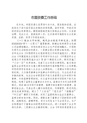 市国资委工作总结近年来,市国资委认真贯彻中共中央、国务院和省委、省政府关于深化国资国企改革的决策部署,落实市委、市政府对国资国企改革要求,围绕做强做优做大国有企业目标,从完善治理、突出主业、提高效率入手,扎实推进市属国有企业改革、发展、创新,取得了阶段性成效。(一)健全工作机制,现代企业制度不断完善。按照XXXXXX两个一以贯之重要精神,将健全党的领导与完善公司治理相融合,将党的建设与企业生产经营相融合,中国特色现代企业制度加快建立。一是健全国企党建1+N机制。在全省率先出台《加强国有企业党的建设工作的实施意见》,配套出台《市属国有企业党建工作考核评价办法》《市属国有企业党建工作责任制实施办法》等15个制度性文件,制定实施了三会一层权责清单,完善了企业党委议事规则,着力推动监管企业将党委参与重大事项决策的内容和程序写入公司章程,将党的领导有效嵌入企业法人治理结构。二是健全市场化的决策机制。大力推进董事会和监事会外部职业化、专业化成员占多数的改革。先后出台专职国有产权代表管理办法和专职外部董事、外部监事管理细则。在全省率先探索专职国有产权代表制度,构建了监管企业董事会内3外4,监事会内3外2的管理模式。选派10名专职外部董事、监事和8名兼职外部董事、监事进驻企业,代表出资人履行决策把关、内部管理、防范风险、深化改革等职能,建立了工作函意见函提醒函纠正函履职工作机制,实现了监管机构与企业及董事会、监事会的有效对接。同时,调整完善了董事会下设的投资与预算、战略规划、薪酬考核、审计与风险4个专业委员会,在产业集团推行了董事会向经理层授权试点,进一步推进了企业市场化改革。三是健全企业激励机制。出台《市国资委监管企业工资总额管理办法》和《监管企业人力资源管理工作指引》,推进全员绩效考核建设,将员工薪酬与企业经济效益、岗位工作业绩有效结合,实现企业内部绩效考核范围全覆盖。大力推行经理层任期制和契约化管理,在去年10家试点子公司取得成功的基础上,今年又对发展集团、产业集团所属部分子公司推行任期制和契约化管理,批准了产业集团跟投实施方案。四是健全队伍建设机制。积极探索职业经理人制度,在全省率先大规模进行国有企业经营管理者的市场化选聘。严格执行定机构、定职数、定岗位、选干部流程,所有员工实行双向选择和竞聘上岗,推动建立员工能进能出、管理人员能上能下、收入能增能减机制,企业人才队伍的创新活力明显增强。同时,平均每年举办企业转型发展等各类专业化培训班16期,全系统所有骨干全部轮训一遍,为企业转型改革提供了人才支撑。(二)突出精简高效,国企资源配置不断优化。按照主业归核、资产归集、产业归位的基本思路,不断推进战略重组和结构调整,进一步优化资源配置和资本布局,初步构建了市属国有企业小总部、大实体的格局。一是精简企业数量。市本级平台公司经过3轮改革重组,逐步从11户清理整合至2户,各企业内部又将主业同质、业务相近的子公司分别归集至各主业板块,共清理减少子公司108家。二是压降人工成本。严格将企业各层级内设机构控制在8个以内,中层管理人员职数精简了30%以上,中层管理人员基本工资标准降低了20%,初步解决了机构臃肿、人浮于事的问题。在全系统人工成本于20XX年实现工资总额从年均7%左右的增长变为下降2%。三是推动结构调整。一方面明确企业主业板块,并规定监管企业主业投资比重必须达到80%以上,推动企业聚焦主业、收缩辅业。另一方面指导企业从实际出发,因企施策推进混合所有制改革,有序推进XX公司通过混改实现低端运营类产业逐步剥离;积极支持企业与双百企业混改,先后参与XX等混改项目,初步实现从资源配置的单一低效转变为多元高效。四是优化资本布局。积极打造上市主体,建工集团作为拟上市主体,积极推进公司重组及股改工作,股改后入围全省拟上市企业名单;投资集团抓住资本市场股价低迷的窗口机遇期,果断收购并控股XX,成为省内首单核准的国企控股民营上市公司案例。大力布局资本市场,推动设立3只政府引导型基金,参与设立和投资16只私募股权基金,基金总规模超400亿元,构建了以产业引导基金为核心、以市场化基金为主力的产业基金群。(三)加速转变方式,企业发展质量不断提高。我市国资国企按照国企改革三年行动和十四五规划的要求,加快转变管理模式和发展方式,企业的发展动能得到增强。一是加速资源集聚。企业以主营业务为基础,充分利用自身的土地、资金优势,积极引进、投资优质的战略性新兴产业、高端装备制造业等符合发展战略的优势产业。国有资本逐步向城乡基础设施建设、公用事业、战略性新兴产业和民生保障等领域集聚。二是加速经营模式转变。监管企业逐渐从过去的土地+信用模式向片区发展+产业投资+资本运营的模式转变,尤其是股权投资和基金投资的比重呈快速上升的趋势