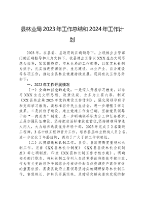 县林业局2023年工作总结和2024年工作计划2023年,在县委、县政府的正确领导下,上级林业主管部门的正确指导和大力支持下,我县林业工作以XXX生态文明思想为指导,紧紧围绕省、市林业局的工作部署,以落实林长制为抓手,扎实推进资源保护、生态建设、林业产业、自身建设等各项工作,推动全县林业健康持续发展。现将有关工作总结如下:一、2023年工作开展情况(一)全面加强党的建设。一是深入开展学习教育。以学习XXX生态文明思想、政策法规、业务为主要内容,制定《XX县林业局2023年党的建设工作计划》,强化局领导班子和支部学习教育,高标准召开民主生活会,进一步增强了学习效果。二是抓班子建设。建立党建工作责任制,坚持党员领导干部一岗双责制度,进一步明确领导职责分工和任务要求。三是加强队伍建设。坚持把政治标准放在首位,坚持精准科学选人用人,大力培养选拔优秀年轻干部,2023年完成了2名高级工程师,3名中级工程师晋升工作,培养基层林业特岗人员2名,进一步优化了年龄结构,调动了广大干部工作积极性。(二)扎实推进林长制工作。县委、县政府高度重视林长制工作,完善《XX县林长令制度》《XX县县级林长会议制度》等七项制度,印发《XX县林长制工作考核方案》,明确相关部门职责。将林长制工作列入各级党委政府绩效考核内容,作为有关党政领导干部综合考核评价和自然资源资产离任审计的重要依据。县委县政府主要领导坚持实地调研督导林长制工作,督促林长、护林员开展巡林,及时研究解决落实发现的相关问题,达到推行林长制,实现林长治。创新城市林长,将全县城市绿地94.77公顷区划为6个网格,每个网格配备1名县级林长和1名林业科技员、1名园林公司工作人员,1名城市管理局执法员。利用怀化国家非物质文化遗产阳戏,将林长制工作编排为原创节目,在全县12个乡镇进行巡回演出,全方位多角度宣传林长制工作,引导社会各界参与林长制工作。(三)坚持依法治理,严格森林资源管理。一是加强限额采伐和林地管理。今年来,共办理商品林采伐证39106立方米,征占用林地手续10宗,面积4.2382公顷,收缴森林植被恢复费86万元。以森林督查为抓手,通过查阅档案资料实地验证的方法,核实林地林木资源变化图斑450个,完成率100%。11月份,森林督查接受国家林草局的复核,检查组给予了好评。二是扎实推进野生动植物保护工作。开展县域内生物多样性本底资源调查,全面完成生物多样性本底资源调查任务;按照政府统筹、属地管理思路,根据古树名木生长位置确定养护责任单位或养护人,完成全县2167棵古树名木责任书的签订;组织林业局、农业农村局、市场监管局、公安局等部门开展代号清风行动,打击违规交易野生动物行动。积极争取上级财政资金建立XX县野生动物救护站,对本县及周边地区受伤的野生动物开展救治工作。XX县生物多样性保护经验在全国推介,成为全国15个优秀案例之一。三是扎实推进森林防灭火工作。面对持续高温干旱天气,县级总林长签发总林长令,要求各级高度重视,克服麻痹思想和侥幸心理,扎实做好森林防火各项工作,全力保障全县森林资源和人民生命财产安全,全县森林火灾受害率控制在0.9‰以下;全面抓紧落实《XX县林火阻隔系统与森林消防蓄水池建设两年行动方案》,完成新建生物防火林带45.96公里,生土隔离带67.77公里,防火道10.94公里,消防蓄水池7个蓄水量1110立方米;创新防火林带建设模式,与松材线虫病除治、油茶产业相结合,在松材线虫病皆伐除治小班,栽植油茶,在袁家镇、桐木镇完成油茶生物防火林带5公里,形成防火隔离带与油茶新造、松材线虫病除治相结合的林火阻隔系统。严格落实管控责任,认真扎实地抓好漏洞排查和火源管理工作,坚决杜绝违规野外用火行为的发生。加大防灭火执法力度,森林公安局与林业执法大队及各乡镇执法队等部门加强森林火灾的查处力度,做到见烟就查,见火就罚,犯罪就抓,依法从快从严打击各种林区内涉火违法犯罪行为。四是扎实推进松材线虫病疫区拔点工作。根据《松材线虫病疫区和疫木管理办法》和《湖南省林业有害生物防治检疫条例》等规定,即时发布松材线虫病灾害蓝色预警,全面清除松枯死木、衰弱木和濒死木,全县共清除枯死疫木8682株。松材线虫病秋季普查,疫点内未发生病死松树。林业有害生物成灾率控制在0.17‰。XX县获2022-2023年湖南省松材线虫病疫木除治优秀单位,在5月26日全省有害生物防治工作会议作典型经验交流发言。目前,正在向国家林业和草原局申请对我县松材线虫病疫区撤销工作进行验收。五是加大依法治绿力度。加强对盗伐、滥伐、非法占用林地、猎捕野生动物、及非法野外用火等违法行为的查处力度。共破获森林刑事案件17起,打击违法犯罪23人,共查处各类行政案件77起,为国家挽回经济损失130余万元,全力确保了森林资源安全。(四)坚持分类管