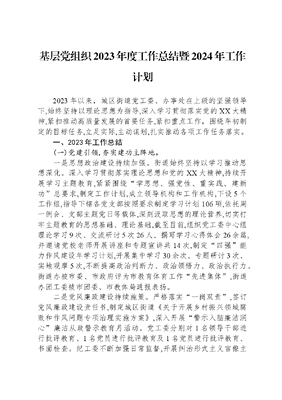 基层党组织2023年度工作总结暨2024年工作计划2023年以来,城区街道党工委、办事处在上级的坚强领导下,始终坚持以理论思想为指导,深入学习贯彻落实党的XX大精神,紧扣推动高质量发展的首要任务,紧扣重点工作,围绕年初制定的目标任务,立足实际,主动谋划,扎实推动各项工作任务落实。一、2023年工作总结(一)党建引领,夯实建功主阵地。一是思想政治建设持续加强。街道始终坚持以学习推动思想深化。深入学习贯彻落实理论思想和党的XX大精神,持续开展学习主题教育,紧紧围绕学思想、强党性、重实践、建新功总要求,制定工作计划,成立领导机构和工作机构,下设5个工作组,指导下辖各党支部按照要求制定学习计划106项,依托周一例会、支部主题党日等载体,深刻汲取思想的理论营养,切实打牢主题教育的思想基础、理论基础,截至目前,组织党工委中心组理论学习9次、交流研讨5次26人、撰写学习心得体会26余篇,并邀请党校老师开展讲座和专题宣讲共14次,制定四强能力作风建设年学习计划,开展集中学习30余次、专题研讨3次、实地观摩5次,不断提高政治判断力、政治领悟力、政治执行力。街道办被市委、市政府评为市教育体育工作先进集体,街道办团工委被市团委、市教体局通报表扬。二是党风廉政建设持续施策。严格落实一岗双责,签订党风廉政建设责任书,制定城区街道《关于开展乡村振兴领域腐败和作风问题专项治理实施方案》,深入开展警示入脑廉洁润心廉洁从政警示教育月活动。党工委分别对1名领导干部进行批评教育、1名党员进行批评教育及1名党员进行批评教育、书面检查。纪工委不断加强日常监督,开展纠治形式主义官僚主义问题专项整治、乡村振兴领域腐败和作风问题专项治理。截至目前,处置问题线索5条,给予1名违纪党员党内严重警告处分、1名党员警告处分、1名党员立案审查、2名党员进行初步核实,严格落实四查四补工作机制,围绕4个方面20项内容,查找短板弱项问题8条。三是基层党组织建设持续推进。结合各社区实际,配齐配强社区工作者,调整补选社区两委成员22人、补选小区支部缺额委员9人、选举物业党支部书记7人、建立社区后备干部台账180人。确定入党积极分子62人、转正党员17人。公开招聘专职网格员27名。任命11名派出所民警担任社区党组织副书记,聘任8名派出所民警担任社区法制副主任。实现一街道一库、一社区一册、一后备一表,基层党组织人员配置进一步优化。四是基层阵地建设持续发力。协调整合物业、业委会用房,通过腾、挪、合、借等方式新增邻里驿家阵地资源5处并投入使用。开展小微邻里活动1172场次、参与人数31695人,邻里和谐文化氛围日益浓厚。设置邻里读报点、邻里充电站等惠民设施,以15分钟便民服务圈为半径,集合小区医疗、养老托幼等多项民生服务。五是新就业群体队伍持续壮大。聚焦新业态新就业群体兜底服务,建立两新群体台账149人。依托党支部、邻里驿家等阵地,建立暖心驿站行业之家等志愿服务站15个,为两新群体提供关爱服务举办集体生日,开展应急救护培训5期。聘任两新群体兼职网格员150余名,参与社区治理。成立移动卫士等志愿服务队4支,创新设置两新双向积分服务卡。扎实推进在职党员到社区报到。为基层社区治理注入新生力量,推动基层社区治理提质增效。关爱、服务两新群体工作在人民网、人民日报等媒体刊登。六是党建资源持续盘活。高效推进党建联席会机制,签订一书三单134份。落实在职党员双报到、双报告,充分发挥街居吹哨、部门报到优势,推行群众点单、社区派单、党员接单模式,组织在职党员认领微心愿431个,力所能及地为群众解决实际困难,街道及社区召开党建联席会40次,协调解决群众急难愁盼问题230个。推动在职党员到居住小区参与形式多样的志愿服务超过1200余人次。(二)统筹推进,基层治理成效明显。一是强化人员培训,提升社区工作者综合素质。开展社区两委班子届中分析工作,深入了解各社区两委班子运行情况。组织开展社区书记、网格员擂台大比武以及晾晒比促等活动10场次,依托社区工作者实训基地举办社区工作者综合培训班3期,高效运转导师帮带工作机制,结对导师帮带10对,开展导师帮带活动4场次,申报导师帮带项目2个,有效提升了社区工作者能力素质。二是齐抓共进,推动社会组织协商议事。积极推动社会组织及社团建设,新增备案类社会组织11家、过期重新备案类社会组织2家,现有未过期有效的社会组织25家。开展多种形式民主协商活动17场次,收集民生领域实事议题19条。134名网格员下沉社区,入户12763户,梳理解决群众急难愁盼问题434条。三是聚焦安全生产,深入开展排查整治。压实街道安全防范工作责任,街道包抓社区领导带队实地督导检查,出动355人次、巡查小