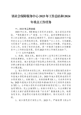 镇社会保障服务中心2023年工作总结和2024年重点工作任务一、2023 年工作总结2023年以来,XX镇城乡居民养老保险、城乡居民医疗保险、便民服务中心管理、红十字会、医疗保障等服务性工作工作在镇党委、政府的正确领导下,坚持以XXX新时代中国特色社会主义思想统领全局,紧紧围绕以人为本,为民解困,为民服务的核心工作理念,按照年初的工作部署,开拓进取,扎实工作,取得了较好的成绩,进一步推进了我镇社会保障服务中心工作的全面发展,现将2023年的工作情况总结如下。(一)工作开展情况1、热情、高效为民,做好社保中心各项日常工作和群众来访的政策解答,社保中心是一个窗口部门,主要承担着城乡居民养老保险、城乡居民医疗保险等业务的办理。同时积极向来访群众解答城乡居民医疗保险和城乡居民养老保险等惠民政策和办理流程。2、城乡居民养老保险工作。养老保险作为国家惠民政策中的重要部分,在上级业务部门的指导和帮助下,积极开展2023年度城乡居民养老保险征缴工作,2023年城乡居民养老保险符合续保XX人,收缴XX人,未续保缴费XX人,完成参保率X%;2023年度城乡居民养老保险年满60周岁并已领取养老保险金XX人;全年城乡居民养老保险新参保登记52人;维护系统信息XX条;死亡注销XX人;社保卡申领3人;社会保障扩面及建立完善扩面提质增效对象实名库数据采集工作,梳理信息X条,目前再次对信息进行数据核对,核对完成录入省系统。3、城乡居民医疗保险工作。2023年,严格按照《保山市城乡居民医疗保险暂行办法(修订)》中规定审核、补偿参保居民的医疗费用(截止10月16日县外零星报销26人次,审核报销资金XX元;医疗救助报销1人次,审核报销资金XX元);新参保登记XX人;信息维护XX人;开具基本医疗保险参保证明33人;缴费数据核查XX人次(县内居民缴费XX人、县内职工XX人、省内大学生XX人、县外省内居民XX人、县外省内职工XX人、省外居民XX人、省外职工XX人、服役X人、服刑X人、失联X人、死亡XX人、未缴费XX人其中不愿意缴费XX人、其他原因未缴费491人);2023年城乡居民医疗保险应参保XX人,征缴任务数XX人,实际参保缴费XX人,参保率XX%,执行率XX%,根据文件规定2024年度城乡居民医保个人缴费标准为每人XX元,我镇目前已安排启动了2024年城乡居民医疗保险征缴工作。4、便民服务中心管理工作。便民服务中心进驻事项95项,2023年1至9月,共办件XX件,办结XX件,群众满意度XX%,无超时件发生,便民服务中心零举报、零上访;12345政府热线共答复办结13件;梳理权责清单XX项,行政职权对应的责任事项1241项,追责情形1776项;2023年公共资源交易:全年共交易1宗,共计交易资金22万元。(二)主要做法1、城乡居民养老保险工作。一是加强组织。为确保工作顺利推进,在镇党委、政府主要领导亲自带头,分管领导具体负责的前提下,各村调整充实了领导小组,并明确社会事务员具体负责城乡居民社会保险业务工作。同时,我镇大力推行领导包村、镇、村干部包组的工作机制,把工作任务层层分解到村组、落实到个人,实行目标责任考核,将必要的工作目标列入村级考核内容,有力地促进了全镇参保工作的健康发展。二是加强政策宣传。按照以人为本、方便群众、注重实效、农民自愿的原则,全力以赴地做好群众工作,夯实思想基础。2023年,我镇各村工作人员结合其他工作的整体推进深入田间地头、进村入户宣传城乡居民社会保险的重要意义、基本原则和政策法规,把意义讲透、政策讲准、内容讲清,使城乡居民社会保险这一重大的惠民政策家喻户晓,最广泛、最充分地激发和调动适龄群众的参保热情。三是加强经办服务。社保中心做为全镇的经办服务机构,依托现有的机构、人员和信息系统平台,按上级的统一安排部署建立健全完善了村级经办机构,各村设一名专职经办员,配置好了必要地设施设备,改善了工作条件。为开展好工作,我镇于征缴前加强工作人员业务培训,使其尽快熟悉和掌握政策法规,为参保人提供便捷、高效、优质的服务。四是加强基金监管。城乡社保基金是参保居民的养命钱,确保基金的规范管理和安全,直接关系到广大参保群众的切身利益,关系到城乡居民社会保险事业能否持续健康发展。2、城乡居民医疗保险工作。一是加强组织领导,抓好民心工程。城乡居民医疗保险工作在我镇得到了党委、政府的重视,实行党政一把手亲自抓、分管领导具体抓。其次,把县政府提出的工作目标,进行层层分解,落实到乡、村和干部,同时把此项工作纳入年度目标考核的内容,因此为推动城乡居民医疗保险工作奠定了良好的基础。二是分工协作,大力宣传。达到农民自愿参保,宣传工作是关键。要求工作人员吃透精神、掌握政策要领。通过开展培训、交流、讨论、等多种形式,让参与开展城乡居民医疗保险工