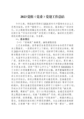 2023党组(党委)党建工作总结今年以来,党组始终坚持以XXX新时代中国特色社会主义思想为指导,把牢围绕中心、建设队伍、服务群众职责定位,以主题教育统领融合机关党建、模范机关和文明单位创建,创新打造四化四抓四强的党建工作模式,推动机关党建引领机关建设始终走在前、作表率。一、基本情况(一)系统化抓教育,强化理想信念立足自身职能,指导督促各基层党组织和全体党员干部投身主题教育。一是理论学习上下联动,学习内容突出特色。制定2023年度党组中心组学习计划,创新学习研讨模式,科学统筹专题读书班与中心组学习安排和内容,每次学习研讨领导班子、处室单位主要负责同志、青年代表发言,确保学习研讨的广度、深度和实效,今年已开展中心组学习12次,累计48人发言。第一时间为各基层党组织和离退休干部发放主题教育指定书目X余册,坚持用什么学什么梳理印发XXXXXX关于本部门本领域重要论述、重要讲话汇编。高质量编制理论学习清单,细化为10种学习形式37项学习任务,明确完成时限、牵头单位和责任单位,确保理论学习各项任务扎实推进。二是突出学用结合,推动主题教育成果向基层延伸。坚持基层是一切工作的落脚点,印发关于学习《XXX著作选读》等学习材料的通知,要求各基层党组织制定支部学习计划和个人自学计划,形成全员学习的良好局面。组织各基层党组织开展献良策、解难题、建新功活动,设计11项活动载体,各基层党组织开展主题活动40余次。实施党建联动行动,建立困难问题、创新举措、政策措施、服务成效四张清单,根据共建企业需求,协调组织相关部门开展现场调研,为企业解读政策破解难题,以党建第一责任引领保障发展第一要务,调研做法在多家媒体发布。三是开展系列活动,营造全员参与的浓厚氛围。注重在沉浸式学习体悟中加深理解认识,立足干部需求和岗位特点,组织党员干部赴党性教育基地、保密教育基地等开展党性教育。坚持以讲促学、以赛促学,以青年干部为重点开展主题演讲比赛,提交作品30篇;以中层干部为重点开展建功新时代争做排头兵业务大比武,组织干部上讲台述理论、述典型、述对策,打造政治过硬、业务精干的排头兵干部队伍。统筹领导班子专题党课计划,部署开展书记第一讲我来讲党课活动,丰富活动载体,引导党员干部做到学思践悟、融会贯通。(二)标准化抓管理,强化责任落实认真落实新时代党的建设总要求,全面提升单位党的建设工作质量和水平,为中心工作高质量发展提供有力支撑。一是坚决扛牢机关党建责任。紧紧抓住落实主体责任这个牛鼻子,印发年度机关党的工作要点,制定党组、党组书记、党组成员抓基层党建责任清单,明确党建工作重点任务。高质量召开民主生活会,制定整改落实方案。针对党组书记抓基层党建述职反馈意见,细化为18项具体落实举措,确保问题整改见底到位。二是提高支部标准化建设水平。持续增强党组织政治功能和组织功能,组织召开基层组织书记抓基层党建述职评议会议,制定支部标准化建设责任清单,明确有关考核标准,合理设置激励指标和约束指标。各支部高标准制定年度工作计划,突出特色亮点工作,形成党建业务融合的发展合力。开展党务干部培训,进一步提高履职能力。打造季度督查,年度评估的党建督查机制,上半年重点对支部生活落实情况开展督查,梳理反馈共性问题20条,个性问题50条,下半年开展党建联建活动的支部从10个上升到20个,实现了全覆盖,利用官网、公众号等开展宣传30余次,较上半年的15次大幅提高。三是全面落实意识形态工作责任制。印发年度意识形态工作要点,按季度开展分析研判,组织半年意识形态工作总结,党组会专题研究意识形态工作,牢牢掌握党对意识形态工作领导权。(三)常态化抓作风,强化监督管理一是聚焦作风促发展。坚持问题导向,年初组织召开党风廉政建设会议和履行全面从严治党责任述职会议,开展廉政谈话,制定纪检工作要点,层层签订党风廉政建设责任书。发布加强全体党员干部作风能力建设倡议书、文明礼仪倡议书等,切实把作风建设抓牢抓深抓实。二是创新形式塑品牌。充分发挥廉洁文化的价值导向功能,制定《廉洁文化创建专项行动工作方案》,通过专题学习研讨、廉洁文化讲座、年轻干部心得体会交流等系列活动,增强干部廉洁从政意识和拒腐防变能力,着力打造特色廉洁文化品牌。三是加强监督提质效。做细做实日常监督,积极参与监督单位开展的联合调研监督,对重点业务部门、重要业务环节开展重点监督,进行集体廉政谈话,对重点项目评审、现场考察等监督20余次,以有效监督促进业务工作规范化、上水平。四是深化教育筑防线。充分挖掘典型案例警示教育意义,汇编并下发XXXXXX关于全面从严治党重要论述、警示教育典型案例,邀请有关专家学者专题授课,组织参观廉洁文化图书馆、廉政教育馆,举办廉洁书画展文韵笔墨丹青绘清风摄影书画展,营造风清气正良