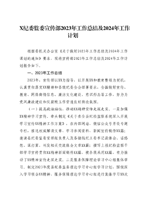 X纪委监委宣传部2023年工作总结及2024年工作计划根据委机关办公室《关于做好2023年工作总结及2024年工作谋划的通知》要求,现将宣传部2023年工作总结及2024年工作计划报告如下。一、2023年工作总结2023年,宣传部以XX为指导,以开展XX和教育整顿为契机,认真贯彻落实XX精神和各级纪委全会部署要求,全面做好宣传、教育、网络舆情信息、廉洁文化建设、意识形态等工作,努力为党风廉政建设和反腐败工作营造良好舆论氛围。(一)提高政治站位,推动XX精神宣传走深走实。一是加强XX精神学习宣传。牵头制定《关于在全县纪检监察系统深入开展学习宣传XX精神工作方案》,在内部网站、微信公众号开设专题专栏,推送权威解读文章、学习参阅资料、新闻宣传稿件XX篇;邀请县纪委监委室部组负责人及各镇街纪工委书记谈体会、话感想、谋打算,刊发相关交流体会文章XX篇;撰写上报纪检监察干部学习宣传贯彻XX精神新闻稿件XX篇,被各级采用XX篇,有力推动了XX精神宣传走深走实。二是服务保障理论学习中心组集体学习。制定2023年度县纪委监委理论学习中心组学习计划,围绕深入学习领会XX精神,服务保障理论学习中心组进行集体学习XX次认真履行学习贯彻XX思想和教育整顿宣传教育组职责,聚焦学习教育环节目标任务及时做好学习资料编发推介工作,跟踪督导指导各部室组开展学习研讨XX次,组织召开集中研讨交流会XX次、主题研讨会XX次。(二)聚焦主责主业,新闻宣传提质增效。一是加大对上对外报道力度。加强与上级新闻媒体沟通,深化与县级媒体协作配合,加大对全县纪检监察工作经验成果的宣传展示力度,全年在县级以上新闻媒体刊播稿件XX篇,其中在中央级媒体刊播稿件XX篇、省级媒体刊播稿件XX篇、市及媒体刊播稿件XX篇。二是跟进做好专题报道。注重主题策划,开展更有深度、有看头、有感染力的系列宣传报道,集中开展学习宣传贯彻XX精神学习贯彻XX思想纪检监察干部队伍教育整顿和规范化法治化正规化建设宣传,被各级新闻媒体和纪检监察报刊、网站、信息采用XX篇次。重视加强网评员队伍建设,组织网评员撰写网评文章XX篇,择优向省纪委监委报送XX篇,被采用XX篇次。(三)聚焦两类干部群体,精准开展靶向教育。一是开展新任职干部任前教育。对今年新提拔任职的XX名干部,采取县纪委书记开展一对一谈心谈话+召开新任职干部廉政教育大会+观看教育片警示片+发放案例剖析教育读本+现场签订承诺书等形式,对新任县管领导干部开展精准靶向廉洁从政教育;延伸开展家庭促廉座谈会,组织全县XX名党政一把手家属集体座谈集中学习《XXXXXX关于家庭家教家风建设重要论述摘编》,发放家庭助廉倡议书,并签订家庭助廉承诺书,倡导领导干部家属守好家门、把好大后方,发挥家庭助廉宣传员、监督员、守门员作用,切实担负起家庭反腐倡廉责任,经常过问干部的社交圈生活圈朋友圈,该提醒的及时提醒、该制止的坚决制止。二是开展年轻干部系好廉洁从政第一粒扣子教育。与县委组织部联合印发《关于开展年轻干部系好廉洁从政第一粒扣子教育工作方案》,采取开展关爱式谈心谈话沉浸式专题教育、菜单式廉政授课、案例式警示教育、互动式座谈交流等形式,教育引导年轻干部系好廉洁从政第一粒扣子,今年以来,已有XX名年轻干部接受了廉洁从政专题教育。(四)坚持一体推进,推动廉洁文化建设任务落实。一是发挥组织推动作用。协助县委印发《关于加强新时代廉洁文化建设的工作措施》,制定年度工作要点,协调各监督检查室及镇街纪工委和县纪委监委相关派驻机构,督促推动各级党组织抓好新时代廉洁文化建设工作,推进廉洁文化建设在各领域、各层面落地落实。二是抓好载体平台建设。积极创新思路、丰富载体,深入推进廉洁教育、警示教育、廉洁文化建设常态化,以文化感召力传递清廉涵养正气,在全县打造廉洁文化公园XX个,在县图书馆设立廉洁图书专区,建强廉洁文化阵地;与县妇联联合开展家庭助廉行动,推进廉洁文化进家庭;开展廉洁文化教育示范点评选经申报推荐、考核验收、评议等环节,共评出廉洁文化示范点XX个;积极打造集思想性、艺术性和观赏性于一体的廉洁文化长廊XX处,对廉政教育专栏内容及时更新,保证内容丰富、规范、警示教育性强,让廉洁文化建设更加接地气、聚人气、显生气。(五)做深做实警示教育,加强阵地建设。一是开展现场教育。全面提升县警示教育基地,及时更新严重违纪违法典型案例XX处,更换版面、视频XX个,分XX批次组织XX名党员干部、公职人员接受警示教育,并深化教育效果,组织各镇街纪工委、各派驻机构及时跟进对驻在部门单位开展廉政提醒谈话XX人次。二是开展案例教育。选取我县查处的XX等严重违纪违法案例摄制警示教育片XX部,编印警示教育读本XX册,指导开展有针对性的警示教育,组织XX人次