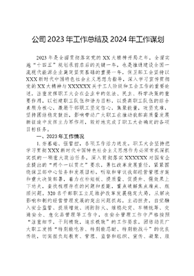 公司2023年工作总结及2024年工作谋划2023年是全面贯彻落实党的XX大精神开局之年,全面实施十四五规划承前启后的关键一年,也是推进建设全国一流现代能源企业奠定坚实基础的重要一年,保卫部工会坚持以XXX新时代中国特色社会主义思想为指导,深入学习宣传贯彻党的XX大精神与XXXXXX关于工人阶级和工会工作的重要论述,注重发挥职工大会在企业中的依法、民主、科学决策的重要作用,以创建职工队伍和谐为目标,以提高职工队伍的综合素质为核心,激励干部职工坚定信心,集聚能量,攻坚克难,坚持团结稳定鼓劲,影响带动广大职工在推动我部高质量发展新征途中发挥主力军作用,较好地完成了职工大会确定的各项目标任务。一、2023年工作情况1.夯基础、强管控,各项工作活力迸发。职工大会坚持把学习贯彻XXX新时代中国特色社会主义思想作为必须常抓深抓实抓的一项重大政治任务,深入贯彻落实XXXXXX对国有企业提出的两个一以贯之要求,勇扛改革发展重任,紧紧围绕保卫部中心任务和发展目标,听取和审议我部经营管理方案和重大决策部署,着力在补短板、提质量、促提升、强效果上下功夫,查找梳理存在的问题和差距,重点破解焦点难点、瓶颈问题,320名干部职工立足维护改革发展稳定大局,从解决影响和制约经营管理发展的突出问题抓起,主动担责,自觉融入安全监管、提质增效、消防防火、维稳处突、车辆统筹、交通安全、危化品管理等工作中,在安全管理工作中严格按照注重细节,干到精致,追求极致的工作要求,团结动员广大职工发扬特别能吃苦、特别能忍耐、特别能战斗的优良传统,切实担负起教育、管理、监督和组织、宣传、凝聚、服务群众的职责。通过争做政治过硬的表率、安全监管的表率、坚守初心的表率,当好维稳处突的先锋、内部安保的先锋、攻坚克难的先锋,全力落实职工大会各项决议。一是认真落实第一议题制度,将党的创新理论学习摆在培训工作的首位,分清学习培训内容主次,切实做到学以致用、融会贯通,结合我为群众办实事实践活动,将XXXXXX重要讲话和指示批示精神等内容,纳入干部职工培训内容,运用培训班、读书会、专题栏、线上线下等多种形式,推动学习贯彻不断引向深入。二是在部领导班子的统一领导下,班子成员认真履责,勇扛企业改革发展重任;党员干部主动担责,以十化规定(举止文明化、会议规范化、仪表整洁化、接待正规化、场所功德化、工作精细化、管理人员示范化、办事高效化、考核严格化、奖惩制度化)、三讲一守(即:讲政治、讲规矩、讲良心、守纪律)及五到(身到、心到、眼到、手到、口到)工作法要求,不断提高工作业绩和工作效能。截止目前,组织集中学习10次,领导班子成员撰写心得体会、研讨材料7篇,编印《政策宣讲资料》6期,在多个媒体上发表稿件、经验材料等96篇,进一步向公司内部和公众展现一个真实、立体、全面的保卫队伍。三是及时发现苗头性、内幕性信息,超前做好重点人群稳控、矛盾纠纷化解和突发事件应对工作。特别是在集团公司重大改革方案出台、重大项目建设等方面保持政治敏锐性,防止了群体性事件的发生;整合各单位信访、维稳队伍,实行信息定期报告制度,将各单位掌握的信息进行集中归类,从中发现共性的矛盾和问题,再深入基层进行再调查、再分析,防止了个别单件的个性化矛盾演化成为群体性、全局性矛盾。截止目前共排摸上报信访维稳重大信息×条,为集团公司超前防范、及时化解矛盾提供了更为有利的依据。截止目前,没有出现因群体上访影响生产经营及社会稳定的治安问题;重要节点对矿区缠访户*进行24小时稳控,全面完成了省政府国资委和集团公司党委要求的北京不去、省内不聚、跨省不窜、网上不炒的目标。2.强基础、固根本,依法保障职工权益。坚持促进发展、维护职工权益相融合,充分发挥桥梁纽带作用,深入开展调查研究,认真了解职工工作、生活情况和思想动态,畅通信息渠道,善于发现问题,解决问题,引导职工增强集体观念,正确处理得与失的关系,调动职工自觉维护集团公司和谐稳定与发展的大局。一是强化薪酬分配管理,实行岗位工资、绩效工资相结合的薪酬制度,实行向基层一线的工种岗位人员倾斜的分配政策,打破部室大锅饭工资分配格局,遏制了所有干部职工慵懒散,推托混的工作现象,逐步从量上的变化转化到质上的提升。二是强化劳动用工管理。为了维护集团公司整体利益和全体职工的合法权益,建立企业内部和谐稳定的劳动关系,协调处理劳动争议,调动广大职工的工作积极性和主动性,年初签订了《工资集体协商专项集体合同》《劳动安全卫生专项集体合同》《女职工权益保护专项集体合同》,严格按照合同各项条款,结合我部实际,组织开展集体协商,切实保证集体合同和三个专项合同全面履行。通过建立企业和谐稳定劳动关系,依法保障企业和职工合法权益,进一步助推了我部高质量发展。三是强化劳动保护管理。高度重视劳动安全卫生工