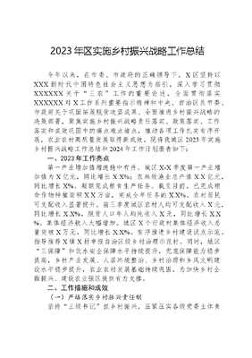 2023年区实施乡村振兴战略工作总结今年以来,在市委、市政府的正确领导下,X区坚持以XXX新时代中国特色社会主义思想为指引,深入学习贯彻XXXXXX关于三农工作的重要论述,全面贯彻落实XXXXXX对X工作系列重要指示精神和中央、自治区及市委、市政府关于巩固拓展脱贫攻坚成果、全面推进乡村振兴战略的决策部署,聚焦实施乡村振兴战略责任落实、政策落实、工作落实和成效巩固中的痛点难点堵点,推动各项工作扎实有序开展,农业农村高质量发展取得新成效。现将我城区2023年实施乡村振兴战略工作总结和2024年工作计划报告如下:一、2023年工作亮点第一产业增加值增速稳中有升。城区X-X季度第一产业增加值为X亿元,同比增长X.X%;农林牧渔业总产值X.X亿元,同比增长X%。超额完成粮食生产任务。截至目前,已完成粮食作物种植面积X.X万亩,完成全年任务的X.X%。农村居民可支配收入显著提升。前三季度城区农村人均可支配收入X元,同比增长X.X%,脱贫人口年人均纯收入X元,同比增长X.X%。集体经济收入大幅增加。城区X个行政村集体经济收入总量突破X万元,同比增长X.X%。有序推进乡村建设试点示范。指导推荐X镇X村申报自治区级乡村治理示范村。同时,城区三保障和饮水安全保障水平持续提升,兜底保障能力稳步提高,乡村产业发展、人居环境整治、乡村治理和乡风文明建设水平稳步提升,农业农村发展基础持续巩固,为加快乡村全面振兴、建设农业强区提供有力支撑。二、工作措施和成效(一)严格落实乡村振兴责任制坚持三级书记抓乡村振兴,压紧压实各级党委主体责任,形成区委书记带头抓、分管领导具体抓、各级各部门共同抓的工作格局。今年以来,组织召开区委农村工作(乡村振兴)领导小组会议X次、实施乡村振兴战略指挥部会议X次,深入研究衔接推进工作,协调解决项目建设、防返贫监测、产业发展、三保障及饮水安全等相关事项。落实领导联系挂点工作机制,安排X位处级领导挂点到村,深入开展督查指导。(二)夯实乡村振兴组织保障配强农村工作干部队伍,健全完善村级后备人才库。调整优化储备村级后备人才X人,平均年龄X.X岁,选派驻村工作队X人。组织科技特派员、科技专家等专业团队下乡X人次,举办各类农技培训X场,受益种植养殖群众X人。落实归雁计划,引导X名大学生,X多名企业家、创业能人、农民工回乡工作创业;完成招聘录用乡村教师X名、基层医疗卫生事业单位工作人员X名。(三)坚决守牢粮食安全全方位夯实粮食安全根基,不断巩固和提升粮食综合生产能力。一是超额完成粮食生产任务。截至目前,城区完成粮食作物种植面积X.X万亩,完成全年任务的X.X%,收获夏粮X.X万吨,秋收各项工作有序推进,预计可圆满完成生产任务。二是严格耕地种植用途管制。加强粮食功能区监管,对已划定的X.X万亩粮食生产功能区开展回头看和粮食生产功能区补划,扎实推进非粮化整改。三是抓好落实惠农政策。累计发放2022年、2023年各项支农惠农补贴X.X万元,资金拨付率均达X%,惠及农户近X万户,进一步提高农民种粮积极性。(四)坚决守牢防止返贫底线加强防返贫监测,监测对象全部落实针对性帮扶措施,目前辖区内没有出现返贫致贫情况;落实X+X保障政策,进一步巩固义务教育控辍保学成果,城区现无失学辍学学生;保障农村医疗救助,脱贫人口、监测对象医保参保率达X%;完成X户农村危房改造,农村饮水安全合格率X%;落实农村低收入人口兜底保障政策,把符合条件的困难群众精准纳入农村低保、农村特困供养,系统化解返贫致贫风险,织密兜牢农村脱贫人口和低收入家庭的生活保障网。(五)多渠道促进农民持续增收一是大力发展特色优势产业,落实特色产业奖补政策,提高农户收益。2023年度城区落实各级衔接资金X万元,有力促进帮扶产业发展。二是培育发展新型农业经营主体,压紧压实联农带农责任,带动农户持续增收。目前城区X个脱贫村共有新型农业经营主体X家,带贫率达X%以上。三是加大就业帮扶力度,做好乡村公益性岗位开发和人员安置工作,利用就业帮扶车间带动农民就地就近就业。截至X年X月,城区脱贫人口年人均纯收入X元,较上年增长X.X%,年人均纯收入低于X元的脱贫人口已清零。(六)加快推进现代农业发展大力发展设施农业,积极推动传统种养殖业转型升级。目前已建成设施种植业面积X.X万亩;已建成牧原、雄桂等大型养殖基地,年出栏肉猪X万头以上;已建设陆基圆池X亩、工厂化养殖车间X多亩,有X鳗鱼、X澳洲龙虾等特色健康水产品基地。高质量发展现代种业,打造现代种业全产业集群。目前辖区内种业企业集聚,多个种业项目在研,在家禽、蔬菜、水果等新品种、新技术研究上取得显著成绩。高质量建设农业产业示范区,今年新增自治区四星级现代特色农业示范区X个,累计建成并获认定的农业产业示范区X个,涵盖休闲农业、特色种养等优势产