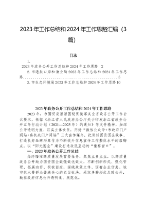 2023年工作总结和2024年工作思路汇编(3篇)目录1.2023年政务公开工作总结和2024年工作思路22.市港航口岸和渔业局2023年工作总结和2024年工作思路53.市生态环境局2023年工作总结和2024年工作思路102023年政务公开工作总结和2024年工作思路2023年,市国资委紧紧围绕贯彻落实全省政务公开工作会议要求,根据《浙江省人民政府办公厅关于印发浙江省政务公开五年行动计划(2021—2025年)的通知》等文件精神,加深公开透明力度、压实主体责任,用好微信公众号+市政府门户网站+委机关门户网站三大宣传媒介,把讲好国资国企故事、打造良好品牌形象作为不断提升信息宣传工作整体水平的落脚点,以阳光国企建设打造政民互动的重要窗口。一、2023年政务公开工作总结始终瞄准高质量发展首要任务,聚焦主责主业,以高质量政务公开助力国资国企做强做优做大,不断创新形式、强化管理、拓展内容、积极回应,围绕政策文件、国有企业信息、城市供水等群众普遍关心的栏目板块,采取多种形式及时公开,助推政府信息公开透明化、规范化。(一)加强管理规范,让主体责任落实到位。市国资委高度重视政务公开工作,紧扣全年政务公开工作要点,健全完善工作体制机制,切实发挥好信息员、评论员、舆情监测员近200人的全市国资系统的人才队伍优势,落实主要负责人亲自抓、分管负责人具体抓的工作要求,对政务公开信息的审核、发布和维护三环节的工作人员实行专岗专责,确保发布的各类信息符合《中华人民共和国政府信息公开条例》和相关法律法规的规定,保证信息和发布数据的合法性、及时性和有效性。(二)强化特色宣传,让企民互通践行见效。精细化梳理政务公开事项,更全面、更充分的编制政府信息公开目录,本着公开是原则,不公开是例外的原则,对拟出台的政策文件草案,通过市政府门户网站、公众号平台等新媒体,广泛集民智、听民声,切实提高政策文件的可行性,增强政府公信力。按谁起草谁解读原则,将政策文件与政策解读联动,以图文结合的形式让政策解读变得生动形象。通过政府门户网站,在公共企事业单位栏目中对城市停水、低压供水、供水管道维修等群众关注的焦点、热点问题进行及时更新,共计8条;在建议提案栏目中公开分列人大建议、政协提案两种方式共计主动回应社会关切信息6条;利用微信公众号政务新媒体,开设聚焦市场化机制改革、双百工程·党员先锋、实干建新功、清廉国企等专栏,截至11月份,用户总人数累计突破17500+,推送信息(包含原创)近500篇。(三)聚焦重点领域,让政务公开提质增效。今年以来,市国资委围绕群众切身利益深化政务公开,对市政府门户网站的重点领域信息公开专栏所包含的财政信息、人事信息、国有企业信息等方面内容重点维护,关键信息及时发布,共主动公开信息333条,其中信息报道180条、通知公告(人事招聘)133条、专其他公开信息20条;共整改错述251个、错字8670个,处理错链689个。存在问题:2023年市国资委在积极开展政务公开的同时,对比群众要求,仍然存在一些不足,如公开板块还不够多;公开内容上不够全面细致;政策解读有待优化;信息发布及时性还可以加强等。二、2024年政务公开工作思路结合党的XX大精神和XXXXXX考察浙江重要讲话,继续在政务公开工作的机制上、公开力度上、实质内容上加强完善。(一)提高工作能力,努力把握好信息人才队伍的建设,确保协同高效有序管理。扎实开展信息员队伍的管理及培训,重点围绕舆情信息撰写、政策文件解读、群众需求回应等方面做好精细化管理整改,努力打造阳光国资国企。(二)优化政务服务。在建立健全政务公开工作体制机制的基础上,加强组织领导和系统化管理,以内容建设为根本,不断对发布、审核、维护等功能逐一标准化、精细化、规范化,在各环节明确要求和职责,不断提升政务公开和政务服务水平。(三)畅通政民互动。充分运用政务新媒体、政府网站、政务热线等平台听民意、解民忧,走深走实走好群众路线,通过新媒体传播速度快、覆盖面积大、宣传形式活等优势,注重结合重大活动、重要节日等设置话题、策划活动,探索政民互动新方式。市港航口岸和渔业局2023年工作总结和2024年工作思路2023年,在市委市政府的坚强领导下,我局全力奋进三高三新,主动践行大食物观和向海图强战略,努力开创港航口岸和渔业事业高质量发展新局面。1-10月份,全市水产品总产量XX万吨,同比增长4.51%。一、工作成效(一)口岸能级稳步提升。口岸营商环境持续优化,XX港被列为启运港退税政策试点。1-9月,XX口岸进出口货物吞吐量XX万吨,同比增长7.51%。XX港口岸扩大开放已做好国家验收准备。(二)现代渔业赋