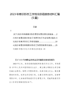 2023年意识形态工作情况总结报告材料汇编(5篇)目录1.关于2023年网络意识形态责任制落实情况的报告.22.2023年落实意识形态工作责任制工作总结情况报告.63.2023年意识形态工作总结报告.104.2023年落实网络意识形态工作责任制情况报告..155.2023年意识形态工作情况总结报告19关于2023年网络意识形态责任制落实情况的报告2023年以来,局党组高度重视网络意识形态工作,贯彻落实《中华人民共和国网络安全法》,建立健全网络安全责任制实施办法要求,紧盯工作整体要求,找准关键立足点,强化重要组织领导,发挥先进思想引领,注重正面舆论宣传,坚持管用防并举,扎实做好网络意识形态管理工作。现就网络意识形态工作责任制情况报告如下:一、工作情况(一)以组织领导促责任落实。局党组高度重视网络意识形态工作,及时召开全体会议传达学习了《贯彻落实〈中华人民共和国网络安全法〉建立健全网络安全责任制实施办法(试行)》文件精神,成立以局主要领导任组长,分管领导任副组长,各股室负责人为成员的网络意识形态工作责任领导小组,领导小组下设办公室,安排专人负责单位网络意识形态日常工作。将网络意识形态工作作为年度工作的重要内容,纳入2023年度意识形态工作责任制和精神文明(文明单位)创建相关考核。以考核为基础,全面印发《网络意识形态安全管理制度》《网络舆情应急处置工作机制》《网络意识形态工作责任制》等多个制度文件,细化责任,明确落实,保障安全。将分析研判意识形态领域情况纳入重要议事日程,确保每季度召开一次专题会,分管领导每月听取一次分管科室关于网络意识形态领域情况汇报,主要领导每季度听取班子成员就分管领域关于网络意识形态工作情况汇报,全委全年累计开展网络意识形态工作专题研讨会x次,主要领导听取汇报x次。(二)以理论武装促思想认识。以学习型党组织建设为平台,主动宣传,先声夺人,将网络意识形态学习纳入干部职工会学习内容,开展专题学习XXXXXX关于网络意识形态工作的重要指示精神、关于加快网络强国建设的重要论述等重要论述及《中华人民共和国网络安全法》《中华人民共和国数据安全法》等法律法规,认真学、深入学、扎实学,以学思践悟,让思想与工作融会贯通,进一步增强干部职工的政治意识、大局意识、核心意识、看齐意识,切实增强做好网络意识形态工作的本领。采取集体学习+轮流领学+研讨交流模式,深入学习党中央和上级关于意识形态工作的决策部署及指示精神。截至目前,召开党支部学习xx次,专题研讨交流x次,观看廉洁教育警示片x次,党内法律法规教育答xx次。同时,充分运用好学习强国学习平台,长期以来,全体党员干部日人均分均超过xx分。通过组织开展网络自学、线下集中学,切实引导党员干部自觉增强四个意识,坚定四个自信,做到两个维护。(三)以阵地建设促宣传引导。按照新媒体管理工作制度日常更新维护政府信息门户网站及微信公众号平台等政务新媒体平台,对网站发布信息进行保密审查,认真把好信息源头的政治关、政策关和保密关,严格执行信息发布三审制度,2023年以来,依托微信公众号,及时发布各类信息及相关政策法规xxx余条,积极创造健康向上的思想政治氛围。建立机关微信工作群,强化党员干部和职工的沟通意识,引导全体干部自觉维护网络意识形态安全,在细微之处保障意识形态工作扎实到位。坚持做好网上舆论管理,加强对机关微信公众号、微信工作群的监督管理,牢牢掌控网络意识形态主导权,把握正确舆论导向,真正守好主阵地。健全完善了网络舆情应急处理方案,确定专人负责中心的网络舆情管理工作,经常性地关注网络舆情切实做到舆情情况第一时间知晓,引导和服务第一时间到位,对重大舆情事件第一时间上报,全年未出现网络不良信息,营造了积极向上的舆论环境。二、存在问题一是部分党员干部对网络意识形态工作极端重要性认识仍需进一步加强。对意识形态工作重要性认识还不到位,业务工作与意识形态工作协调推进不够。政治理论学习的自觉性、主动性不够,系统性不强,理论学习倾向于机械化、碎片化,习惯于会上学习,利用业余时间学习的主动性还不够。二是阵地建设管理方面。对外宣传力度还需要进一步加大,宣传思想工作的影响力、渗透力,还需要进一步提高。三、整改措施一是提高政治站位,筑牢思想根基。将做好网络意识形态工作与贯彻落实党的XX大精神,深入开展主题教育结合起来,与当前工作中存在的问题和面临的困难结合起来,牢牢掌握网络意识形态工作的领导权和话语权,为持续推进高质量发展提供思想保证和强大精神力量。二是传播正面能量,筑牢前沿阵地。及时对苗头性、倾向性问题进行研判,针对存在的问题制定改进措施,对责任制落实情况跟踪问效,要贯彻落实XXX文化思想,