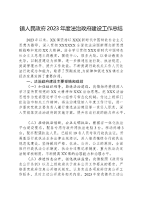 镇人民政府2023年度法治政府建设工作总结2023年以来,XX镇坚持以XXX新时代中国特色社会主义思想为指导,深入贯彻XXXXXX全面依法治国新理念新思想新战略和党的XX大精神,结合学习贯彻XXX新时代中国特色社会主义思想主题教育,围绕中心,服务大局,以普法教育为先导,以制度建设为保障,进一步推进依法行政、执法规范、提高管理水平、提升工作效能,不断提高行政机关工作人员依法行政观念和能力,取得了预期成效,为保障和促进XX镇社会经济发展发挥了重要作用。一、法治政府建设主要举措和成效 (一)加强组织领导,推进法治建设。我镇始终持续深入学习宣传贯彻党的XX大精神和XXX法治思想,把XXX法治思想作为党委理论学习中心组学习常态化机制,传达上级部门依法治市相关工作精神。将法治建设纳入年度工作计划,进一步落实党政主要负责人履行推进法治建设第一责任人职责,深入贯彻落实法治政府的实施方案,提升依法行政的能力和水平。 (二)推动执法创新,公正文明执法。根据省一体化执法平台建设要求,配备专用行政外网执法电脑3台,移动终端3台,配齐配强执法人员,已组织19名人员考取行政执法证,开展基层行政执法业务法律法规培训,深入推进镇综合行政执法规范化建设。坚持做到严格、依法、公开、公正的原则,全面推行行政执法公示制度、执法全过程记录制度、重大执法决定法制审核制度,不断提高XX镇的治理能力和治理水平。 (三)推进信息公开,强化执法监督。我镇按照《政府信息公开条例》以及上级政府关于政务公开工作要点的要求,严格落实政府信息公开相关规定,认真完成各项政府信息公开工作任务,及时主动公开政务相关内容。2023年度我镇共主动公开信息20条。 (四)发展枫桥经验,做实调解工作。我镇及时、依法、就地在全镇开展矛盾纠纷排查调解,把矛盾化解在当地,化解在萌芽状态。落实矛盾纠纷定期排查调处制度,及时上报排查信息,辖区内排查出的民间纠纷调解率达100%。2023年以来,共开展各类专项行动期间矛盾纠纷排查调处活动10次,共排查化解各类矛盾纠纷810起,已调处成功810起,无因民间纠纷调解不及时或调处不当而引发的民转刑案件和群体性事件的发生。 (五)落实谁执法谁普法普法责任制度。紧紧围绕我镇实际,以实施八五普法规划为抓手,以开展法律七进活动为载体,依托福利区文化公园等优质普法宣传场地,先继开展各类普法宣传活动共计15场次;同时围绕生态文明建设、食品药品安全、扫黑除恶、毒品预防、反电信诈骗等人民群众密切相关的问题,开展经常性法治宣传教育。2023年以来,发放各类法律法规宣传资料共计6000余份,开展法律培训讲座10场次,开展法治宣传志愿服务100余次,赠送法律书籍600余册,受教育人数达7000余人。 二、加强法治政府建设的有关情况 (一)继续推进民主决策的规范化。镇领导高度重视民主决策,结合实际,紧扣发展目标,组织相关部门深入开展调查研究,广泛征求意见,进一步强化重大决策的调查研究、群众参与、民主决策、民主审查等制度。在涉及镇域内经济社会发展和群众利益的重大问题上,始终坚持由部门提出议案,主管领导先期审查,最后提交班子讨论决定的制度和程序,防止行政决策的随意性,提高了行政决策的水平。 (二)继续推进政务公开规范化。坚持公开为常态、不公开为例外原则,以市政务公开网站、镇公示栏为信息公开的平台全面落实政务公开制度,积极推进政务公开制度化、规范化,将广大群众普遍关注的热点问题和民生问题,通过会议、文件、媒体、公示栏、网络、干部宣传等形式向社会公布,征求群众意见,接受群众监督。 (三)继续推进行政执法规范化。一是严格落实行政执法责任制,切实抓好执法依据梳理和执法职权的层层分解,进一步明确行政执法机关的执法目标和执法责任,规范执法行为。二是利用一体化执法平台,全面规范执法程序与自由裁量权,有效防止了权力的滥用,提升了公信力。三是建立了行政执法公示制度、执证上岗制度、行政执法过错责任追究制度、执法监督制度。2023年录入一体化平台行政检查共16次。 (四)继续加强队伍规范化建设。一是切实加强执法队伍的法治教育。继续推进领导干部学法制度,对《中华人民共和国行政处罚法》、《中华人民共和国行政复议法》等行政执法方面的法律法规和政策规定实现了常规性学习,使全体执法干部在具体操作中能够熟练运用有关法律、法规和政策。二是组织人员参加全市行政执法人员岗位培训和考核,积极组织单位未持有行政执法证人员、行政执法证到期人员参加行政执法考试,申领国家行政执法证,着力提高行政执法人员的整体素质。三是认真做好法治政府建设保障工作。根据执法任务的轻重,充实重要岗位的执法人员力量,为法治政府建设创造了良好的工作条件。 (五)继续强化纠纷化解规范化。利用1+N平台充分发挥各部门的所站在化解行政争议和民事纠纷中的作用