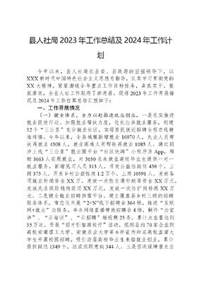 县人社局2023年工作总结及2024年工作计划今年以来,县人社局在县委、县政府的坚强领导下,以XXX新时代中国特色社会主义思想为指导,认真学习贯彻党的XX大精神,紧紧围绕全年重点工作目标任务,真抓实干,狠抓落实,全县人社工作取得了新进展。现将2023年工作开展情况及2024年工作打算总结汇报如下:一、工作开展情况(一)健全体系,全力以赴推进就业创业。一是扎实推进就业促进行动。加强就业帮扶力度,优化公共就业服务,创建32个三公里充分就业社区,实现居民就近招聘全程在线精准对接。今年以来,全县城镇新增就业16970人,失业人员帮扶再就业4308人,就业困难人员帮扶再就业1085人。通过同步上线三公里就业圈平台社区快聘小程序及App,帮助3663人实现就业,对3650名未就业高校毕业生提供一对一就业服务,新增见习人员313人。开发公益性岗位438个,上岗375人。开发乡村公益性岗1.2万个,上岗10591人。发放各项就业补助资金XX万,发放一次性交通补助等资金XX万元,发放失业保险稳岗返还XX万元,发放一次性扩岗补助XX万元。二是健全就业招聘供需平台。建立覆盖县乡村三级的招聘服务体系,常态化开展2+N线下招聘会364场,推进互联网+就业云服务,举办网络直播带岗招聘会4场,制作云宣讲、云培训、云招聘短视频25条,累计点击量达到35万次。开展招才引智高校行活动,组织县内70家企业到高校安徽理工大学、安徽农业大学等6所省内知名高校直面大学生开展校园招聘,吸引应届高校毕业生来临就业创业,累计提供岗位1349个,达成求职意向344人。三是坚决保障重点企业用工。树立招工即招商理念,为立讯精密等重点企业制定个性化招工方案,开展接您回家送您上岗送工入企进园区等活动。为立讯精密溧阳厂区输送工人及技术骨干2076名,组织1500余名群众到XX立讯精密面试,实现在厂稳定务工502人。开展三级三方服务千企活动,统筹8家培训服务机构和19家人力资源服务机构,动态更新企业需工类型、需工规模、培训需求等。2023年,服务三级三方重点企业开展岗前技能培训55人,帮助企业解决用工2625人。四是充分发挥创业带动作用。开展多元创业活动,组织12人分三批到昆明、哈尔滨、杭州参与精创阜阳训练营,成功举办第二届创业安徽XX赛区选拔赛,推荐优秀企业参与《创业在安徽》节目。丰富创业培训形式,加强对创业服务云平台管理,开展创业培训690人,19人成功创业,134人自谋职业。为8家新办餐饮店申报阜阳名小吃,创业企业新认证213家、创业个人新认证571个。累计建成省、市级农民工返乡创业示范园5个,吸纳农民工就业5000余人。加大对农民工等重点群体创业担保贷款政策落实力度,发放创业担保贷款XX万元。(二)优化服务,着力提高社会保障水平。一是社会保险覆盖面进一步扩大。制定《XX县企业年金宣传推介工作方案》,编印企业年金宣传材料1.2万余份,推动全县63家参保单位建立了企业年金,位居全省前列。深入实施全民参保计划,采用图文结合、视频解读等方式宣传社保政策,结合社保服务进万家主题活动,开展幸福养老皖美社保主题宣传,积极动员用人单位依法全员参保。开展新业态劳动者参保扩面专项行动,引导灵活就业人员等重点人员参加社会保险。截至目前,全县城乡居民、企业职工、机关事业养老保险和失业、工伤保险参保人数分别达到XX万人、2.21万人、4.35万人和4.48万人、7.61万人,发放养老金XX亿元。二是窗口经办服务进一步优化。加快推进数字人社建设,实施综合窗口改革,促进经办管理标准化、规范化、便利化,逐步实现一窗通办。全力推行不见面网上办服务,大力实施一网通办。打造15分钟服务圈,开通54个社银合作经办网点,将16项高频服务事项下沉办理,实现 让数据多跑路,让群众少跑路。6月,我县人社综合服务大厅被省人社厅评为 最佳社保窗口。强化主动服务意识,发放各项援企稳岗资金XX万元。持续拓展一卡通应用场景,推进社保卡在图书借阅、公交乘车、惠农补贴发放等方面的应用。今年以来,全县110家即时制卡网点制发社保卡XX万张,其中第三代社保卡XX万张。三是基金风险防控进一步压紧。制定《岗位权限管理》《非工作时间段处理业务审批》等制度,强化制度保障。建立户籍注销、服刑、殡葬、医学死亡等数据信息共享机制,对基金发放工作提供风险预警。开展失业保险专项整治活动,清退违规领取失业保险金XX元。成立业务培训和警示教育活动专班,对镇村两级500余名社保经办人员进行业务培训和警示教育,增强廉洁自律意识。建立《XX县查处和防范社会保险欺诈工作联席会议制度》,有效打击和防范社保欺诈行为。不断充实社保基金社会监督员队伍,全面提升我县社保基