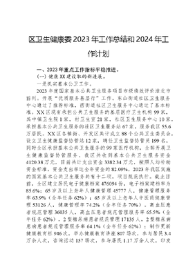 区卫生健康委2023年工作总结和2024年工作计划一、2023年重点工作指标平稳推进。(一) 健康XX建设取的新进展。一是抓实基本公卫工作。2023年度国家基本公共卫生服务项目市级绩效评价淮北市前列。开展优质服务基层行工作。东山街道社区卫生服务中心通过了推荐标准,西街道社区卫生服务中心通过了基本标准。XX区现有承担公共卫生服务的基层医疗卫生机构99家,其中镇卫生院1家,村卫生室21家,社区卫生服务中心10家,承担基本公共卫生服务的社区卫生服务站67家,服务我区55.6万居民。XX区各镇街、开发区共计成立88个公共卫生委员会,设立卫生健康监督协管站12家,聘任卫生监督协管员199名,同时全区承担基本公共卫生服务的99家医疗机构,全部开展卫生健康监督协管服务。我区共收到基本公共卫生服务资金4120.38万元,目前共计支出资金3382.34万元,按照人均补助资金标准,资金支出率达全年资金的82.09%,2023年我区实施的国家基本公共卫生服务共有十二项,项目规范执行。截止目前,全区建立居民电子健康档案476094份,电子档案建档率为85.6%;65岁及以上老年人健康管理45777人,健康管理服务率63.9%(全年任务62%);65岁及以上老年人中医药健康管理53126人,健康管理率74.2%(全年任务70%)。高血压患者规范管理36035人,高血压患者规范管理服务率65.5%(全年任务62%),2型糖尿病患者规范管理17135人,2型糖尿病患病患者规范管理服务率64.1%(全年任务62%);制作更新健康教育栏946次,举办健康教育讲座807场次,参与居民3.4万余人次,咨询活动157场次,参与居民1.17万余人次,印发各类宣传资料16.46万余份。全区0-6岁儿童25303人,健康管理23761人,健康管理率93.90%(全年任务85%);3岁以下儿童系统管理8499人,0-3岁儿童系统管理率为91.86%(全年任务80%)。孕产妇活产数2708人,早孕建册人数2577人,早孕建册率95.16%;健康管理2591人,健康管理率95.67%;孕产妇系统管理2530人,系统管理率93.42%(全年任务90%);产妇出院后3-7天内接受产后访视2671人,产后访视率98.63%。预防接种建卡证3072人、建证率达100%,应种人数108997人剂次,实接种人数98479人剂次,疫苗接种率90.35%(全年任务90%);严重精神障碍在册患者2317人,在管患者数2314人,管理率99.87%,规范管理2302人,规范管理率99.4%(全年任务80%);传染病与突发公共卫生事件报告与处理的信息报告率达100%(全年任务95%),报告发现的结核病患者137人,管理137人,管理率100%(全年任务90%)。二是扎实推进家庭医生签约服务工作。通过开展家庭医生签约服务,进一步丰富签约服务内涵,转变医疗卫生服务模式,提升服务能力,充分发挥家庭医生健康守门人作用,促进基层医疗卫生服务向健康管理转型,加强慢病管理与防控,降低疾病发生率,不断提高居民对签约服务的获得感、满意度和健康水平。XX区共计完成2023年度家庭医生签约28.4万人,签约率51.2%(任务50%),重点人群签约10.6万人,签约率90.2%(任务85%),有偿签约3.4万人,签约率6.1%(任务5.5%),有偿签约高血压患者1.4万人,签约率2.6%(任务2.5%),有偿签约糖尿病患者0.7万人,签约率1.4%(任务1.1%);2023年度签约任务均已完成,有偿签约服务履约率95.38%(任务95%),服务包完成率90.09%(任务90%),2023年度签约履约任务均已完成。激励家庭医生为签约服务对象提供针对性的基本公共卫生、基本医疗、预约诊治、伤病康复、健康管理、长期照护等连续协同的健康服务,逐步实现首诊在基层、救治在医院、康复回社区的分级诊疗目标。三是深入实施两卡制试点工作。2023年XX区卫生健康委继续全面深入实施两卡制工作,截止目前,全区99家两卡制基层医疗机构已经入户采集居民信息(人脸识别)XX万人,采集率84.7%,提供基本公共卫生服务工分值XX万,提供家庭医生签约服务工分值XX万,年底根据考核校正结果,结算工分值资金。大力推行居民健康档案电子化,全面取消纸质健康档案通过健康淮北APP,电子健康档案已经向居民本人开放使用。四是完成城市社区医疗卫生机构和村卫生室标准化建设项目工作。自2021年起,通过3年基础设施建设和医疗设备的更新补充,全区城市社区医疗卫生机构和村卫生室卫生服务能力进一步提升,诊治60%左右的常见病多发病,基本满足群众基层就医需要。实施城市社区医疗卫生机构和村卫生室标准化建设项目,2021年40%达到标准,2022年70%达到标准