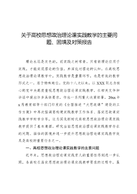 关于高校思想政治理论课实践教学的主要问题、困境及对策报告理论永远是灰色的,而实践之树常青。只有将理论应用于实践,才能实现理论的价值,并深化对理论的认知。在高校思想政治理论课教学中,实践教学是重要环节,也是有效的教学形式之一,居于特殊地位。党的十八大以来,以XXX同志为核心的党中央高度重视思想政治理论课实践教学,在相关文件和讲话中提出许多具体要求,作出一系列重大决策部署,20xx年x月教育部等十部门印发的《全面推进大思政课建设的工作方案》中再次强调要构建实践教学工作体系、落实思政课实践教学学时学分等,这为深化新时代高校思想政治理论课实践教学提供了基本遵循。研究当前思想政治理论课实践教学存在的问题、面临的困境并进一步提升思想政治理论课实践教学效果是高校的重要任务之一。一、高校思想政治理论课实践教学的主要问题近年来,思想政治理论课实践育人的重要性得到进一步认同,各高校在落实思想政治理论课实践教学要求的过程中,虽形成了一些各具特色的实用经验,但部分高校仍存在不少问题,从实践教学的实施结果来看,存在的主要问题在于以下两个方面。(一)落实思想政治理论课实践教学要求不到位20xx年教育部等部门《关于进一步加强高校实践育人工作的若干意见》指出:思想政治理论课所有课程都要加强实践环节。20xx年x月教育部印发的《新时代高校思想政治理论课教学工作基本要求》明确提出:从本科思想政治理论课现有学分中划出x个学分、从专科思想政治理论课现有学分中划出x个学分,开展本专科思想政治理论课实践教学。随着要求的不断提高和日渐明确,实践教学逐渐进入高校学生思想政治理论课的计划安排中。但有些高校站位不高,对思想政治理论课实践教学的重要性认识不足,仅把实践教学当作政治任务来抓,虽划出了学分,并相应安排了一定的实践教学学时,但对思想政治理论课实践教学的教学内容是什么、谁来组织、谁来考核、怎样考核等一系列问题都缺乏系统深刻的思考,并未形成规范的实践教学体系,以致实践教学具有很大的盲目性和随意性,存在实践教学学时的内容由任课教师自行安排甚至用理论课直接代替实践课的现象,实践教学形同虚设。(二)现实思想政治理论课实践教学效果不理想文可居文库——海量学习资料,手机电脑均可下载www.wenkeju.com有的高校积极落实思想政治理论课实践教学要求,不断探索思想政治理论课实践教学的有效途径和方法,虽取得了一定的成果,但总起来说实践教学效果不够理想,存在实践教学育人功能未充分发挥、育人目的未真正实现的情况,主要表现在:在受众面上,实践教学没有实现全员覆盖,没有达到全员参与的目的,特别是校外社会实践教学存在掐尖现象,全体学生参与度不够;在功能发挥上,实践教学存在理论和实践脱节的情况,实践教学看似热闹但缺乏思想引导和价值引领,观光者游离者现象普遍,有的甚至将思想政治理论课实践完全等同于专业课实践、社会实习及一般的课外活动;在价值引领实现上,在实践教学内容同质化固态化现象严重、针对性不强,形式老套、不够多样,不能满足学生的个性化需求,对学生缺乏吸引力,部分学生缺乏参与积极性、主动性,消极对待实践教学,存在不求质量只求完成任务的应付心理,甚至弄虚作假,实践教学流于形式,实践育人最终成为空谈。二、高校思想政治理论课实践教学的现实困境影响高校思想政治理论课实践教学切实落实和效果提高的因素既有主观方面又有客观方面的,既有领导层面又有制度层面和实施层面的,从实践教学具体实施层面看,主要影响因素有以下三个。文可居文库——海量学习资料,手机电脑均可下载www.wenkeju.com(一)实践教学实施方案不完善既然高校思想政治理论课实践教学有一定学时学分,那它就应该像一门课程一样,形成一套明确的实践教学实施方案。实践教学实施方案是教师实施实践教学的重要依据,其完善程度事关实践教学的运行和效果。如果没有实践教学实施方案或实施方案不完善,思想政治理论课实践教学就不会规范开展,就会带有极大的盲目性和随意性,极易沦为形式过场,其教学效果则主要依赖于教师个人实践教学的自觉意识和能力。当前有的高校还没有制定思想政治理论课实践教学实施方案,有的高校制定的思想政治理论课实践教学方案借鉴成分太多,模仿痕迹太重,没有自己的思路和方法,没有体现学校特色和个性,有的高校制定的思想政治理论课实践教学实施方案过于简单,模式化突出、形式陈旧,存在普遍适用的问题,比如,在主题设置上没有体现各门思政课程的内容特点等差别,在形式上没有体现课堂、校内、校外等不同实践组织形式的差别,在实施对象上没有体现学生年级专业差别等。(二)教师实践教学水平有待提高实践教学是思想政治理论课的重要组成部分,作为课堂教学的延伸拓展,教师依然发挥主导作用,若教师不能对学生实践进行有效指导,实践教学效果就