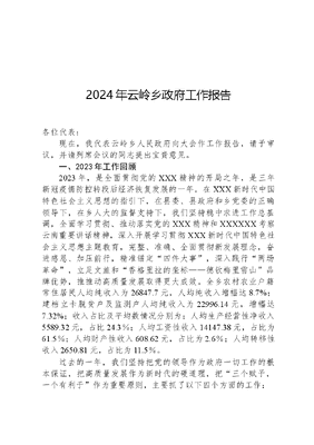 2024年云岭乡政府工作报告各位代表:现在,我代表云岭乡人民政府向大会作工作报告,请予审议,并请列席会议的同志提出宝贵意见。一、2023年工作回顾2023年,是全面贯彻党的XXX精神的开局之年,是三年新冠疫情防控转段后经济恢复发展的一年。在XXX新时代中国特色社会主义思想的指引下,在县委、县政府和乡党委的正确领导下,在乡人大的监督支持下,我们坚持稳中求进工作总基调,全面学习贯彻、推动落实党的XXX精神和XXXXXX考察云南重要讲话精神,深入开展学习贯彻XXX新时代中国特色社会主义思想主题教育,完整、准确、全面贯彻新发展理念,奋进感恩、加压前行,精准锚定四件大事,深入践行两场革命,立足文旅和香格里拉的坐标——德钦梅里雪山品牌优势,推推动高质量发展取得更大成效。全乡农村农业户籍常住居民人均纯收入为26847.7元,人均纯收入增幅达8.7%;建档立卡脱贫户及监测户人均纯收入为22996.14元,增幅达7.32%;收入占比及平均数情况分别为:人均生产经营性净收入5589.32元,占比24.3%;人均工资性收入14147.38元,占比为61.5%;人均财产性收入608.62元,占比为2.6%;人均转移性收入2650.81元,占比为11.5%。过去的一年,我们坚持把党的领导作为政府一切工作的根本保证,把高质量发展作为新时代的硬道理,把三个赋予,一个有利于作为重要原则,主要抓了以下四个方面的工作:这一年,我们始终坚持党的领导,政府建设务实有效。以学习贯彻XXX新时代中国特色社会主义思想主题教育为契机,推动以党的创新理论武装头脑、指导实践、指导工作,认真执行第一议题机制,落实意识形态工作责任制,常态化开展揭批教育,不断增长政府系统政治能力。始终把忠诚拥护两个确立、坚决做到两个维护作为最高政治原则和根本政治规矩,抓实抓好省委巡视、环保督察、审计各类反馈问题整改工作,严格执行重大行政决策法定程序,坚持重大事项请示报告制度。认真践行作风革命、效能革命,厉行节约过紧日子,压减年初预算公用经费,保障基本民生和重点项目。加大政务公开力度,全年发布公开信息60余条,云尚故事微信公众号180余篇,政风行风明显提升。这一年,我们奋力抓好乡村治理,社会大局稳定祥和。坚持发展是硬道理,稳定也是硬道理理念,不断加强社会治安防控体系建设,严守安全发展底线,严密防范和坚决打击各类分裂、渗透破坏活动,牢牢掌握涉藏工作话语权和主导权。组织乡寺管局、司法所、派出所工作人员召开工作研判会议和维稳工作会议48次,及时分析域内维稳工作形势,及时研判矛盾纠纷,形成信息互享共通。开展矛盾纠纷排查化解和领导干部大接访活动,接访信访件36起,化解29件,长期推进7件。依托四联四创工作机制,持续开展民族团结进步示范创建和宗教领域润心同向四条标准教育活动,成功创建云岭乡为州级民族团结进步示范乡,红坡村为民族团结进步示范村。深入推进普法强基补短板和防风险、保安全、强发展专项行动,全年召开部署会5次,推进会4次,普法宣讲120余场,覆盖群众15743余人,发放宣传品7600余份。常态化开展扫黑除恶工作,深入村组线索摸排2次;组成安保维稳工作组深入虫草山,切实抓好虫草松茸采挖服务管控工作。持续深化友好和谐边界关系,同6个毗邻乡镇签订和谐交界协议书。积极发挥39名治理员作用,上报矛盾纠纷、计生、教育、文可居文库——海量学习资料,手机电脑均可下载www.wenkeju.com民政等各类信息8000余条,为民办实事950余条。把推进移风易俗等主要内容纳入村规民约,全乡39个村民小组均已按要求调整完善组规民约,有效激发群众参与乡村治理的积极性和主动性。这一年,我们聚力抓好乡村振兴,村庄活力不断激发。落实四个不摘要求,按照共享开支、共同生活的原则,开展防止返贫动态监测帮扶集中排查,落实一户一方案,人均纯收入低于1万元的脱贫人口和检测对象实现动态清零。持续巩固提升两不愁三保障及饮水安全保障水平,针对4名困难大学生发放中央直达资金1.6万元;发放雨露计划教育补助项目资金10.7万元,惠及学生22名。投资197.71万元推进完成德钦县十四五规划农村安全饮水项目,安装单户式净化设备70座,发放管材3900米,开展农村饮水安全排查工作90余次,上报问题5次。深入开展农村生活污水治理,大力整治农村人居环境。持续推进厕所革命,新改建农村卫生户厕72座,发放补助14.4万元。常态化开展卫生保洁工作,持续推行垃圾统一清运处理工作,每日清运垃圾12车次,垃圾10余吨。清理村内沟渠330公里,逐步消除黑臭水体污染源。持续推进爱国卫生常态化大扫除活动,通过云尚故事微信公众号、led电子屏、宣传布标、海报等方式强化宣传教育,2023年,