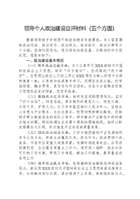 领导个人政治建设自评材料(五个方面)根据领导班子和领导干部政治建设考察要求,本人紧紧围绕政治忠诚、政治定力、政治担当、政治能力、政治自律等五个方面,坚持问题导向,进行深刻自我检查、自我剖析和自我反思,现报告如下:一、政治建设基本情况(一)铸牢政治忠诚方面。本人认真学习XXX新时代中国特色社会主义思想,树牢四个意识,坚决做到两个维护,在思想上政治上行动上同以XXX同志为核心的党中央保持高度一致;认真参加各类集中学习,用理论武装头脑,把学深悟透、融会贯通、真信笃行作为目标,在各个方面都自觉做习思想的坚定信仰者、忠实实践者。(二)保持政治定力方面。始终有坚定的理想信念,坚定四个自信,对党忠诚,具有强烈的爱党之心、忧党之情、兴党之责、护党之志;在工作中能坚持以人民为中心,坚持全心全意为产业服务、为企业服务,把贯彻党的群众路线、坚持联系群众制度落实到实际工作中,研究解决产业转型升级的痛点难点问题,帮助协调企业发展中遇到的困难瓶颈,始终以新发展理念为引领,努力推X产业实现高质量发展。(三)强化政治担当方面。工作中能把推动产业发展始终作为主攻方向,积极主动履职尽责,担当作为;坚决贯彻中央、省委、市委和区委重大决策部署,关键时刻挺身而出。在项目招商引资、企业服务等重点工作中,进行深入调研、提出切实可行的工作方案,研究工作难题,解决工作困难,高质量完成各项工作(四)提升政治能力方面。有较强的政治敏锐性和政治鉴别力,能运用XXX新时代中国特色社会主义思想来谋划推进工作、分析解决实际问题、谋划推进产业发展。有较强的执行力,能努力把党的主张和决策部署转化到推动产业发展的政策拟定中来;能认真贯彻执行民主集中制,坚持科学民主依法决策,努力维护领导班子团结。主动调研、主动思考,为产业发展建言献策。(五)严格政治自律方面。本人始终尊崇党章宪法,严肃认真参加党内政治生活,严格遵守政治纪律和政治规矩;严格遵守中央八项规定及实施细则精神;始终与党中央党风廉政建设和反腐败的高压态势保持一致,在政治上、工作上、生活上严格要求自己,带头执行廉洁自律各项规定,不参与私下宴请,更没有任何收受红包礼金的行为。不以权谋私、不公车私用,厉行节约反对浪费,不利用职权和职务上的影响谋取不正当利益、不私自从事营利活动,以身作则,锤炼作风,保持党员干部良好形象。二、存在的问题和不足(一)在铸牢政治忠诚方面。虽然能积极参加XXX新时代中国特色社会主义思想、XXX重要讲话精神、党的XXX精神的学习但没有深刻理解背后的内涵,没能全面掌握这一科学理论的基本观点、理论体系,对新形势新情况的分析判断不透彻,对一些深层次的问题思考不深入,对照党章自我反省做得不够。带头发挥先锋模范作用不够明显,很多工作自觉受岗位等因素制约,解决实际问题等方面做得还不够细致到位,成效还不够显著。(二)在保持政治定力方面。学习上花了时间,但入脑入心、转化为工作成效不明显,还是存在学习走过场的问题。平常在产业宣传方面对于对精神文明创建、主流文化思想内容宣传较少,宣传手段单一。特别是对于区域品牌、企业品牌、产品品牌的宣传动脑筋不够。对错误思潮的警惕性不高,缺乏斗争精神,未能够挺身而出与之进行坚决斗争,如在网络、微信上浏览资讯时,看到敏感信息只是简单的一删了之,没有给予坚决的抵制和批评,未能从政治上看到其潜在的危害,缺乏清醒的认识。同时,面对繁重的航空产业发展任务和各种竞赛、考核中,有时会出现工作动力不足、精神状态不佳,其根本原因就在于理想信念不够坚定、自觉、清醒。(三)在强化政治担当方面。尽管干了一些事,但在主动担当方面还有差距。全心全意为人民服务的宗旨没有贯彻到思想深处和工作环节中,碰到问题讲客观困难多,在主观上找问题少。特别是在服务企业的过程中,还存在以部门职能有限等为缘由,无法解决的问题,协调沟通不够。(四)在提升政治能力方面。创新能力还不够强,思路办法还不不够多,不够广,当前航空产业发展任务重,受制约因素多,工作中有时降低了要求,创造性的思考谋划不够,抓落实的行动力不够,致使工作有时创新少、亮点少。比如链办的工作,多是完成考核内容,较少的站在全产业链的角度思考研究,对解决产业急难愁盼的问题没能站在全区的高度提出建议意见。(五)在严格政治自律方面。在执行党的纪律的过程中,从严治党的思想没有时刻紧绷,总觉得腐败离自己很遥远,没有把警钟长鸣、防微杜渐时刻上心。对于单位一些工作作风方面的问题,虽然也经常提醒,但没有时刻把自律自觉、模范带头作为首要途径。比如还偶尔存在餐饮浪费现象。三、下一步工作打算(一)加强理论学习,进一步坚定理想信念。深入学习XXX新时代中国特色社会主义思想,以及党的十九大和十九届二中、三中、四中全会精神,增强党性观念,提高政治素养。牢牢守护绝对忠诚这条生命线,自觉在思想上政治上行动上同以XX