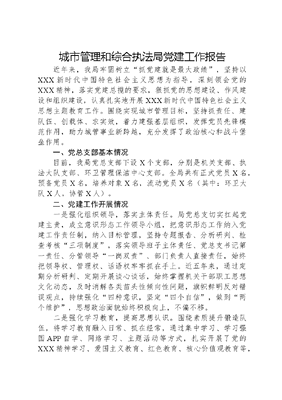 城市管理和综合执法局党建工作报告近年来,我局牢固树立抓党建就是最大政绩,坚持以XXX新时代中国特色社会主义思想为指导,深刻领会党的XXX精神,落实党建总揽的要求,狠抓党的思想建设、作风建设和组织建设,认真扎实地开展XXX新时代中国特色社会主义思想主题教育工作。围绕实现城市管理目标,坚持抓责任、建队伍、创载体、求实效,着力建强基层组织,发挥党员先锋模范作用,助力城管事业新跨越,充分发挥了政治核心和战斗堡垒作用。一、党总支部基本情况目前,我局党总支部下设X个支部,分别是机关支部、执法大队支部、环卫管理保洁中心支部。全局共有正式党员X名,预备党员X名,培养对象X名,流动党员X名(其中:环卫大队X人,协管X人)。二、党建工作开展情况一是强化组织领导,落实主体责任。局党总支切实扛起党建主责,成立意识形态工作领导小组,把意识形态工作纳入党建工作责任制,纳入目标管理,坚持专题报告、分析研判、检查考核三项制度,落实领导班子主体责任、党总支书记第一责任、分管领导一岗双责、部门负责人直接责任,始终把领导权、管理权、话语权牢牢抓在手上。近五年来,通过定期分析研判、定期开展谈心谈话,始终掌握机关干部职工思想文化动态,及时消解各类苗头性倾向性问题,旗帜鲜明反对错误观点,持续强化四种意识,坚定四个自信,做到两个维护,思想政治面貌始终积极向上,不偏不移。二是强化学习教育,提高思想认识。围绕素质提升锻造队伍,将学习教育融入日常、抓在经常,通过集中学习、学习强国APP自学、网络学习、主题活动等方式,扎实开展了党的XXX精神学习、爱国主义教育、红色教育、核心价值观教育等,严格落实三会一课,积极推进两学一做学习教育常态化制度化,做到理论学习有制度、有计划、有主题、有记录。近五年来,共召开支部委员会X次,党员大会X次,党小组会X次,党课X次,组织生活会X次,组织党员干部集中学习共X次,组织各类学习测试X次,开展主题党日活动X次,党员干部宗旨意识不断强化,信仰之基更加牢固,精神之钙更加充足,干事创业和担当作为的精气神得到提振,凝聚了推动事业发展的磅礴力量。三是强化宣传引导,营造舆论氛围。严格落实信息发布管理制度,不断加强局微信工作群、微信公众号等舆论阵地管理,定期排查舆情隐患,积极宣传各种好人好事、文明新风,唱响主旋律,传播正能量,意识形态阵地建设管理成效明显。五年来,共编发微信公众号X期,在市级及以上新闻媒体发稿X篇,区级新闻平台发稿X篇,编发党建简报X期,同时认真积极完成了各类舆情引导、跟帖评论等网宣任务,营造了积极向上的舆论氛围,党的主旋律更加响亮,正能量更加强劲。四是强化阵地建设,增强党建活力。争创区级党建示范点,加强党建工作室、图书阅览室和党建红色走廊两室一廊阵地建设。组建党员突击队,在征迁拆违、疫情防控等急难任务中发挥标杆旗帜作用和品牌引领作用,先后培育了市级劳动模范X、市级文明职工X等先进典型,王锡哲同志参加评选省优秀党务工作者,通过在市、区新闻媒体及学习强国APP上宣传,引领干部队伍建设,服务保障科学发展。组成党史知识竞赛小组参加区党史知识竞赛选拔并获得第X名。组织开展读书学习活动、硬笔书法展览、两学两比两争、结对共建和党员亮承诺活动、扶贫送温暖活动、文体娱乐活动等,不断为党建工作注入源头活水,增强了党组织的生机活力。五是强化统一战线,严肃政治纪律。把统战工作纳入年度工作计划,定期分析研究,明确专人落实。制定台胞台属、民主党派、高学历人才排查登记表,建立统战工作台账,定期组文可居文库——海量学习资料,手机电脑均可下载www.wenkeju.com织机关职工学习统战政策。严肃党的政治纪律,不断加强党员干部廉政教育,落实组织生活会、党员民主评议等制度,对党员干部宗教信仰问题不间断提醒教育,要求非工作原因不得出入宗教场所,日常必须佩戴党徽,亮明身份。对路边非法兜售宗教刊物、散发宗教传单等行为坚决制止,并及时上报区主管部门。六是服务基层群众,促进和谐稳定。全力做好疫情交通防控工作。在疫情防控关键阶段,同公安、农综、计卫等部门在X高速口设立X疫情检测点,成立临时党支部,我局党总支书记任疫情监测点临时党支部书记,通过党建引领、联防联控,筑牢了X疫情防控屏障。以卫生城市创建、文明城市创建为抓手,积极开展文明志愿者活动,着力解决群众的操心事烦心事,不断提升服务群众的能力和水平。在辖区大型小区门口设置瓜果临时销售点、便民服务点,规划设置非机动车停车位,辖区内公厕24小时对外开放,统一在路口设置导向牌、指示牌,配备洗手液、手纸等,为群众提供便利。对群众反映的问题,第一时间调查解决,第一时间回复办理,回复处理市长热线办结率100%,不断提升辖区群众的幸福感获得感,聚民心、暖人心、筑同心,有力维护了社会和谐稳定。三、下