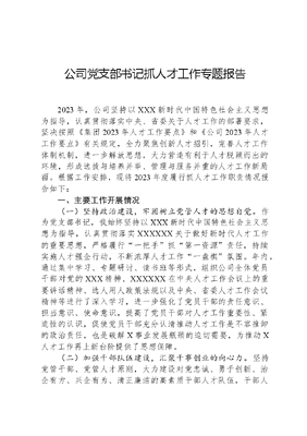 公司党支部书记抓人才工作专题报告2023年,公司坚持以XXX新时代中国特色社会主义思想为指导,认真贯彻落实中央、省委关于人才工作的部署要求,坚决按照《集团2023年人才工作要点》和《公司2023年人才工作要点》有关规定,全力聚焦创新人才招引,完善人才工作体制机制,进一步解放思想,大力营造有利于人才脱颖而出的环境,形成选拔与培养并举、管理与服务并重的人才工作新局面。根据工作安排,现将2023年度履行抓人才工作职责情况报告如下:一、主要工作开展情况(一)坚持政治建设,牢固树立党管人才的思想自觉。作为党支部书记,我始终坚持以XXX新时代中国特色社会主义思想为指导,认真贯彻落实XXXXXX关于做好新时代人才工作的重要思想,严格履行一把手抓第一资源责任,持续实施人才强企行动,不断浓厚人才工作一盘棋氛围。年内,通过集中学习、专题研讨、读书班等形式,组织公司全体党员干部对党的XXX精神、XXXXXX在中央人才工作会议上的重要讲话精神、选人用人政策法规以及中央、省委人才工作会议精神等进行了深入学习,进一步强化了党员干部的责任意识、担当意识、使命意识,提高了党员干部对人才工作重要性、紧迫性的认识,促使党员干部充分认清推动人才工作是不容推卸的政治责任,也是破解X事业发展瓶颈的迫切需要,为推动X人才工作再上新台阶提供了思想保障。(二)加强干部队伍建设,汇聚干事创业的向心力。坚持党管干部、党管人才原则,大力建设对党忠诚、勇于创新、治企有方、兴企有为、清正廉洁的高素质干部人才队伍,干部人才的综合素质和专业能力显著提升。一是强化实绩导向。坚持国企领导人员20字标准,注重培养治企兴企、管党治党的复合型干部,严把选人用人政治关、能力关、廉洁关,全年调整、选拔干部5人,进一步加强优秀年轻干部队伍建设,一批敢于担难担险、勇于破局突围、善于提质增效的优秀年轻干部走上重要岗位。二是推进人才强企战略。坚持人才引领发展的战略地位,实施人力资源功能战略,制定印发《关于建立公司领导服务联系高层次优秀人才的通知》,以传帮带模式为主,公司班子成员与8名研究生分别结对,切实加强高层次人才培养速度,以满足公司快速增长的业务需求。注重引进高学历毕业生以培育后备人才队伍,年内,引进大中专毕业生24名,其中,研究生2人,本科生7人,建立了一支由高学历人才构成的高素质人才队伍,形成公司持续发展的核心竞争力。三是按照党管人才的要求,加大协调力度,充分发挥党支部牵头抓总作用。把党管人才原则贯穿于人才工作的全过程,建立以主要领导为组长、分管领导为副组长、部门负责人为成员的人才引进工作领导小组,具体负责落实公司人才引进工作,为全面做好人才工作奠定坚实基础,年内,围绕公司人才引进、培养、服务等方面工作,组织召开人才工作座谈会1次,支委会专题研究人才工作4次,坚持把人才工作与公司经营同谋划、同部署。(三)立足企业实际,完善人才制度保障。一是公司以提升企业发展效能为目标,全面贯彻落实《集团2022-2025年企业人才队伍建设发展规划》《公司2023年人才工作重点任务清单》,按照服务发展、人才优先、以用为本、创新机制、高端引领、整体开发的人才发展指导方针,紧紧围绕公司经济社会发展机遇和战略目标,创新人才发展体制机制,完善人才发展政策措施,优化人才发展环境条件,有效实施科技兴农和人才强企战略,制定《公司2023年人才工作重点任务清单》《公司2023年度引才计划》《公司2023年人才工作计划》,文可居文库——海量学习资料,手机电脑均可下载www.wenkeju.com进一步压紧压实党管人才工作责任,健全完善人才工作机构,配齐配强人才工作人员力量,统筹抓好人才培养、引进、使用、激励和保障等各个环节。二是优化完善薪酬体系建设,修订了《公司营销绩效及考核管理办法》《公司本部薪酬及绩效考核管理办法》,进一步完善了薪酬激励机制,使薪酬进一步向关键岗位、核心人才倾斜,营造出公开、公平,有利于人才成长的制度环境。(四)坚持全面培养,创新人才工作机制。公司始终坚持最好的培养就是使用的理念,致力于搭建人才想干事、能干事、干成事的舞台,努力拓展人才发展空间。通过增加职称、技能工资及以考代评取得职称奖励的形式,激励职工加强职称、技能能力提升。2023年,公司鼓励动员7名(其中,工程类1个,农业类6人)管理人员取得专业技术职称。同时,极力推荐高技能人才加入股份公司人才库,以此拓宽专业技术人才及技能人才成长成才的渠道。(五)坚持素质培育,打造高技能人才队伍。公司在高标准、高层次引进人才的同时,全力构筑起高起点、多层次、广渠道的人才培养体系,依据重点人才重点培养,优秀人才优先培养,紧缺人才抓紧培养,青年人才全面培养的方针,多层次、全方位的培养人才。通过技能人才专项培训、网络教育培训
