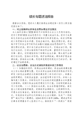 镇长专题述法报告根据会议安排,现将本人履行推进法治建设第一责任人职责情况报告如下。一、对上级精神认识体会及带头尊法学法情况本人始终坚持以XXX新时代中国特色社会主义思想为指引,把学习贯彻XXX法治思想作为一项重大政治任务,把学习成果转化为推进法治政府建设的精神动力和责任担当,转变为明确的工作思路和任务举措。坚持正确方向,强化思想引领。通过集中学习和自主学习的形式加强对XXX法治思想的学习,不断强化理论武装,提升自己的法律知识水平。坚持法治引领,强化行动自觉。引领全镇领导干部将守法律、重程序作为法治工作第一要求,切实增强领导干部带头依法办事、带头遵守法律的行动自觉。坚持以身作则,维护法律权威。带头维护宪法法律权威,坚持依法办事,用党章党规党纪规范自己的言行,做好遵纪守法的表率。二、以法治思维、法治方式谋划并推进本镇工作情况(一)加强组织领导,统筹法治政府建设。将法治政府建设摆在工作全局的重要位置,充分发挥法治政府建设领导班子作用,研究《深化法治建设示范镇创建成果三年行动计划》,部署法治政府建设、行政执法监督、法治宣传等方面工作,并纳入全镇年度工作要点。及时传达学习法治政府建设重要会议和重要文件精神,定期听取法治政府建设工作汇报,及时研究解决各项工作问题。(二)坚持依法决策,依法全面履行职能。落实重大行政决策程序制度,发挥政府法律顾问、公职律师作用,开展合法性审查次,审核街道乡镇合同数量份,提供法律服务次。有效落实司法所长列席镇长办公会议制度。完成一网统管城运平台二期建设,12345按时办结率100%。建成启用社区事务受理服务中心蓝湾分中心,持续提升一网通办便捷度和体验度。建立健全应急管理的组织体系、预案体系、联动处置救援体系,修订完成预案余个,持续提升应急管理法治化水平。(三)坚持依法执法,推动公正文明执法。全面严格落实行政执法公示制度、执法全过程记录制度、重大执法决定法制审核制度,制定重大执法决定法制审核目录清单,完成重大行政执法案件法制审核件。开展镇级行政执法案卷评查活动次,执法案件研讨会次,夯实行政执法基础,促进行政执法水平整体提升。推行证明事项告知承诺制,开展证明事项持续清理工作。落实轻微违法免罚要求,今年以来轻微违法依法不予行政处罚为件。(四)坚持依法治理,全力推进法治社会建设。深入推进全民普法,开展各类学习宣传余场。修订《普法责任清单》,进一步推动重点对象、重点领域法治宣传教育主管单位履行普法主体责任,提升谁执法谁普法工作质效。延伸公共法律服务触角,打造公共法律服务室、公共法律服务室特色点位,助力打造营商环境法治新高地。构建三所一庭+矛盾化解机制,推进全域无讼社区建设,健全1+4+X信访代理一站式服务体系,源头化解基层社会矛盾问题。三、个人存在的问题不足和下一步整改措施本人积极履行推进法治建设第一责任人职责,工作中取得了一定成效,但还存在不足之处。(一)存在问题一是将党的XXX精神和XXX法治思想指导实践、推动工作的融合度还不够,学习的钻研性有待进一步提高。虽然通过理论中心组、培训班等形式对党的XXX精神、XXX法治思想等形式不断加强学习,本人也有专业法学背景,但是面对新形式、新发展下的法治政府工作,学习的针对性、有效性还需要进一步加强。同时,在学法和用法结合上,将学法成果转化为推动实际工作落实的能力还需要进一步提升。对人民群众法治领域急难愁盼问题关注度还要加强,运用法治思维和法治方式处理日常工作的意识和能力仍不够强。二是以法治服务经济社会改革发展的效能有待进一步提高。对照推进治理体系和治理能力现代化建设的要求,在推进依法治理与运用先进技术相结合、运用法治思维和方式解决问题、打造智能高效的服务直通车和科技绣花针等方面还有不足。行政执法权下放街镇后,业务领域较为广泛,涉及法律极多,纠纷主体、案件形式、潜在问题越来越趋于多样化、复杂化,且法治工作严谨性、细致性要求高,基层执法力量配备不充足,法律专业人才较为缺乏。三是谁执法谁普法力度有待进一步提高。虽然制定了普法责任清单,但是在形式上需进一步丰富,在精细化水平上需要进一步提高。普法工作对群众法律需求研究不够,缺乏吸引力,表现为普法内容单一,活动重复,满足不了群众多样性的要求。此外,随着新媒体时代的到来,公众了解法律的途径越来越多元化,运用新媒体手段开展法治宣传工作有待加强,利用大众关注度高的社会问题或具体案例进行宣传教育的深度和广度还不够。普法工作缺乏创造性,工作亮点特色较少,以案释法推广不够、针对性治理不够。(二)下一步工作措施一是聚焦主题主线把方向。深入学习贯彻XXX法治思想,全面贯彻落实XXX法治思想和上级法治政府建设要求,在更高站位上推进依法治镇、依法执政、依法行政一体建设。加强自身法治学习,掌握工作中涉及法律知识,提高自身法治