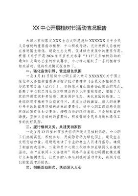 XX中心开展植树节活动情况报告为深入贯彻落实XXX生态文明思想和XXXXXX关于全民义务植树的重要指示精神,中心积极行动,充分发挥义务植树在推进国土绿化、建设生态文明、促进绿色发展中的重要作用。根据《关于开展2024年省直机关春季3·12义务植树活动的通知》及局办公室的有关要求,中心精心组织了一系列植树节相关活动。现将有关情况报告如下。一、强化宣传引导,营造绿色氛围一是3月11日组织中心职工深入学习XXXXXX关于国土绿化和义务植树重要讲话指示批示精神和《全民义务植树尽责形式管理办法(试行)》,坚持绿水青山就是金山银山的理念,提高了中心职工对生态文明建设的认识和重视程度,增强了大家的环保意识和责任感,激发保护生态、美化家园的热情。二是组织观看植树节公益宣传片,通过生动的画面、感人的故事和科学的数据展现植树造林的重要性,使中心职工深刻感受到环保的紧迫性和必要性,增强自身的环保意识。三是张贴宣传海报,宣传义务植树的重要性,积极营造全民参与造林绿化工作的良好氛围。二、履行植树义务,共建美丽家园一是3月12日植树节当天组织开展义务植树活动。中心职工们热情高涨,积极参与,用实际行动为绿化国土、建设生态文明贡献力量。现场还邀请了专业的林业人员进行指导,确保了树苗的成活率。二是动员中心职工积极参加互联网义务植树活动,在互联网+义务植树网络平台采取扫码捐款模式履行义务植树责任,让更多的人参与到植树活动中来,共同为我们的家园增添绿色。三、创新活动形式,活动深入人心一是组织开展植树节主题环保知识竞赛,题目涵盖植树造林、生态保护、资源节约等方面。竞赛当天,大家热情高涨,积极答题。竞赛题目既考察了参与者对环保知识的了解程度,也引导大家深入思考环保问题。经过激烈的角逐,最终评选出了一批优秀选手。通过竞赛的形式,有效激发中心职工学习环保知识的兴趣,增强了大家的环保意识。二是开展绿色心情摄影大赛,鼓励中心职工拍摄以植树、绿化为主题的照片,展示绿色生态的美好。获奖作品在中心公示栏集中进行展示。四、注重总结提升,加强组织管理通过这一系列活动的开展,中心深刻认识到义务植树对于推进国土绿化、建设生态文明、促进绿色发展的重要性。同时也看到了在生态文明建设方面还有很大的提升空间。下一步,中心将继续以XXX生态文明思想为指导,深入贯彻落实XXXXXX关于全民义务植树的重要指示精神,继续加大宣传力度,提高职工对生态文明建设的认识;加强组织管理,确保植树活动的顺利进行;积极创新方式方法,推动义务植树活动更加深入人心。文可居文库——海量学习资料,手机电脑均可下载www.wenkeju.com