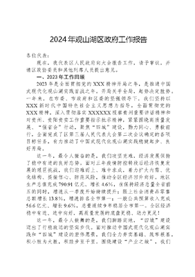 2024年观山湖区政府工作报告各位代表:现在,我代表区人民政府向大会报告工作,请予审议,并请区政协委员和其他列席人员提出意见。一、2023年工作回顾2023年是全面贯彻党的XXX精神开局之年,是推进中国式现代化观山湖实践首战之年。开局关乎全局,起势决定胜势。一年来,在市委、市政府和区委的坚强领导下,我们坚持以XXX新时代中国特色社会主义思想为指导,全面贯彻党的XXX精神,深入贯彻落实XXXXXX视察贵州重要讲话精神和对贵州、贵阳贵安工作重要指示批示精神,紧紧围绕高质量发展、强省会行动,聚焦四城建设,勠力同心、勇毅前行,全面完成了区第三届人民代表大会第二次会议确定的各项目标任务,有力推动了中国式现代化观山湖实践稳健起步、良好开局。这一年,最令人振奋的是,我们攻坚克难,经济发展保持了稳中有进的良好态势。面对三年疫情防控转段后经济恢复发展的艰巨挑战,我们迎难而上、难中求成,着力扩大内需、优化结构、提振信心、防范风险,推动全区经济回升向好。地区生产总值完成790.91亿元、增长4.6%,在保持经济总量全省前五的同时,增速从一季度开始持续提升;限上社会消费品零售总额增长13.8%,增速排名全市第一;一般公共预算收入完成56.6亿元、增长9.6%,总量连续9年稳居全市第一。全区经济稳中有进、进中向好,高质量发展的底盘更稳、动力更足!这一年,最令人鼓舞的是,我们脚踏实地,四城建设迈出了行稳致远的坚实步伐。面对推动中国式现代化观山湖实践和四城建设的宏伟愿景,我们全力夯实基础、筑牢根基,积小胜为大胜,积跬步至千里。围绕建设产业之城,我们按照二三驱动、四化并进的思路,持续做精一产、做大二产、做强三产,结构更加合理、业态更加完善、效益更加突出、特色更加鲜明的现代产业体系初步形成。围绕建设宜居之城,我们持续拓空间、强配套、重管理、优服务,不断提高城市生活便利度、环境优美度、治理精细度、资源承载度、社会文明度,吸引了更多人来此居住生活,去年新增常住人口4.5万人。围绕建设活力之城,我们大力提升开放程度、创新力度、年轻热度和市场活跃度,尤其是去年精心打造了爱乐之城专属品牌,先后举办大中型文体活动40余场、吸引近65万人次,城市活力持续迸发。围绕建设幸福之城,我们坚持在发展中保障和改善民生,推动实现就业更多、收入更高、就读更好、看病更易、办事更方便、社会更和谐,辖区居民获得感更加充实、幸福感更可持续、安全感更有保障。这些都为四城建设提速提质打下了良好基础、提供了坚实支撑!这一年,最令人自豪的是,我们争先创优,黔中会客厅收获了备受瞩目的珍贵荣誉。面对高质量发展的新形势新要求,我们开拓创新、锐意进取,全力为观山湖争荣誉、为会客厅添光彩。荣获国家级荣誉11项、省级荣誉15项;连续两年入选中国西部地区综合竞争力百强区,在全省入选的各区中稳居第一;成功入选中国文化产业竞争力百强区;打造城市文旅品牌建设宜居宜业宜游现代化新城区实践案例、楼宇经济发展管理经验在全国推广。中央、省、市主流媒体频频聚焦,推出观山湖区相关报道1.97万条。黔中会客厅·美美观山湖品牌持续擦亮,引领力、带动力持续增强!回顾过去一年,困难超出预期,但结果好于预期。我们主要做了以下工作:一年来,我们围绕实体强支撑,产业发展更加高质。坚持把发展经济的着力点放在实体经济上,深入调结构、促转型,产业体系不断优化、产业质效持续提升。 一是新型工业化高质量推进。主导产业快速集聚。围绕文可居文库——海量学习资料,手机电脑均可下载www.wenkeju.com一主一特和新能源汽车,持续扩增量、优存量。新引进艾斯谱光电、展旺食品、华阳宇光等项目34个,盼盼食品等12个项目建成投产,吉利纯电车型进入技改试制阶段,规上工业增加值继续保持两位数以上的增长、增速达12.4%。企业活力持续迸发。大力推动工业企业转型升级、提能增效,新培育专精特新企业7家、创新型中小企业20家,规上工业企业突破50家。工业项目加快推进。紧盯筑巢引凤,生态食品产业园建设全面启动,电子信息制造产业园连片建成,新建成标准厂房60.9万平方米、累计达200万平方米,工业投资完成24.3亿元、增长7.4%。园区功能更加完善。地、路、电、证等重点要素保障有力,收储工业用地522亩;园区十二号路、盼盼(中安)10千伏电力专线建成投用;园区经济事项入驻率达100%,为企业免费帮代办证照85个。产学研用生态逐步形成,与中科院、江南大学等20余所科研院校开展合作,搭建交流平台,园区产教融合生态圈加快构建。二是现代服务业高质量发展。金融赋能更实。金融城集聚效应加速放大,新引进保险等金融及专业服务机构82家、总数达496家,基金小镇基金规模达1500亿元。金融赋能实体经济质效增强