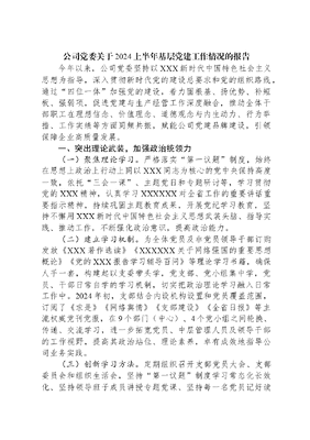 公司党委关于2024上半年基层党建工作情况的报告今年以来,公司党委坚持以XXX新时代中国特色社会主义思想为指导,深入贯彻新时代党的建设总要求和党的组织路线,通过四位一体加强党的建设,着力固根基、扬优势、补短板、强弱项,促进党建与生产经营工作深度融合,推动全体干部职工在理想信念、价值理念、道德观念与内生动力、行为举措、工作实绩等方面同频共振,赋能公司党建品牌建设,引领保障企业高质量发展。一、突出理论武装,加强政治统领力(一)聚焦理论学习。严格落实第一议题制度,始终在思想上政治上行动上同以XXX同志为核心的党中央保持高度一致,依托三会一课、主题党日和专题研讨等,学习贯彻党的XXX精神,认真学习XXXXXX对全省工作的重要讲话重要指示精神,持续巩固主题教育成果,开展党纪学习教育,坚持不懈用XXX新时代中国特色社会主义思想武装头脑、指导实践、推动工作,不断强化政治意识,提高政治能力。(二)建立学习机制。为全体党员及非党员领导干部订购发放《XXX著作选读》《XXXXXX关于网络强国的重要思想概论》《党的XXX报告学习辅导百问》等理论学习书籍,确保人手一套,构建起以支委带头学,党支部、党小组集中学,党员、干部日常自学的学习机制,切实把政治理论学习融入日常工作中。2024年初,支部结合内设机构设置和党员覆盖范围,订阅了《求是》《网络舆情》《支部建设》《全省日报》等主流权威党刊党报,在