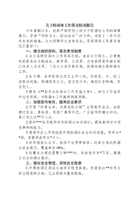 关于防溺水工作落实情况报告今年暑期以来,我县严格贯彻上级关于防溺水工作的部署要求,坚持预防为主、防治结合的方针,采取了一系列切实有效的措施,全力保障学生生命安全。现将具体工作落实情况汇报如下:一、健全组织架构,落实责任制度1.成立县级防溺水工作领导小组,由县长任组长,分管教育的副县长任副组长,教育局、公安局、应急管理局等相关部门负责人为成员。下设办公室在教育局,统筹协调全县防溺水工作。2.各乡镇、各学校相应成立工作小组,形成县、乡、校三级联动机制。明确职责分工,签订责任书,做到任务明确、责任到人。3.制定《**县学生防溺水工作实施方案》,细化工作流程和应急预案,为防溺水工作提供制度保障。二、加强宣传教育,提高安全意识1.开展珍爱生命,远离危险水域主题教育活动。各校通过班会、黑板报、校园广播等形式,广泛宣传防溺水知识,累计受众达**万人次。2.组织余名教师参加防溺水知识培训,提高教师应对突发事件的能力。3.邀请专业人员到校园开展防溺水安全知识讲座,共举办**场,直接受益学生*万人。4.利用微信公众号、短信平台等新媒体,向家长推送防溺水安全提示,覆盖率达98%。5.在重点水域设置警示牌块,发放宣传单*万份,提高全社会防溺水意识。三、强化安全管理,消除安全隐患1.开展校园及周边水域安全隐患排查,共排查出**处存在安全隐患的水域,已全部落实整改措施。2.在危险水域安装监