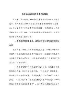 某市全面深化改革工作情况报告近年来,我市坚持以XXX新时代中国特色社会主义思想为指导,深入贯彻XXXXXX对全省工作的重要讲话和指示批示精神,坚决落实党中央和省委各项决策部署,坚持顶层设计与基层探索良性互动,高站位推进各项改革措施落地落实,为全市经济社会发展注入强劲动能。一、聚焦经济高质量发展,深化经济体制和生态文明体制改革我市完整、准确、全面贯彻新发展理念,积极主动融入国家战略,以改革激发社会发展和创新活力,助推经济实现质的有效提升和量的合理增长。2022年全市地区生产总值突破千亿元大关,位居全省第二。(一)推动有效市场和有为政府更好结合。扎实推进供给侧结构性改革、传统产业转型升级、三元双向循环农业、新兴数字产业等改革发展,稳步构建起了四千四百八大产业链。三元双向循环农业发展模式入选中国改革2023年度地方全面深化改革典型案例,我市获批创建国家农业绿色发展先行区。初步搭建东数西算完整产业架构,建成标准机架1.5万架,智算规模突破1.8万P,算力消纳85%以上,我市先后获得东数西算标杆城市和全国算力高质量发展先锋奖。(二)推动产城融合互促发展。制定《加快区域性中心城市建设意见》,配套出台公共设施建设、生态质量提升等9个工作方案,推动城市功能完善、实力壮大。按照控制总量、盘活存量,优化布局、科学定位,完善设施、做大做强的总体思路,以西峰、驿马、长庆