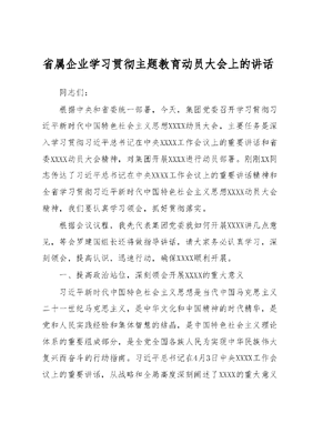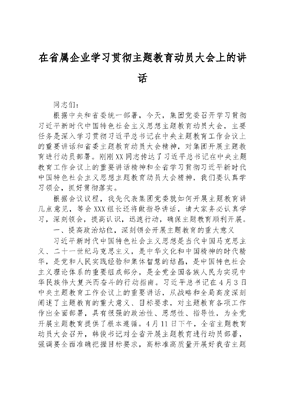 在省属企业学习贯彻主题教育动员大会上的讲话同志们:根据中央和省委统一部署,今天,集团党委召开学习贯彻习近平新时代中国特色社会主义思想主题教育动员大会,主要任务是深入学习贯彻习近平总书记在中央主题教育工作会议上的重要讲话和省委主题教育动员大会精神,对集团开展主题教育进行动员部署。刚刚XX同志传达了习近平总书记在中央主题教育工作会议上的重要讲话精神和全省学习贯彻习近平新时代中国特色社会主义思想主题教育动员大会精神,我们要认真学习领会,抓好贯彻落实。根据会议议程,我先代表集团党委就如何开展主题教育讲几点意见,等会XXX组长还将做指导讲话,请大家务必认真学习,深刻领会,提高认识,迅速行动,确保主题教育顺利开展。一、提高政治站位,深刻领会开展主题教育的重大意义习近平新时代中国特色社会主义思想是当代中国马克思主义、二十一世纪马克思主义,是中华文化和中国精神的时代精华,是党和人民实践经验和集体智慧的结晶,是中国特色社会主义理论体系的重要组成部分,是全党全国各族人民为实现中华民族伟大复兴而奋斗的行动指南。习近平总书记在4月3日中央主题教育工作会议上的重要讲话,从战略和全局高度深刻阐述了主题教育的重大意义、目标要求,对主题教育各项工作作出全面部署,具有很强的政治性、思想性、指导性,为全党开展主题教育提供了根本遵循。4月11日下午,全省主题教育动员大会召开,韩俊书记对全省开展主题教育进行动员部署,强调要全面准确把握目标要求,高标准高质量开展好我省主题教育,实现认识大提升、问题大梳理、工作大推动、作风大转变、环境大优化。各级党组织和广大党员干部要深入学习贯彻习近平总书记重要讲话精神,认真学习贯彻党中央和省委决策部署,在省委巡回指导组的指导下,从讲政治的高度坚决抓好主题教育在集团公司走深走实,取得实实在在的效果。一是开展主题教育,是坚持不懈用习近平新时代中国特色社会主义思想凝心铸魂、武装头脑的重大部署。回望我们党一百多年的奋斗历程,之所以能够不断取得革命、建设、改革的伟大胜利和辉煌成就,很重要的一条历史经验,就是坚定维护坚强领导核心、始终坚持科学理论指导。党的十八大以来,新时代十年的伟大变革,最根本的原因,在于有习近平总书记作为党中央的核心、全党的核心掌舵领航,在于有习近平新时代中国特色社会主义思想科学指引。实践充分证明,两个确立是推动党和国家事业取得历史性成就、发生历史性变革的决定性因素,是我们战胜一切艰难险阻、应对一切不确定性的最大确定性、最大底气、最大保证;两个维护是保证党中央集中统一领导的关键所在,是最根本的政治纪律和政治规矩,必须坚定拥护、坚决做到。各级党组织要通过主题教育教育,进一步推动广大党员、干部学懂弄通做实习近平新时代中国特色社会主义思想,在思想上正本清源、固本培元,推动广大党员、干部更加自觉深刻领悟两个确立的决定性意义,增强四个意识、坚定四个自信、做到两个维护。要教育引导党员、干部从思想上不断增进对党的创新理论的政治认同、思想认同、理论认同、情感认同,始终在思想上政治上行动上同以习近平同志为核心的党中央保持高度一致,做到心往一处想、劲往一处使,自觉用习近平新时代中国特色社会主义思想指导各项工作,为奋进新征程、建功新时代提供坚强有力的政治引领和政治保障。二是开展主题教育,是全面加强新时代党的建设,营造风清气正政治生态的必然要求。习近平总书记强调,全面从严治党永远在路上,要以刮骨疗伤的勇气、坚忍不拔的韧劲,同一切影响党的先进性、弱化党的纯洁性的问题作坚决斗争,努力把我们党建设得更加坚强有力。这一重要论述,充分表明了我们党敢于直面问题、勇于刀刃向内、永葆先进纯洁的坚强意志和决心。在全党深入开展学习贯彻习近平新时代中国特色社会主义思想主题教育,是党中央为全面贯彻党的二十大精神、动员全党同志为完成党的中心任务而团结奋斗所作的重大部署,是深入推进新时代党的建设新的伟大工程的重大部署,对于统一全党思想、全面从严治党、解决党内存在的突出问题、推动党和国家事业发展,具有十分重要的意义。全面从严治党是党永葆生机活力、走好新的赶考之路的必由之路。各级党组织要深刻认识开展主题教育是坚持管党治党严的基调、严的措施、严的氛围的内在要求,牢记全面从严治党永远在路上、党的自我革命永远在路上,主动接受政治体检,纠正行为偏差,不断增强自我净化、自我完善、自我革新、自我提高的能力,把各级党组织和党员干部队伍建设得更加坚强有力,引领和保障AAXX事业行稳致远。三是开展主题教育,是激励党员干部奋发有为干事创业,推进XX产业高质量发展的迫切需要。党的二十大描绘了全面建设社会主义现代化国家、以中国式现代化全面推进中华民族伟大复兴的宏伟蓝图。把党的二十大描绘的宏伟蓝图变成现实要靠拼、要靠干,要把高质量发展作为全面建设社会主义现代化国家的首要任务。实现这一