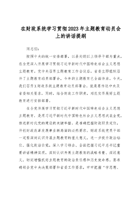在财政系统学习贯彻2023年主题教育动员会上的讲话提纲同志们:按照中央的统一安排部署,以县处级以上领导干部为重点,在全党深入开展学习贯彻习近平新时代中国特色社会主义思想主题教育。党中央召开主题教育工作会议后,省委立即组织召开了主题教育动员部署会,今年的主题教育已全面开启。今天,我们召开X财政系统主题教育动员部署会,就是要传达中央及省委相关要求,同时,结合财政工作职责,对扎实开展好主题教育进行安排部署。在全党开展学习贯彻习近平新时代中国特色社会主义思想主题教育,是用习近平新时代中国特色社会主义思想武装全党,推进新时代党的建设的关键举措,是准确把握财政职责定位,开创财政改革发展事业新局面的必然要求。财政系统党员干部一定要深刻认识开展主题教育的重大意义,进一步提升政治站位、强化政治自觉,深入学习领会、全面把握习近平总书记重要讲话精神实质,深刻认识开展主题教育的战略考量、深远意义,切实增强抓好主题教育的政治责任感和历史使命感。要准确领会党中央决策部署和省委工作要求,牢牢把握学思想、强党性、重实践、建新功的总要求,坚持学思用贯通、知信行统一,紧扣凝心铸魂筑牢根本、锤炼品格强化忠诚、实干担当促进发展、践行宗旨为民造福、廉洁奉公树立新风的具体目标,努力在以学铸魂、以学增智、以学正风、以学促干上取得实实在在的成效,把习近平新时代中国特色社会主义思想转化为坚定理想、锤炼党性和指导财政实践、推动财政事业高质量发展的强大力量。第一,坚持把加强理论学习、强化理论武装贯穿始终,在旗帜鲜明讲政治中推动主题教育走深走实。习近平总书记在主题教育工作会议上的重要讲话,深刻阐述了开展主题教育的重大意义和目标要求,对深入开展主题教育作出全面部署,具有很强的政治性、思想性、指导性,是又一篇马克思主义纲领性文献。中央主题教育工作会议已经进行了全面动员、全面部署,全省主题教育工作会议也提出了明确具体的要求,财政部召开的主题教育动员部署会,动员广大财政干部深入开展主题教育,以奋发有为的精神状态推进财政事业高质量发展,我们一定要认真学习领会、深入贯彻落实。要迅速掀起学习热潮,切实把思想和行动统一到党中央决策部署上来,深刻领会开展主题教育是用党的创新理论统一全党思想意志行动的必然要求,是推动党员干部积极担当作为,不断开创财政事业发展新局面的必然要求,是深入推进全面从严治党,推动党的建设高质量发展的必然要求。以高度的政治自觉开展好主题教育,通过开展主题教育,引导全体党员坚定拥护两个确立、坚决做到两个维护,以实干精神推进各项工作取得新成效,以自我革命精神坚守初心和使命。要把理论学习、调查研究、推动发展、检视整改、建章立制贯通起来,坚持边学习、边对照、边检视、边整改,解决好理论学习、政治素质、能力本领、担当作为、工作作风、廉洁自律六个方面的突出问题,确保主题教育达到预期效果。第二,坚持把理论联系实际、促进工作开展贯穿始终,在把牢总体要求中推动主题教育走深走实。要准确把握这次主题教育学思想、强党性、重实践、建新功的总要求,坚持学思用贯通,知信行统一,把深入学习贯彻习近平新时代中国特色社会主义思想这一根本任务作为主题主线,坚持学思用贯通、知信行统一。真正把习近平新时代中国特色社会主义思想转化为坚定理想、锤炼党性和指导实践、推动工作的强大力量,努力在以学铸魂、以学增智、以学正风、以学促干方面取得实实在在的成效,紧盯根本任务推动落实,达到凝心铸魂筑牢根本、锤炼品格强化忠诚、实干担当促进发展、践行宗旨为民造福、廉洁奉公树立新风具体目标。要通过领导领学、集中交流,专家授课、现场教学等多种方式,引导党员干部汲取理论营养,探索更高质量、更有成效、更可持续发展的新路径,在学习中结合工作实际、岗位职责,去解决问题、推动工作。要将学习成果转化为推动工作的实际成效,进一步高站位扛牢服务中心大局和重大战略的政治担当,在促发展、惠民生、保运转、强监管等方面展现应有的担当和作为,不断凝聚奋进新征程、建功新时代的强大动力。第三,把着力破解难题、解民忧办实事贯穿始终,在紧扣根本任务中推动主题教育走深走实。主题教育要走深走实,离不开深入务实的调查研究,通过调研获得真知灼见、掌握真情实况、推动真抓实干。要牢牢把握坚持学思用贯通、知信行统一的根本任务,突出提升能力本领,把马克思主义看家本领学到手,发扬斗争精神,增强斗争本领,提高调查研究能力、改革攻坚能力、群众工作能力等解决实际问题的能力,通过主题教育进一步解决群众急难愁盼问题,着力让的群众获得感成色更足、幸福感更可持续、安全感更有保障。首先要真想发想问题,把关注重点放在还没有掌握或者了解把握还不够深入的问题上,放在制工作高质量发展的重点问题上,把各方面反映的问题汇集起来,切实把问题找准找实。其次,调研要务实高效,扑下身子、沉到一线、挽起袖子,深入蹲点调研