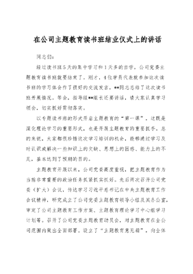 在公司主题教育读书班结业仪式上的讲话同志们:经过读书班5天的集中学习和1天多的自学,公司党委主题教育读书班就要结束了。刚才,4位学员代表就参加这次读书班的学习体会作了很好的交流发言,**同志总结了这次读书班开展情况。等会,指导组**组长还要讲话,请大家认真学习领会,切实抓好贯彻落实。以专题读书班的形式开启主题教育的第一课,这既是深化理论学习的重要形式,也是开展主题教育的重要抓手。总的来说,大家都很珍惜这次学习培训的机会,能够通过学习及时认识或解决一些知识上的欠缺、思想上的困惑、能力上的不足,基本达到了预期的目的。主题教育开展以来,公司党委高度重视,把主题教育作为当前非常重要的政治任务抓紧抓实抓好。先后两次召开公司党委(扩大)会议,传达学习习近平总书记在中央主题教育工作会议精神,研究成立了公司党委主题教育领导小组及其办公室,审定了公司主题教育工作方案、主题教育理论学习中心组学习计划等。召开了公司党委主题教育动员会,对主题教育在全公司范围内做出全面部署。设立了主题教育意见箱,向全体党员干部发放了主题教育学习必读书籍。同时,在公司楼宇电子显示屏、一楼大厅LED显示屏、OA办公系统登录界面等循环播放主题教育相关内容,积极转载学习贯彻习近平新时代中国特色社会主义思想主题教育宣传标语,做到抬头可见、随处可学。截止目前,公司主题教育共发简报*期,刊发各类稿件**余篇,在公司范围内营造良好的学习氛围。下面,我就深入贯彻落实党中央和**党委关于主题教育的决策部署,坚持用习近平新时代中国特色社会主义思想武装头脑、指导实践、推动工作,结合公司实际,讲几点意见。一、加强学习,坚持用习近平新时代中国特色社会主义思想武装头脑习近平总书记指出:读书可以让人保持思想活力,让人得到智慧启发,让人滋养浩然之气。在公司改革发展的关键时期,公司给大家压的担子只会更重、要求只会更高,肩负的责任只会更大。越是这样,越要求大家要加强理论学习,提升自身理论素养,尤其要加强对习近平新时代中国特色社会主义思想的学习,真正掌握蕴含其中的科学世界观和方法论,切实推动工作指导实践。一要持之以恒学习。大家每天的日常工作、生活已经占据了很大一部分时间与精力,部分同志对待学习时存在应付式地学,走马观花地学,看似雄心勃勃,其实虎头蛇尾,知之为知之,不知仍然为不知。要树立终身学习的理念,持之以恒,融会贯通,把学习作为一种政治责任、一种精神追求,当作终身课,切实提高自身理论素养。二要干部带头学习。全面从严治党,狠抓党风廉政建设,关键点就是抓住领导干部这一关键少数。学习也是一样,领导干部自己不学习,怎么带动身边的人学习,怎么形成良好的学习习惯和雷打不动的学习制度。作为领导干部,大家要认真学习党的创新理论,为干部职工做出表率。读书班集中学习结束后,公司领导小组办公室要精心举办好补习班,此次读书班期间因特殊原因请假的人员均要参加,原则就是缺多少补多少,确保不少一人、不落一课。三要学以致用。宋代学者朱熹说过:为学之实,固在践履。苟徒知而不行,诚与不学无异。这句话的意思是说,学习的目的在于实践,如果只是明白道理而不去做,那么学与不学就没有什么区别了。因此在日常学习中,大家要坚持理论联系实际,强化问题意识、担当意识、创新意识,把所学知识与自己的工作实际紧密结合起来,使自己的思想、能力、行动跟上新时代前进步伐,跟上**事业快速发展需要。二、履职尽责,勇担新时代赋予的历史使命习近平总书记强调,责任担当是领导干部必备的基本素质,干部就要有担当,有多大担当才能干多大事业,尽多大责任才会有多大成就。总书记还提出了领导干部八个担当:矢志不渝的民族担当;无私奉献的为民担当;坚定不移的改革担当;恪尽职守的职责担当;五是互惠共赢的大国担当;六是强军兴军的治军担当;七是敢抓敢管的治党担当;八是好干部的为官担当。在座各位是公司的关键少数,上有组织的重托,下有员工的期待,作用十分关键。一要切实增强履职本领。要不断提高自身素养,持之以恒加强思想淬炼、政治历练、实践锻炼、专业训练,经受意志定力、耐心耐力、担当精神等考验,培养斗争精神,提升斗争本领,在斗争实践中经风雨、见世面、长才干、壮筋骨,要提高政治能力、调查研究能力、科学决策能力、改革攻坚能力、应急处突能力、群众工作能力、抓落实能力,勇于直面问题,想干事、能干事、干成事,不断解决问题、破解难题。二要大力弘扬实干担当精神。要树立从严从实的工作作风,对职责范围内的事一定要大胆干、放手干,特别是该决策时果断决策,该拍板时大胆拍板,决不能矛盾上交、责任下推、难题后拖。要发扬钉钉子的精神,对定下来的事情、明确了的任务,争分夺秒、紧抓快办,做到问题不解决不放过,事情无回音不放过,抓落实细节不放过,承诺的事情坚决兑现,既定的事情坚决办成,营造凭能力用干部、以实绩论英