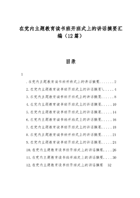 在党内主题教育读书班开班式上的讲话摘要汇编(12篇)目录1.在党内主题教育读书班开班式上的讲话摘要.22.在党内主题教育读书班开班式上的讲话摘要\..43.在党内主题教育读书班开班式上的讲话摘要84.在党内主题教育读书班开班式上的讲话摘要..105.在党内主题教育读书班开班式上的讲话摘要..146.在党内主题教育读书班开班式上的讲话摘要..167.在党内主题教育读书班开班式上的讲话摘要..188.在党内主题教育读书班开班式上的讲话摘要..219.在党内主题教育读书班开班式上的讲话摘要..2410.在党内主题教育读书班开班式上的讲话摘要.2611.在党内主题教育读书班开班式上的讲话摘要.3012.在党内主题教育读书班开班式上的讲话摘要32在党内主题教育读书班开班式上的讲话摘要理论强才能方向明。深刻认识学习贯彻习近平新时代中国特色社会主义思想是新时代新征程开创教育事业发展新局面的根本要求,是凝心铸魂、坚定理想信念的需要,是锤炼品格、铸牢对党忠诚的需要,是践行宗旨、站稳人民立场的需要。要深刻领悟两个确立的决定性意义,切实增强四个意识、坚定四个自信、做到两个维护,深刻理解习近平新时代中国特色社会主义思想的道理学理哲理,切实增强对党的创新理论的政治认同、思想认同、理论认同、情感认同。教育系统涉及3.1亿师生,教育部要在主题教育中发挥风向标作用,努力带好头、做表率,持续建设让党中央放心、让人民群众满意的模范机关,走好践行两个维护的第一方阵,示范带动教育系统主题教育走深走实,在以学铸魂、以学增智、以学正风、以学促干上取得实效。把学思想、强党性、重实践、建新功的总要求贯穿主题教育全过程,把学习贯彻习近平新时代中国特色社会主义思想这一根本任务作为鲜明主线。一要全面学习领会习近平新时代中国特色社会主义思想的科学体系和精髓要义,熟练掌握蕴含其中的思想方法、领导方法和工作方法,努力提高攻坚克难、化解矛盾、驾驭复杂局面的能力,真正把马克思主义看家本领学到手。二要全面学习领会党的二十大作出的新部署新要求,立足到2035年建成教育强国这一重要战略安排,牢牢把握培养什么人、怎样培养人、为谁培养人这一教育根本问题,全面提高人才自主培养质量这一战略必争任务,办好人民满意的教育这一鲜明价值追求,切实增强加快建设教育强国的信心决心。三要全面学习领会习近平总书记关于教育的重要论述,牢牢把握做好新时代教育工作的根本遵循,坚持为党育人、为国育才,全面贯彻党的教育方针,落实立德树人根本任务,对全面建设社会主义现代化国家,全面推进中华民族伟大复兴作出更多实质性贡献。四要全面学习领会新时代教育事业发展面临的内外部形势用立体多维的视角看待教育的历史方位,跳出教育看教育,立足全局看教育,放眼长远看教育,把教育摆在经济社会、科技发展和国家安全的全局中,切实加强推进教育高质量发展的前瞻性思考、全局性谋划。要把发扬理论联系实际的马克思主义学风贯穿始终,原原本本带着感情学,结合调研带着问题学,知行合一率先垂范学,把自己的思想摆进去,把工作摆进去,把职责摆进去,真正静下心来学习、沉下心来思考、潜下心来感悟,把习近平新时代中国特色社会主义思想内化于心、外化于行。在党内主题教育读书班开班式上的讲话摘要\读书班主题鲜明突出、日程安排紧凑、内容系统丰富、研讨求真务实,是一次全面深刻的政治教育、理论熏陶、思想淬炼、精神洗礼。通过集中学习,大家思想上有触动、理论上有提高、认识上有深化,进一步加深了对两个确立的决定性意义、习近平新时代中国特色社会主义思想、习近平总书记关于xx工作的重要指示的理解,增强了推进xx长治久安和高质量发展的责任感使命感紧迫感,达到了统一思想、统一意志、统一行动的目的。习近平新时代中国特色社会主义思想是推动新时代党和国家事业不断向前发展的科学指南。全区各级各部门和广大党员干部要全面系统融会贯通地理解和把握其中蕴含的科学世界观、方法论,用以武装头脑、指导实践,推动社会主义现代化新xx建设。始终坚持人民至上,着力解决好人民群众的急难愁盼问题实现好、维护好、发展好最广大人民根本利益,不断提高各族群众的获得感幸福感安全感。始终坚持自信自立,教育引导全区各族群众从新旧xx的强烈对比中,特别是在党的十八大以来身边发生的巨大变化中,深刻体会到只有坚定不移走中国特色社会主义道路,才会有幸福的今天和更加美好的明天,坚定不移走好中国式现代化道路。始终坚持守正创新,准确识变、科学应变、主动求变,深刻把握工作规律和形势变化,紧跟时代步伐,顺应实践发展,以新的理论指导新的实践。始终坚持问题导向,增强问题意识,把工作着力点放在最突出的矛盾和问题上,把认识和化解矛盾作为打开工作局面的突破口,