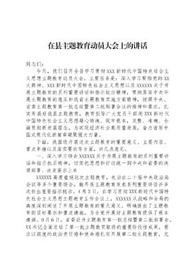 在县主题教育动员大会上的讲话同志们:今天,我们召开全县学习贯彻XXX新时代中国特色社会主义思想主题教育动员大会,主要任务是:深入学习贯彻党的XX大精神、XXX新时代中国特色社会主义思想以及XXXXXX关于开展主题教育的系列重要讲话和指示批示精神,贯彻落实中央开展主题教育的意见和我省主题教育实施方案精神,按照中央、省委主题教育第一批总结暨第二批部署会议的精神和要求,扎实开展好我县主题教育,教育引导广大党员干部用XXX新时代中国特色社会主义思想凝心铸魂、筑牢根本,完整、准确、全面贯彻新发展理念,为实现经济社会高质量发展,奋力谱写中国式现代化新篇章凝聚强大力量。下面,我围绕开展这次主题教育的重要意义、主要内容、重点举措以及落实要求等方面,讲几点意见。一、深入学习领会XXXXXX关于开展主题教育的系列重要讲话和指示批示精神,切实把思想和行动统一到中央和省委的决策部署、决定要求上来XXXXXX高度重视这次主题教育,先后在二十届中央政治局会议等多个重要场合,就开展主题教育发表系列重要讲话并多次作出重要指示批示。4月3日,在学习贯彻XXX新时代中国特色社会主义思想主题教育工作会议上,XXXXXX从战略和全局的高度深刻阐述了开展主题教育的重大意义,明确提出了主题教育的目标要求和重点措施,为全党开展好主题教育提供了根本遵循。9月6日,省委召开主题教育第一批总结暨第二批部署会,XX书记全面总结了第一批主题教育取得的重要阶段性成果,要求以高度的政治责任感和使命感扎实开展第二批主题教育,充分学习借鉴第一批主题教育的成果和经验,切实把握好第二批主题教育的总体要求和着力点,把中央部署不折不扣落实到主题教育全过程,把工作做深做细做实,这为全县开展主题教育指明了路径。全县各级党组织和广大党员干部要提高政治站位,深入学习领会、全面准确把握XXXXXX关于开展主题教育的系列重要讲话和指示批示精神,充分认识到开展这次主题教育的对推动党和国家事业发展、推动自贸港建设、推动三亚高质量发展的重大意义,切实把思想和行动统一到中央和省委部署、要求上来,扎实开展好这次主题教育。二、对标对表,准确把握主题教育的目标任务要求第二批主题教育,总的要求同第一批是一致的。我们要结合自身实际情况,紧紧围绕主题教育的根本任务,聚焦具体目标,对标对表,确保主题教育不虚不偏。(一)准确把握根本任务。这次主题教育的根本任务是坚持学思用贯通、知信行统一,把XXX新时代中国特色社会主义思想转化为坚定理想、锤炼党性和指导实践、推动工作的强大力量,使全党始终保持统一的思想、坚定的意志、协调的行动、强大的战斗力,努力在以学铸魂、以学增智、以学正风、以学促干方面取得实实在在的成效。准确把握这一根本任务,是确保主题教育扎实开展、取得实效的基本前提。围绕这一根本任务,我们要做好学习贯彻XXX新时代中国特色社会主义思想的深化、内化、转化工作,从思想正本清源、固本培元,筑牢信仰之基、补足精神之钙、把稳思想之舵,坚定捍卫两个确立、坚决做到两个维护,始终在思想上政治上行动上同以XXX同志为核心的党中央保持高度一致。我们要从党的科学理论中悟规律、明方向、学方法、增智慧,把看家本领、兴党本领、强国本领学到手,切实担负好党和人民赋予的政治责任,努力把以学增智的实效体现到提升政治能力、思维能力、实践能力上。我们要坚持目标导向和问题导向相结合、学查改相贯通,大兴务实之风,弘扬清廉之风,抓好调查研究,重实干求实效。我们要紧密结合工作职责需要,教育引导广大党员干部落实重实践要求,坚持学思用贯通、知信行统一,真正把学习成果转化为推动高质量发展的实招、硬招、妙招、高招。(二)牢牢把握总要求。这次主题教育的总要求是学思想、强党性、重实践、建新功,这12个字是是一个紧密联系、相互贯通、内在统一的整体。学思想,就是要全面学习领会新时代中国特色社会主义思想,全面系统掌握这一思想的基本观点、科学体系,把握好这一思想的世界观、方法论,坚持好、运用好贯穿其中的立场观点方法,不断增进对党的创新理论的政治认同、思想认同、理论认同、情感认同,真正把马克思主义看家本领学到手,自觉用新时代中国特色社会主义思想指导各项工作。强党性,就是要自觉用新时代中国特色社会主义思想改造主观世界,深刻领会这一思想关于坚定理想信念、提升思想境界、加强党性锻炼等一系列要求,始终保持共产党人的政治本色。重实践,就是要自觉践行新时代中国特色社会主义思想,用以改造客观世界、推动事业发展,解决经济社会发展和党的建设中存在的各种矛盾问题。建新功,就是要从新时代中国特色社会主义思想中汲取奋发进取的智慧和力量,断提高履职尽责的能力和水平,凝心聚力促发展,驰而不息抓落实,立足岗位作贡献,努力创造经得起历史和人民检验的实绩。(三)紧紧锚定具体目标。这次主题教育的具体目标是凝心
