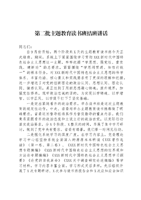第二批主题教育读书班结班讲话同志们:自9月份开始,两个阶段共X天的主题教育读书班今天正式结班。期间,系统上下紧紧围绕学习贯彻XXX新时代中国特色社会主义思想这一主题,牢牢把握学思想、强党性、重实践、建新功的总要求,紧紧围绕学思用贯通、知信行统一的根本任务,对XXX新时代中国特色社会主义思想的科学体系、丰富内涵、核心要义和实践要求有了更深的理解和把握,进一步增进了对党的创新理论的政治认同、思想认同、理论认同、情感认同,真正达到了用新思想凝心铸魂,提升境界,加强党性修养,筑牢政治忠诚的目的,为实现以学铸魂、以学增智、以学正风、以学促干打下了坚实基础。一是突出紧随看齐的政治要求。举办读书班是这次主题教育的规定性动作,中央、省委对举办主题教育读书班都做了明确要求,省委巡回督导组将其作为督促指导的重点内容。我们秉承紧跟看齐的政治态度和立说立行的政治自觉,以实际行动落实政治要求,分X个阶段、X整天的时间,开展了集中学习研讨,做到了党中央有要求、省委有部署,我们第一时间见行动。二是强化系统学习的深度广度。在学习内容上,党委理论学习中心组坚持系统全面深入的原原本本研读《XXX著作选读》(第一卷、第二卷)、《XXX新时代中国特色社会主义思想专题摘编》《XXX新时代中国特色社会主义思想的世界观和方法论专题摘编》《XXX新时代中国特色社会主义思想学习纲要》《论党的自我革命》《XXX关于调查研究论述摘编》等学习材料,学习内容丰富全面。学习形式灵活多样,先后组织开展了X次专题研讨、X次参与读书班报告会和X次应知应会知识测试;X次安排集中学习;党委书记讲专题党课、党委班子成员及支部书记分别上专题党课。三是体现求真务实的优良作风。同志们都非常重视和珍惜这次读书班,党委理论学习中心组以身作则,率先垂范,在工作非常繁忙的情况下,始终以饱满的政治热情和良好的精神状态,积极克服时间紧、任务重的工学矛盾,认真学习体悟、深入交流研讨,沉下心来认真学习、深入思考,形成了良好的学习氛围,保障了学习时间和学习效果,展现了求真务实的优良学风。四是彰显学用结合的高度自觉。通过举办读书班,达到了学有所获、学以致用的效果。补足了精神之钙,对XXX新时代中国特色社会主义思想有了更加深刻的认识。提高了政治站位,对坚定理想信念、坚持人民立场等进行了深查细照,进一步坚定了对马克思主义的信仰,进一步加深了对两个确立的决定性意义的理解,核心意识更强了。强化了责任担当,直面高质量发展中的短板和弱项,坚持问题导向,深入调查研究,推动建章立制,体现出了责任和担当,展现出了决心和信心。这次主题教育不划阶段、不分环节,读书班只是一个良好的开端,读书班虽告一段落,但是学习教育永运在路上。下一步,系统上下将继续围绕教育和实践,找准结合点,狠抓关键点,全力推动事业高质量发展蹄疾步稳。一是要从XXX新时代中国特色社会主义思想中找遵循,在学思践悟中感悟真理力量。XXX新时代中国特色社会主义思想的世界观、方法论,蕴含着人民至上的政治立场,蕴含着从中国基本国情出发的重大原则,蕴含着自我革命的强烈政治担当,体现了价值取向和发展动力的辩证统一,体现了尊重实际和发扬历史主动的辩证统一,体现了守正固本和创新发展的辩证统一。系统上下务必坚持常学常新、久久为功,全面掌握XXX新时代中国特色社会主义思想的世界观、方法论和贯穿其中的立场观点方法,深刻理解认识六个必须坚持彰显的科学性和真理性、人民性和实践性、开放性和时代性,做到知其然更知其所以然,知其言更知其义、知其道更行其道,力求以学懂促深化、以弄通促内化、以做实促转化,以强化理论学习指导发展实践,以深化调查研究推动解决发展难题,用主题教育的真理之光照亮事业发展的奋进之路。二是要从XXX新时代中国特色社会主义思想中找方向,在知行合一中做到融会贯通。学而不思则罔。思考是学习的灵魂,是理论联系实际的桥梁纽带。必须要把学习成果转化为对奋斗目标的执着追求、对本职工作的不懈进取、对高尚情操的笃定坚持、对艰难险阻的勇于担当,全力以赴推动XXX新时代中国特色社会主义思想和党的XX大精神落地生根、开花结果。要将学习成效体现到以学铸魂上,聚焦解决思想根子问题,坚持不懈用党的创新理论成果凝心铸魂,不断筑牢信仰之基、补足精神之钙、把稳思想之舵,提高政治判断力、政治领悟力、政治执行力,衷心拥护两个确立,忠诚践行两个维护,确保在政治立场、政治方向、政治原则、政治道路上同以XXX同志为核心的党中央保持高度一致。要将学习成效体现到以学增智上,从党的科学理论中悟规律、明方向、学方法、增智慧,把看家本领、兴党本领、强国本领学到手,聚焦队伍建设任重道远、高水平安全筚路蓝缕、高质量发展刻不容缓、基本建设蓄势待发、民生保障持续攀升等当前工作中存在的突出矛盾,推动党员干部提高知重负重