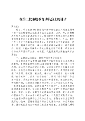 在第二批主题教育动员会上的讲话同志们:近日,学习贯彻XXX新时代中国特色社会主义思想主题教育第一批总结暨第二批部署会议在京召开。上周,市、区相继展开相关工作部署及动员会议,强调要把开展第二批主题教育作为重要政治任务紧紧抓在手上、牢牢扛在肩上。今天,我们召开全系统主题教育动员部署会,主要就是为了更好地统一思想认识,明确目标思路,推动主题教育高起点筹划、高质量展开。刚刚,X就如何推进本系统主题教育进行部署,希望各单位结合实际贯彻落实好,在这里,我就开展好主题教育提三点要求:一、坚持高站位谋划,把党的领导贯穿全过程在全党开展学习贯彻XXX新时代中国特色社会主义思想主题教育,是贯彻落实党的XX大精神的重大举措,对于统一全党思想、解决党内存在的突出问题、始终保持党同人民群众血肉联系、推动党和国家事业发展,具有重要意义。我们要牢牢把握学思想、强党性、重实践、建新功的总要求,把切实增强四个意识、坚定四个自信、做到两个维护作为第一要务,系统各级党组织要主动对标总要求、适应新形势、研究新问题,以提升政治能力为关键,从三个方面久久为功:一是要提高政治站位,坚决做到两个维护。系统各单位党组织都要对标查找、坚决纠正落实两个维护中存在的偏差、误差、落差、时差,做到党中央提倡的坚决响应,党中央决定的坚决执行,党中央禁止的坚决不做。二是要坚定政治方向,切实把握中国特色社会主义这个大方向。系统各单位党组织要践行初心使命,团结带领党员群众自觉贯彻中央、市委决策部署,推动党的路线方针政策在基层落地生根。三是要强化理论武装,自觉用XXX新时代中国特色社会主义思想武装头脑、指导实践、推动工作、教育群众。系统各单位党组织要组织基层党员干部认真学习XXX新时代中国特色社会主义思想,在学深悟透、融会贯通上下功夫,做到真学真懂、真信真用,推动学习贯彻新思想不断往深里走、往心里走、往实里走。二、坚持高质量发展,切实满足人民群众需求江山就是人民、人民就是江山,必须紧紧依靠人民创造历史,坚持全心全意为人民服务的根本宗旨,践行以人民为中心的发展思想。医疗卫生行业作为直面人民群众看病就医需求的窗口门户,必须紧扣群众反映强烈的民生难题,一件接着一件调研,一年接着一年解决,不断增强人民群众的获得感、幸福感、安全感。一是在服务体系构建中找准定位。深入调查研究新形势下公立医院发展的着力点与突破口,切实把发展方式从量的积累转向质的提升,结合区位优势和学科特长,合理定位、合理调配现有资源,加快推进服务能级和水平提升。二是要打造好特色服务品牌。深入分析公共医疗服务的需求,充分发挥急难重症方面诊疗的优势特长,对标最高标准、最好水平,持续优化多学科诊疗等先进医疗模式,以更加科学、集合的就医方式,让患者就医更加省心、放心。三是要着力提升群众就医体验。在深入总结好经验、好做法基础上,探索更多建立新型医患关系的有效手段和路径,让更多医学科普知识走进千家万户,也让广大百姓近距离了解、体会医务人员医德医风医术,进一步建设好让人民满意的医院。三、坚持严要求推进,提升党的建设工作水平强国建设、民族复兴的宏伟目标令人鼓舞、催人奋进,贯彻落实党的XX大精神,按照战略设计去逐项推进,对全党而言是一项伟大而艰巨的事业,任重道远。开展学习贯彻XXX新时代中国特色社会主义思想主题教育的根本任务是坚持学思用贯通、知信行统一,努力在以学铸魂、以学增智、以学正风、以学促干方面取得实实在在的成效。全系统党组织要按照新时期全面加强党的建设、全面从严治党的总体要求,进一步出实招、使实劲、求实效,以更加扎实作风抓好从严治党工作全面落实。一是要不断严密党的组织体系。结合实际情况,按照全面提升基层党建质量水平要求,比照调研结果,持续挖掘单位党建的特点和短板。进一步着眼基层一线实际,抓紧抓实对党建工作的分类指导和分类施策,推进党建和业务两融合、两促进,不断夯实并提升基层治理水平,教育引导系统党员干部坚定不移听党话、跟党走。二是要着力建设高素质干部队伍。要按照新时代好干部标准,结合行业特点,着力培养充满激情、富于创造、勇于担当的高素质干部队伍。三是要坚定不移推进从严治党。要将医药领域腐败问题集中整治工作与深化改革相结合,立足长效机制建设,着力修订制度、加强力量,进一步深化细化四责协同机制建设,持续打通落实廉政建设各个关节,加强权力运行全流程监管,持续营造风清气正良好生态。同志们,发出的动员令就是责任状。我们要把深入扎实开展第二批学习贯彻XXX新时代中国特色社会主义思想主题教育当作一件事关全局的大事,持围绕中心、服务大局,精准对标对表,把握特点规律,科学组织实施,做到两手抓、两促进,推动党员、干部强固好思想根本、焕发出学习热情、激发出工作干劲,推动主题教育走深走实、见行见效,为奋力谱写健康中国建设新篇章注入