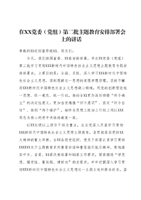 在XX党委(党组)第二批主题教育安排部署会上的讲话尊敬的XX巡回督导组XX、同志们:今天,我们按照省委、XX委安排部署,举办XX党委(党组)第二批学习贯彻XXX新时代中国特色社会主义思想主题教育专题安排部署会,主要目的是:全面、系统、深入学习XXX新时代中国特色社会主义思想,深刻理解这一思想的道理学理哲理,坚持不懈用XXX新时代中国特色社会主义思想凝心铸魂,用党的创新理论统一思想、统一意志、统一行动,推动全XX更加深刻领悟两个确立的决定性意义,更加自觉增强四个意识、坚定四个自信、做到两个维护,始终在思想上政治上行动上同以XXX同志为核心的党中央保持高度一致。以XX处级以上领导干部为重点,在全党深入开展学习贯彻XXX新时代中国特色社会主义思想主题教育,是贯彻落实党的XX大精神的重大举措。全XX各级党组织、党员干部要认真学习贯彻XXXXXX关于主题教育系列重要讲话和重要指示批示精神,贯彻落实中央、省委、XX委决策部署和XX委工作要求,紧紧围绕学思想、强党性、重实践、建新功的总要求,牢牢把握深入学习贯彻XXX新时代中国特色社会主义思想这一主题主线和根本任务,坚持学思用贯通、知信行统一,坚持同第一批主题教育衔接联动,坚持理论学习、调查研究、推动发展、检视整改、建章立制等重点措施有机融合、一体推进,全面落实以学铸魂、以学增智、以学正风、以学促干的重要要求,确保实现凝心铸魂筑牢根本、锤炼品格强化忠诚、实干担当促进发展、践行宗旨为民造福廉洁奉公树立新风的目标。为推动本次会议取得扎扎实实的成效,根据X委常委会会议讨论精神,我讲几点意见。第一,学习贯彻XXX新时代中国特色社会主义思想,必须坚持正确政治方向。坚持正确政治方向,就要始终以党的旗帜为旗帜以党的方向为方向、以党的意志为意志,始终做到在党言党、在党忧党、在党为党,任何时候都与党同心同德、同向同行。深刻领悟两个确立的决定性意义,教育引导党员、干部从思想上正本清源、固本培元,切实筑牢信仰之基、补足精神之钙、把稳思想之舵,更加自觉地衷心拥护两个确立、忠诚践行两个维护。第二,学习贯彻XXX新时代中国特色社会主义思想,必须坚持分级分类指导。第二批主题教育参加单位人员范围广、类型多、任务重,要按照主题教育印发的有关文件要求抓好贯彻落实。针对不同领域、不同群体特点,因地制宜、合理安排,增强主题教育的针对性和实效性。要确保各级各领域党员干部牢牢把握深入学习贯彻XXX新时代中国特色社会主义思想这一主题主线和根本任务,努力在以学铸魂、以学增智、以学正风、以学促干方面取得实实在在的成效,以高质量发展的新成效检验主题教育成果,第三,学习贯彻XXX新时代中国特色社会主义思想,必须坚持突出问题导向。坚持深学、细研、真查、实改,立足实际,既解决党员干部自身存在的问题,又解决群众最关心最直接的利益问题;既解决制约XX经济社会高质量发展的问题,又解决全面从严治党中的问题。坚持强化基层基础。以XXXX行动为总载体,围绕基层基础XX,发挥优势、注重引领、整合资源、解决难题、推进共治、凝聚群众,增强基层党组织政治功能和组织功能,为深入推进建设XX谱写全XX高质量发展提供坚实基础。第四,学习贯彻XXX新时代中国特色社会主义思想,必须坚持开门开展教育。深入一线,问需于民、问计于民、问效于民,虚心听取群众意见,自觉接受群众监督,主动接受群众评判。用群众的获得感、幸福感、安全感、满意度检验主题教育效果。要结合当前乡村振兴的重点任务,科学制定《XX遍访行动实施方案》绘出路线图、明确时间表,进村入户、遍访群众,宣传推广各项惠民措施及当前重点工作,同时全面摸清、解决好群众关心的热点难点问题。第五,学习贯彻XXX新时代中国特色社会主义思想,必须坚持从严从实作风。力戒形式主义、官僚主义,真抓实干、担当作为在注重实效、提高质量上下功夫。树立和践行正确政绩观,必须从思想和利益根源上破解问题,从讲政治的高度来把握求真务实真抓实干的要求,努力做到谋事实、创业实、做人实。不作表面文章、不搞花样翻新,把工作抓实、基础打实、步子迈实,确保主题教育取得扎实成效。我就讲这么多。谢谢!