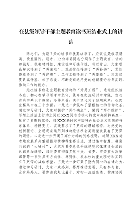 在县级领导干部主题教育读书班结业式上的讲话同志们,为期7天的读书班就要结束了,应该说是收获满满、受益匪浅。刚才,12位常委同志分别作了主题发言,讲的都很好,很有针对性、建设性和可操作性,可以看出,大家理论知识得到了再充电,理想信念得到了再补钙,党性修养得到了再淬炼,工作本领得到了再蓄能。同志们要认真借鉴、相互启发,不断提高运用党的创新理论指导实践、推动工作的能力。此次读书班是主题教育活动的开局工程,通过组织读书班,初心在学习思考中坚守,使命在交流研讨中增强,信心在共学共识中凝聚。总体来看,读书班达到了预期效果,收获主要集中在三个方面:一是进一步筑牢了紧跟核心的信仰之基。通过学习研讨,大家对拥护两个确立,做到两个维护,思想上政治上行动上同以XXX同志为核心的党中央保持高度一致有了更高的觉悟,对XXX新时代中国特色社会主义思想的科学体系、精髓要义、实践要求有了更深的理解感悟,对把党的创新理论、立场观点运用到推动经济社会高质量发展有了更深的领悟。二是进一步开阔了高位对标的战略视野。对照XXX对本地发展系列重要指示精神等重要论述,通过集中智慧、凝聚共识的大研讨,大家对县委总抓手统揽现代化建设全局的认识更加透彻,对县委贯彻落实党中央、省委、市委重大决策部署等一系列具有方向性、原则性、根本性的重大理论和实践有了更深的战略考量。三是进一步汇聚了勠力同心的奋进之力。通过学习研讨,大家一致感到,要想推动发展,只有参与者,没有局外人。要你追我赶比着干,对标一流创佳绩,构建协同协作机制,强化补台补位意识,一盘棋谋发展、一个调抓工作,始终想在一起、干在一起,形成千斤重担众人挑、众人拾柴火焰高的生动局面。同志们,这几天的读书班只是主题教育一个良好的开端,虽然读书班已经结束,但理论学习永无止境,大家不能精神懈怠、有所放松。希望大家紧扣学思想、强党性、重实践、建新功的总要求,坚持把理论学习、调查研究、推动发展、检视整改贯通起来,有机融合、一体推进,持续巩固好、运用好读书班学习收获,全力推动各项事业发展蹄疾步稳。下面,我讲三点意见。第一,要真学真信,持续做好深化文章。XXX新时代中国特色社会主义思想博大精深,此次读书班之后,还需要大家沉下心来读原著、学原文、悟原理,做到持续跟进学、深入思考学、联系实际学,确保全县上下理论学习持续进步、理论水平持续提高。一要往新里学。党的理论创新每前进一步,理论武装就要跟进一步。在日益多变的新形势下,理论学习必须与时俱进,不能身子进了新时代,思想还停留在过去。要跟进学习XXXXXX关于主题教育系列重要论述和最新重要讲话文章,特别是对于后续党中央在学习过程中作出新的部署,出台新的文件,要紧跟XXX思想脉搏和脚步足迹,深刻把握XXX重要论述和思想精髓,找到XXX人民立场、对党担当、家国情怀、世界眼光的源头活水。二要往深里学。要迅速找准学习重点,梳理制定个人学习计划,增强理论学习的实效性。将XXXXXX关于主题教育的重要讲话和重要指示批示精神,作为班子成员必修课,安排时间通读通学;将XXXXXX对本行业的重要讲话、文章和指示批示,作为班子成员自修课,结合职责分工精读研读,不断在深入学习中改造思想、廓清迷雾、汲取营养,不断在思考研究中完善思路、破解难题、提升水平。三要往实里学。要坚持边学边思、边学边用、边学边干,把理论学习同XXX关于生态保护、产业发展、地灾安全等系列重要只是批示精神结合起来,同解决弱势短板和突出问题结合起来,同调查研究、检视问题、整改落实贯通起来,同个人的思想、工作、作风、能力实际链接起来,带着问题学,联系实际想,防止散光跑偏,避免工作措施相互割裂、毫无章法,真正把学习成果转化为对推动发展的力量源泉。第二,要知行合一,持续做好转化文章。学习贯彻XXX新时代中国特色社会主义思想,必须记在心上,印在脑中,落在行动上。特别是通过此次读书班,我们立足实际,结合新形势新任务,提出了许多推动发展颇有针对性、建设性的意见建议,还需要在领悟和实践中不断去深化认识和把握,继续在学思用贯通上做文章,在知信行统一上下功夫,真正把读书班精神总结好运用好提升好。一要把学习成果运用到贯彻落实党中央、省委、市委决策部署上。前不久召开的县委全会,对学习贯彻XXX新时代中国特色社会主义思想和XXXXXX对本地发展系列重要指示精神、省委全会和市委全会精神作了全面安排,提出了明确要求和目标任务,要围绕系统牢牢把握正确的前进方向、奋斗目标、主要任务和战略安排,保持战略定力,将党中央、省委、市委的战略部署无条件执行到底,确保不偏向、不变通、不走样。二要把学习成果运用到抢抓发展机遇上。从今年的发展形势看,随着中央宏观政策持续释放红利,有利因素加速汇聚,市场积累的发展意愿强烈释放,高质量发展动能