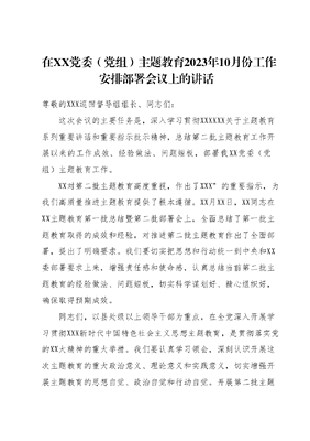 在XX党委(党组)主题教育2023年10月份工作安排部署会议上的讲话尊敬的XXX巡回督导组组长、同志们:这次会议的主要任务是,深入学习贯彻XXXXXX关于主题教育系列重要讲话和重要指示批示精神,总结第二批主题教育工作开展以来的工作成效、经验做法、问题短板,部署我XX党委(党组)主题教育工作。XX对第二批主题教育高度重视,作出了XXX的重要指示,为我们高质量推进主题教育提供了根本遵循。XX月XX日,XX同志在XX主题教育第一批总结暨第二批部署会上,全面总结了第一批主题教育取得的成效和经验,对推进第二批主题教育作出了全面部署,提出了明确要求。我们要切实把思想和行动统一到中央和XX委部署要求上来,增强责任感和使命感,认真总结当前第二批主题教育的经验做法、问题短板,切实科学谋划好、精心组织好,确保取得预期成效。同志们,以县处级以上领导干部为重点,在全党深入开展学习贯彻XXX新时代中国特色社会主义思想主题教育,是贯彻落实党的XX大精神的重大举措。我们要认真学习领会,深刻认识开展这次主题教育的重大政治意义、理论意义和实践意义,切实增强开展主题教育的思想自觉、政治自觉和行动自觉。开展第二批主题教育,总的目标要求和第一批是一致的。我们要对标对表,深入学习深刻领会,切实做到学懂弄通、全面把握。一是要坚持紧扣主题教育的主题主线,深刻领会牢牢把握总要求。学思想、强党性、重实践、建新功是一个紧密联系、相互贯通、内在统一的整体,必须结合实际把这一总要求贯穿到主题教育全过程。我们要聚焦学思想,坚持全面学、专题学重点学,全面把握XXX新时代中国特色社会主义思想的世界观、方法论,以及贯穿其中的立场观点方法,真正做到内化于心、外化于行。要聚焦强党性,着力把悟原理、求真理、明事理统一起来,更加深刻感悟这一重要思想的真理力量、实践力量、人格力量,不断夯实理想信念的坚实根基。要聚焦重实践,自觉用这一重要思想指导解决经济社会发展和党的建设中存在的各种矛盾问题,全力推动XXXX高质量发展实现新跨越。要聚焦建新功,努力从党的创新理论中汲取奋发进取的智慧和力量,熟练掌握其中蕴含的领导方法、思想方法、工作方法,更加有力有效推进各项重点工作,努力作出新的更大贡献。二是要坚持围绕主题教育的路径任务,深刻领会牢牢把握丰富内涵。我们要深入学习领会,将其同推动工作联系起来把握、统筹起来推进、贯通起来落实。要围绕以学铸魂,着力在深化、内化、转化上持续用力,在正本清源、固本培元上下足功夫不断增进对党的创新理论的政治认同、思想认同、理论认同、情感认同。要围绕以学增智,努力在学深学透真信笃行中提升政治能力,在深刻把握立场观点方法中提升思维能力,在联系实际转化运用中提升实践能力,切实增强能力本领。要围绕以学正风,着力通过大兴务实之风深入研究问题破解难题,通过弘扬清廉之风树牢正确的权力观,通过涵养俭朴之风坚定道德操守努力维护良好的社会风气。要围绕以学促干,进一步树牢正确政绩观,鼓足干事创业的精气神,真抓实干、知难而进,以新气象新作为推动高质量发展取得新成效。三是要坚持聚焦主题教育的目标要求,要深刻领会牢牢把握目标要求。要围绕凝心铸魂筑牢根本,教育引导全XX党委(党组)党员干部自觉经受思想淬炼、精神洗礼,始终坚定中国特色社会主义道路自信、理论自信、制度自信、文化自信,增强对党的价值追求和前进方向的高度政治认同。要围绕锤炼品格强化忠诚,教育引导全XX党委(党组)党员干部把对XXX的感恩之心转化为忠诚之志、维护之行、奋进之力,始终忠诚于党、忠诚于人民、忠诚于马克思主义。要围绕实干担当促进发展,教育引导全XX党委(党组)党员干部以闯的干劲、抢的状态、干的激情,一步一个脚印把谋定的蓝图变成美好现实要围绕践行宗旨为民造福,教育引导全XX党委(党组)党员干部牢固树立以人民为中心的发展思想,着力解决好群众关心关注的民生问题,让群众在高质量发展中共享高品质生活。要围绕廉洁奉公树立新风,教育引导全XX党委(党组)党员干部以刮骨疗毒的勇气推进党风廉政建设和反腐败斗争,着力巩固向上向好的政治生态。我就讲这几个方面的意见,具体的工作安排严格按照XXX党委(党组)主题教育办的工作提示,高质量有序推进落实。