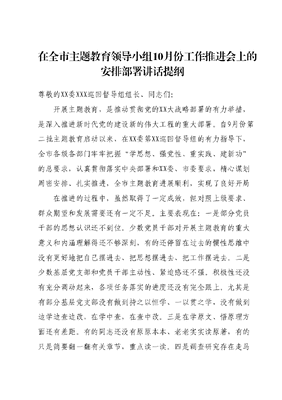 在全市主题教育领导小组10月份工作推进会上的安排部署讲话提纲尊敬的XX委XXX巡回督导组组长、同志们:开展主题教育,是推动贯彻党的XX大战略部署的有力举措,是深入推进新时代党的建设新的伟大工程的重大部署。自9月份第二批主题教育启动以来,在XX委第XX巡回督导组的有力指导下,全市各级各部门牢牢把握学思想、强党性、重实践、建新功的总要求,认真贯彻落实中央部署和XX委、市委要求,精心谋划周密安排、扎实推进,全市主题教育进展顺利,实现了良好开局在推进的过程中,虽然取得了一定成效,但对照上级要求、群众期望和发展需要还有一定不足。主要表现在:一是部分党员干部的思想认识还不到位。少数党员干部对开展主题教育的重大意义和内涵理解得还不够深刻,有的还停留在过去的惯性思维中没有更好地把自己摆进去、把思想摆进去、把工作摆进去。二是少数基层党支部和党员干部主动性、紧迫感还不强。积极性还没有充分调动起来,各项任务落实的进度还没有完全跟上。尤其是有部分基层党支部没有做到持之以恒学、一以贯之学,没有做到边学边查边改,在学中查,在查中改。三是在学原文、悟原理方面还有差距。有的同志还没有原原本本、老老实实读原著,有的只是简要翻一翻有关章节,重点读一读。四是调查研究存在走马观花、流于形式。部分党员干部的调查研究没有结合重点工作和分管工作,精准制定调研课题,实地进行走访,只是泛泛地走一走看一看、写一写。出现以上的这些问题,究其原因,还是思想认识上存在差距谋划部署上存在短板、贯彻执行上存在落差。接下来的工作中,我们一定要紧扣主题主线,全力以赴抓好整改,以整改落实的实际成果成效来检验主题教育的成果成效。结合近期工作重点难点要点,我再强调几点。第一,坚持把主题教育当成当前重要政治任务来深化理解,确保理论学习进一步深化坚持集中学习和个人自学相结合,引导党员干部深学细悟、真信笃行,切实把思想和行动统一到XXXXXX重要讲话精神和中央省市委部署要求上来,以高度的政治自觉、严肃的政治态度、饱满的政治热情,积极投入到主题教育当中来,着力解决在真学真信真用、学懂弄通做实方面存在的问题,教育引导党员干部从思想上正本清源、固本培元,夯实坚定拥护两个确立、坚决做到两个维护的思想根基,不断提高政治判断力、政治领悟力政治执行力,切实推动学习贯彻XXX新时代中国特色社会主义思想走深走实。第二,坚持把主题教育当成破题解难的关键一招来持续发力确保调查研究进一步深入聚焦绿色低碳高质量发展、乡村振兴、改革开放、安全生产全面从严治党、群众急难愁盼等方面深入开展调研,增强科学性针对性、实效性,做好成果转化。特别是要围绕比较优势,打好园区产业研究牌,切实发挥产业基础丰厚、交通运输便捷、干部队伍完备等多方面优势,进一步理清工作思路,进一步挖掘现有土地、厂房等闲置资源,深入研究政策红利,不断推动绿色低碳高质量发展实践基地和乡村振兴示范区建设。同时,突出规划引领发展,学习借鉴其他工业园区的先进做法,招引一批龙头型、旗舰型、基地型项目,争创XX级科技孵化器和省级小型微型企业创业创新示范基地,推动全XX工业产业提质增效,促进争先创牌工作取得实效。第三,坚持把主题教育当成推动发展的重要一步来一体推进确保推动发展进一步加力。持续抓好XX聚力突破重点任务落实,扎实办好民生实事,深入开展领导干部大接访活动,全力实现年度目标任务,以高质量发展新成效检验主题教育成果。切实算好综合账、效益账、品质账、便民账,推动新城与中心城区之间通行更加快捷、新城内部交通更加顺畅、新城与XXX城市之间联系更加紧密。要始终坚持问题导向,立足各自资源禀赋,着眼超大城市综合交通体系,紧扣新城功能定位,立足新城长远发展,深化交通体系研究,为新城促进产业发展、加快产城融合、提升门户枢纽功能、提高宜居宜业水平提供有力支撑。同时,坚持把高质量发展的问题整改贯穿主题教育始终,精准查找问题,完善推进机制,实现闭环管理,不断巩固深化检视整改和专项整治成果。第四,坚持把主题教育当成完善体系机制建设的紧迫一环来系统安排,确保组织领导进一步强化。这次主题教育是一件事关全局的大事,时间紧、任务重、要求高,XXXXXX对主题教育各项工作作出全面部署、提出明确要求各级党委(党组)要切实压紧压实责任,加强工作统筹,注重分类施策,强化宣传引导,确保推进有序、取得实效。特别是主要负责同志要切实履行第一责任人职责,亲自谋划、靠前指挥、督促指导,以上率下带头抓好理论学习,带头抓好调查研究,带头抓好问题检视和整改。要把主题教育开展情况作为党委巡察、综合考核、党委(党组)书记抓基层党建工作述职评议考核重要内容。我就讲这么多。谢谢!