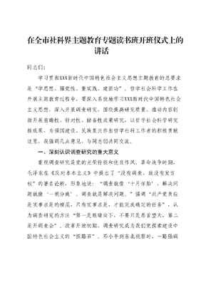 在全市社科界主题教育专题读书班开班仪式上的讲话同志们:学习贯彻XXX新时代中国特色社会主义思想主题教育的总要求是学思想、强党性、重实践、建新功。哲学社会科学工作在开展主题教育过程中,要深入系统地学习XXX新时代中国特色社会主义思想,深入开展调查研究,围绕提高研究质量、推动内容创新开展前瞻性、针对性、储备性政策研究,以哲学社会科学研究新成果,为强国建设、民族复兴作出哲学社科工作者的积极贡献这里,我强调几点意见,与同志们共同交流。一、深刻认识调查研究的重大意义重视调查研究是党的光荣传统和优良作风。革命战争时期,毛泽东在《反对本本主义》中提出了没有调查,就没有发言权的著名论断,形象地说:调查就像十月怀胎,解决问题就像一朝分娩。调查就是解决问题。强调共产党员应是实事求是的模范,只有实事求是,才能完成确定的任务,认为调查研究的方法第一是眼睛向下,不要只是昂首望天,第二是开调查会。改革开放初期,调查研究成为我们党探索建设中国特色社会主义的探路石。邓小平到东北视察时,一路强调要实事求是,搞好建设。江泽民要求县级以上同志,每年至少一两个月深入基层调查研究。胡锦涛强调要通过深入调研不断把握科学发展的主动权。XXXXXX特别重视调查研究工作,在正定工作期间,曾提出每年要有三分之一以上的时间深入基层;在福建,大力倡导信访接待下基层、现场办公下基层、调查研究下基层宣传党的方针政策下基层;在浙江,规定省级和市县领导班子成员,每年分别要有2个月和3个月时间下基层调研,撰写调查研究报告;党的十八大以来,在不同场合反复强调调查研究的重要性,一系列重要讲话和重要指示,为全党大兴调查研究、做好各项工作提供了根本遵循。一百年来,从毛泽东提出没有调查,没有发言权的重大命题,到XXXXXX作出调查研究是我们党的传家宝,是做好各项工作的基本功的深刻论断,经过党的大力倡导和党的领导人率先垂范,重视调查研究成为党的优良传统和作风。改革开放和社会主义现代化建设事业,正是在调查研究中一步步向前推进的。二、紧紧围绕全面贯彻落实党的XX大精神、推动高质量发展开展调查研究中共中央办公厅印发《关于在全党大兴调查研究的工作方案》强调,在全党大兴调查研究,要紧紧围绕全面贯彻落实党的XX大精神、推动高质量发展,直奔问题去,实行问题大梳理、难题大排查,着力打通贯彻执行中的堵点瘀点难点,并提出了12个方面的调研内容。对于哲学社会科学研究来说,主要把握以下方面:意识形态领域面临的挑战,推进文化自信自强、建设社会主义文化强国和新闻舆论引导、网络综合治理中的主要情况和重点问题;建设法治社会相关问题;推进共同富裕、增进民生福祉中的重大问题,巩固拓展脱贫攻坚成果、缩小城乡区域发展差距和收入分配差距的主要情况和重点问题;人民最关心最直接最现实的利益问题,特别是就业、教育、医疗、托育、养老、住房等群众急难愁盼的具体问题;牢固树立和践行绿水青山就是金山银山理念方面的差距和不足,推进美丽中国建设、保护生态环境和维护生态安全中的主要情况和重点问题;维护社会稳定中的重大问题,防灾减灾救灾和重大突发公共事件处置保障短板,处理新形势下人民内部矛盾和强化社会治安整体防控的主要情况和重点问题。三、系统掌握和综合运用调查研究的方式方法系统掌握和综合运用五个思维。一是群众思维。XXXXXX指出:不论过去、现在和将来,我们都要坚持一切为了群众,一切依靠群众,从群众中来,到群众中去,把党的正确主张变为群众的自觉行动,把群众路线贯彻到治国理政全部活动之中。二是实事求是。XXXXXX指出:实践反复证明,能不能做到实事求是,是党和国家各项工作成败的关键。三是问题思维。XXXXXX强调:党的十八大以来,党和国家事业取得历史性成就发生历史性变革,其中一条很重要的经验就是坚持问题导向。四是攻坚克难。XXXXXX指出:调查研究就像十月怀胎,决策就像一朝分娩。五是系统观念。XXXXXX指出:万事万物是相互联系、相互依存的。只有用普遍联系的、全面系统的、发展变化的观点观察事物,才能把握事物发展规律。系统掌握和综合运用五字诀。XXXXXX提出做好调查研究工作的五字诀,即深、实、细、准、效。深,就是要深入群众,深入基层,善于与工人、农民、知识分子和社会各界人士交朋友到田间、厂矿、群众和社会各层面去解决问题。实,就是作风要实,做到轻车简从,简化公务接待,真正做到听实话、摸实情、办实事。细,就是要认真听取各方面的意见,深入分析问题,全面掌握情况。准,就是不仅要全面深入细致地了解实际情况,更要善于分析矛盾、发现问题,透过现象看本质,把握规律性的东西。效,就是提出解决问题的办法要切实可行制定的政策措施要有较强操作性,做到出实招,见实效。XXXXXX强调